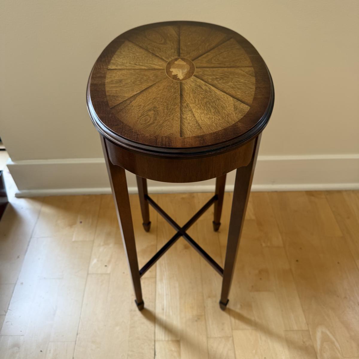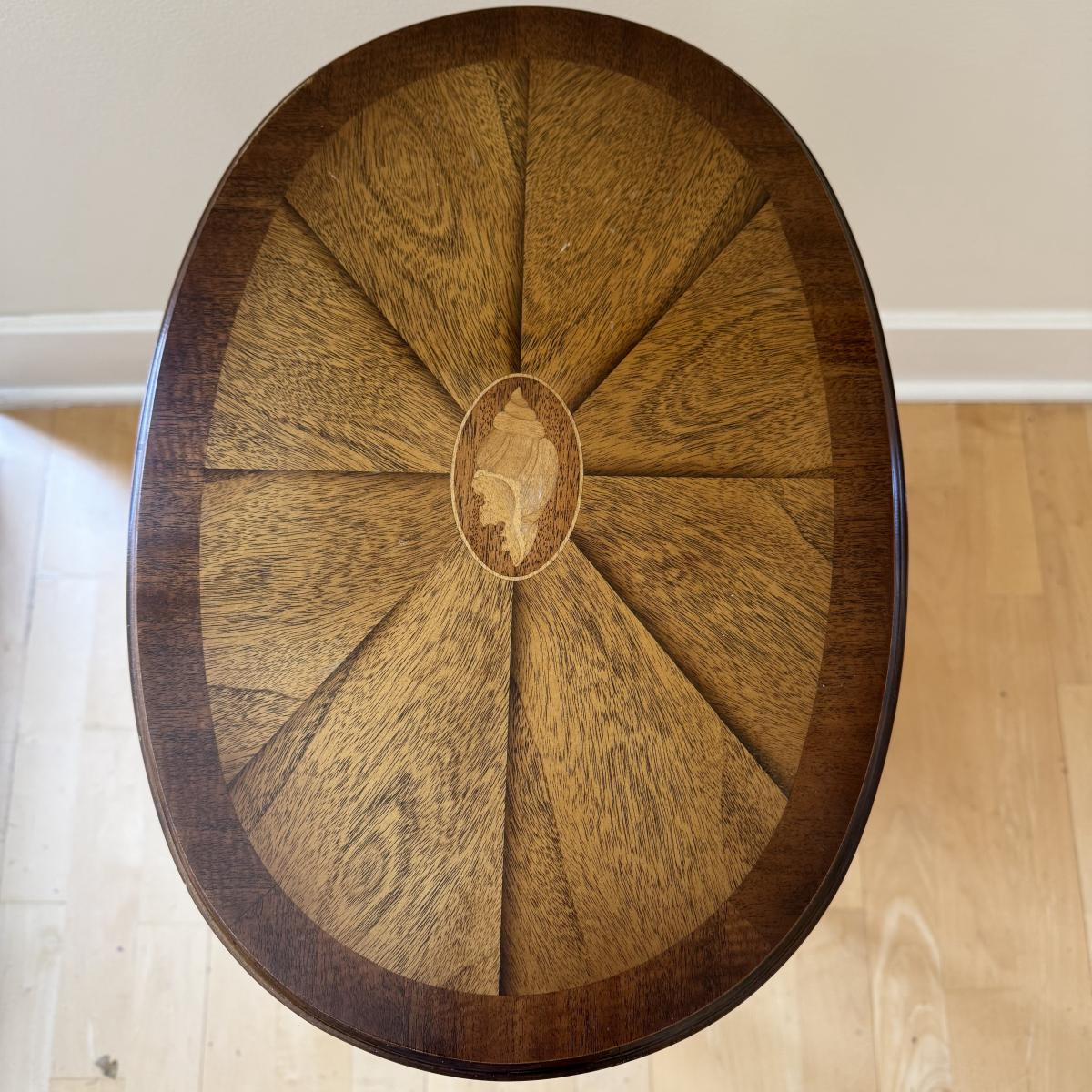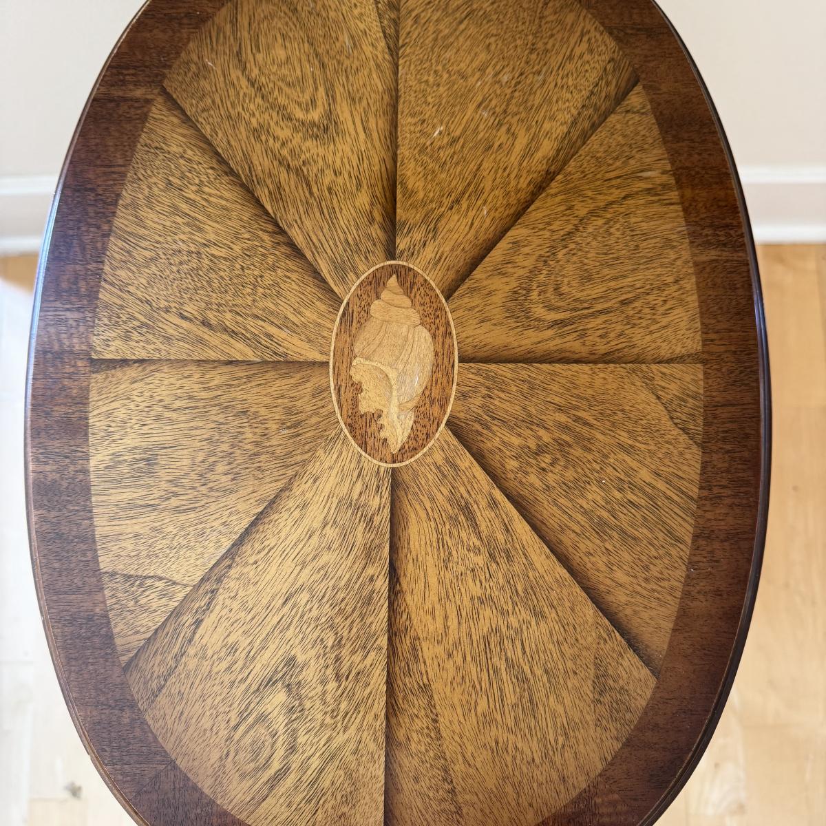 This lot contains what appears to be a mahogany wood oval side table with an intricate seashell center inlay. This item measures 11.75” x 17” x 24.5”H. This table is lightweight and striking. Local pick up only.