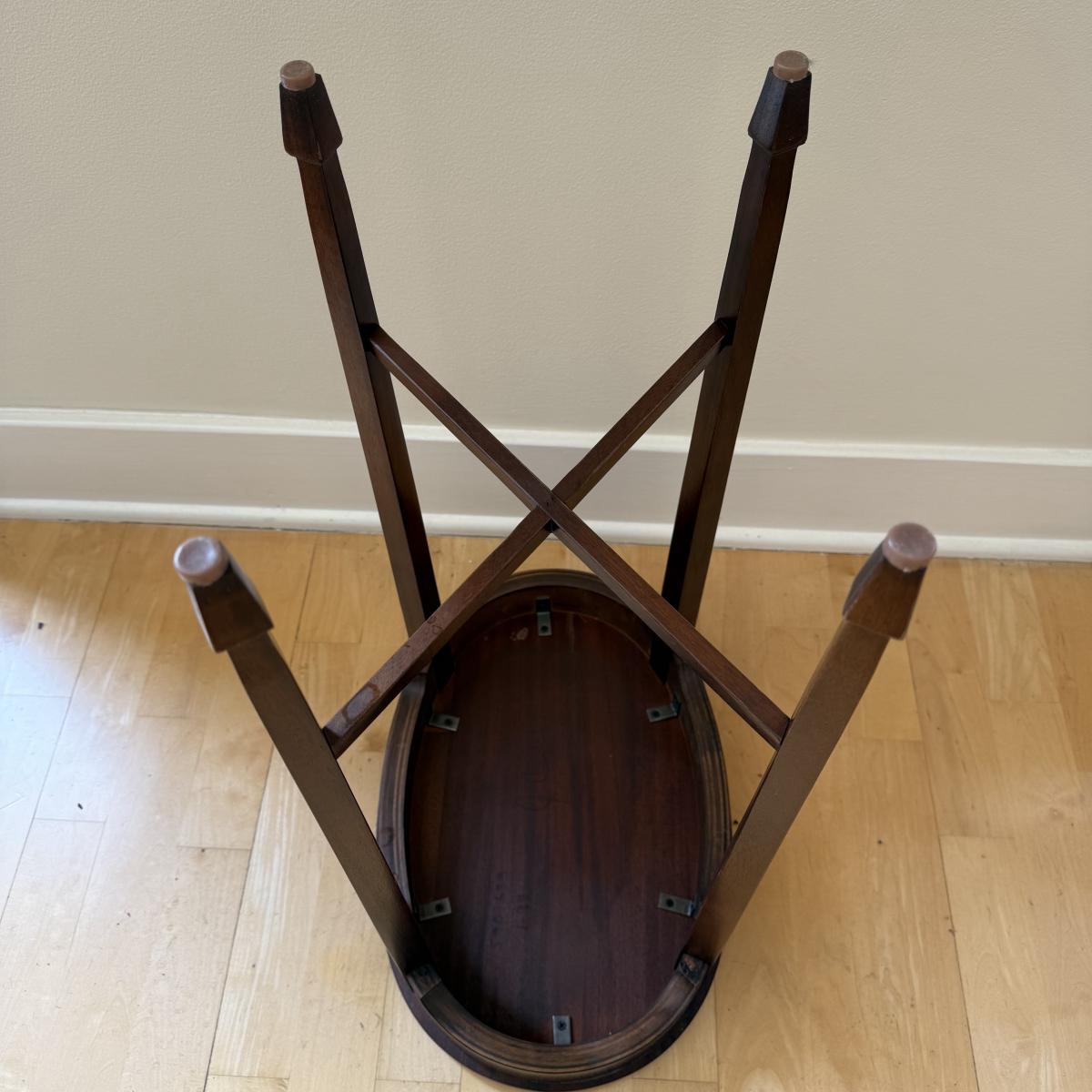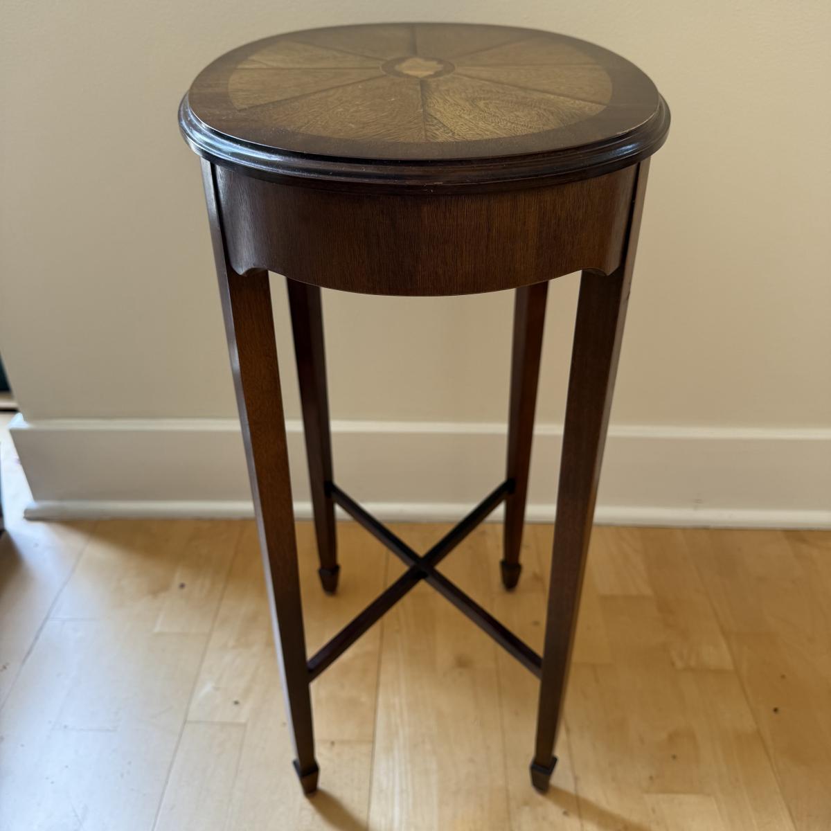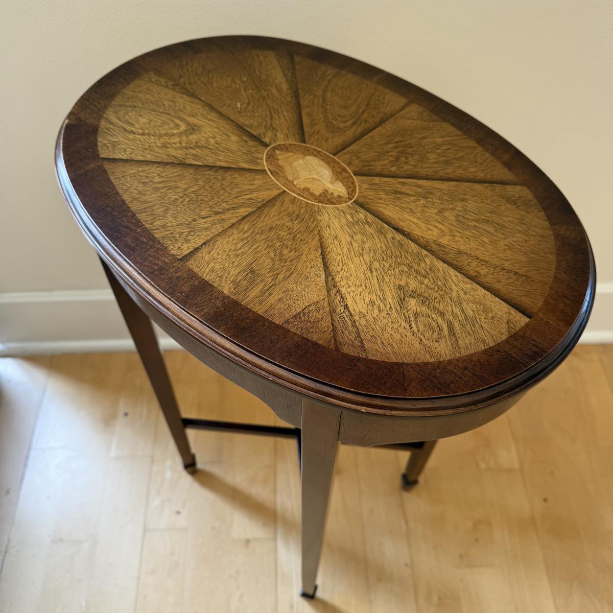 This lot contains what appears to be a mahogany wood oval side table with an intricate seashell center inlay. This item measures 11.75” x 17” x 24.5”H. This table is lightweight and striking. Local pick up only.