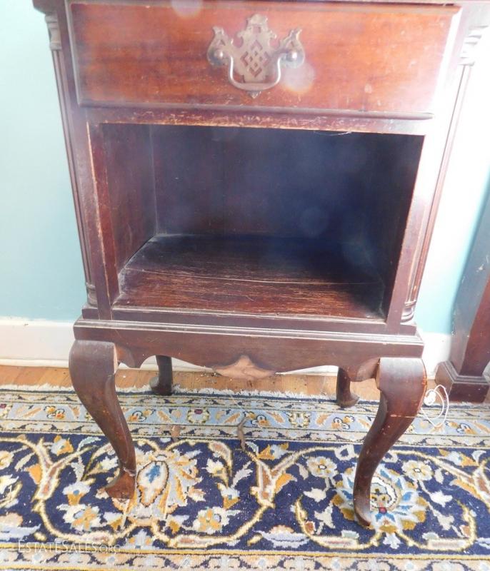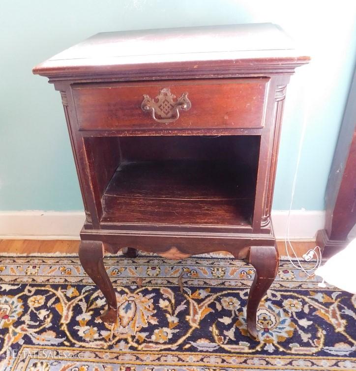 Mahogany single drawer side table matches dresser and highboy. Some condition issues on feet but pieces available for repair.