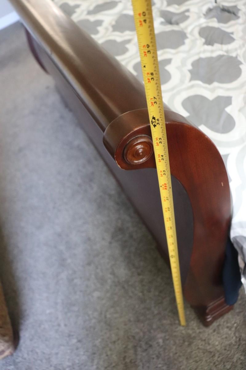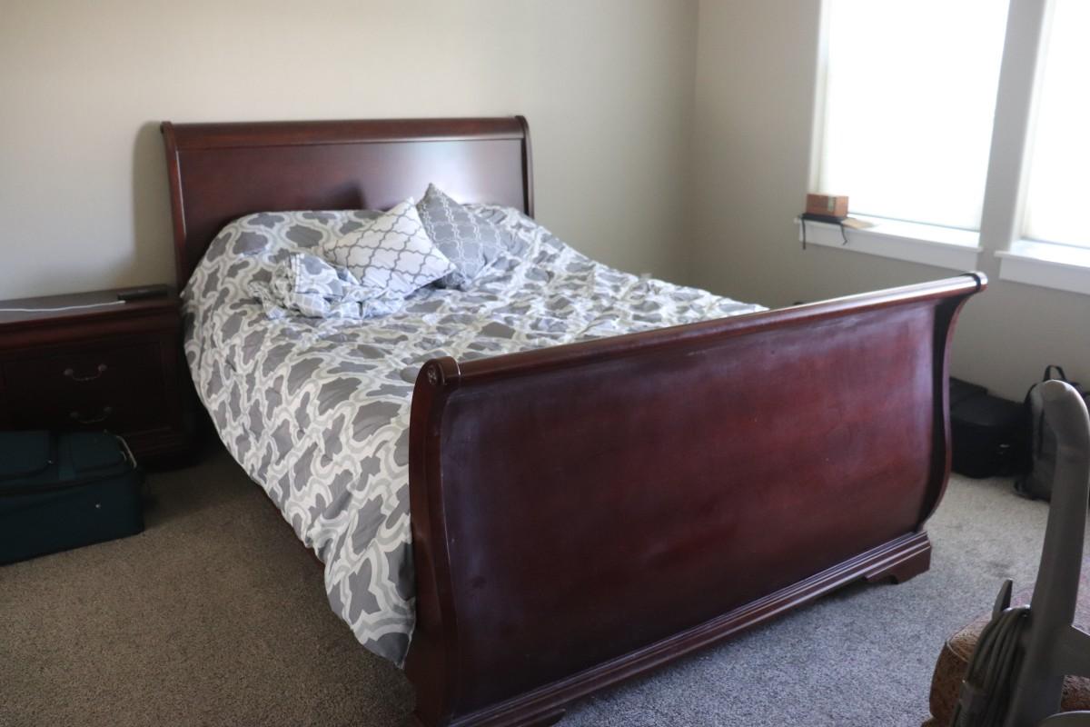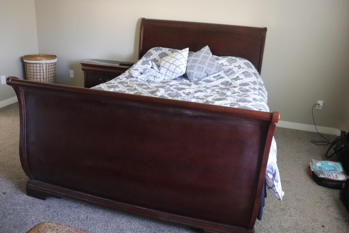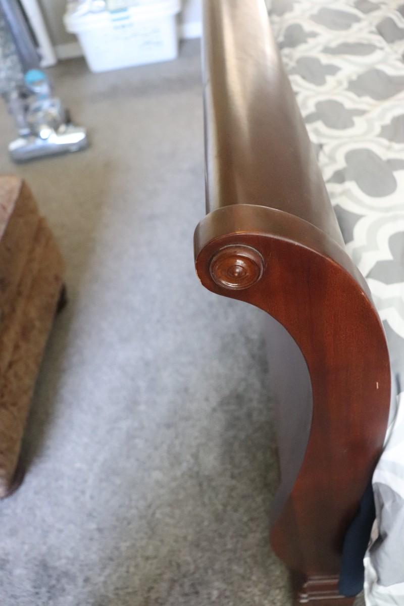 This lot features a beautiful mahogany sleigh bed in a queen size, complete with a comfortable mattress and an elegant bedspread. The classic design of the sleigh bed adds a touch of sophistication and warmth to any bedroom decor. The sturdy mahogany construction ensures durability and longevity, while the included mattress provides a restful sleeping experience. The coordinating bedspread enhances the overall aesthetic, making this set not only functional but also a stylish focal point in your bedroom. Perfect for those looking to elevate their sleeping space!