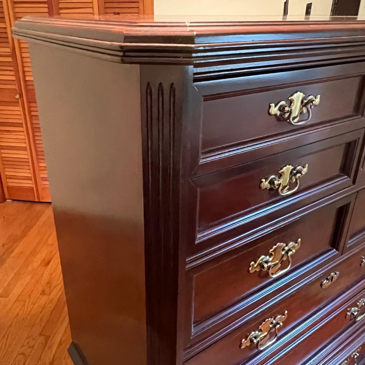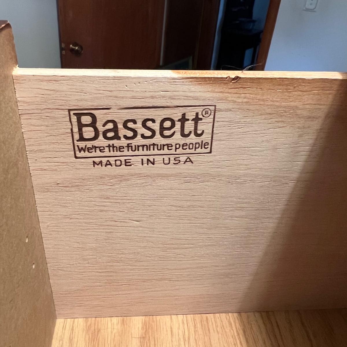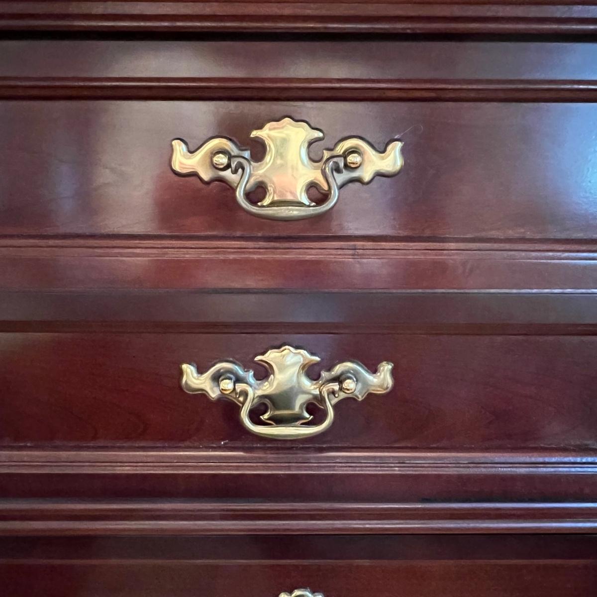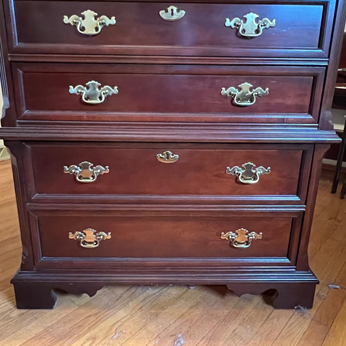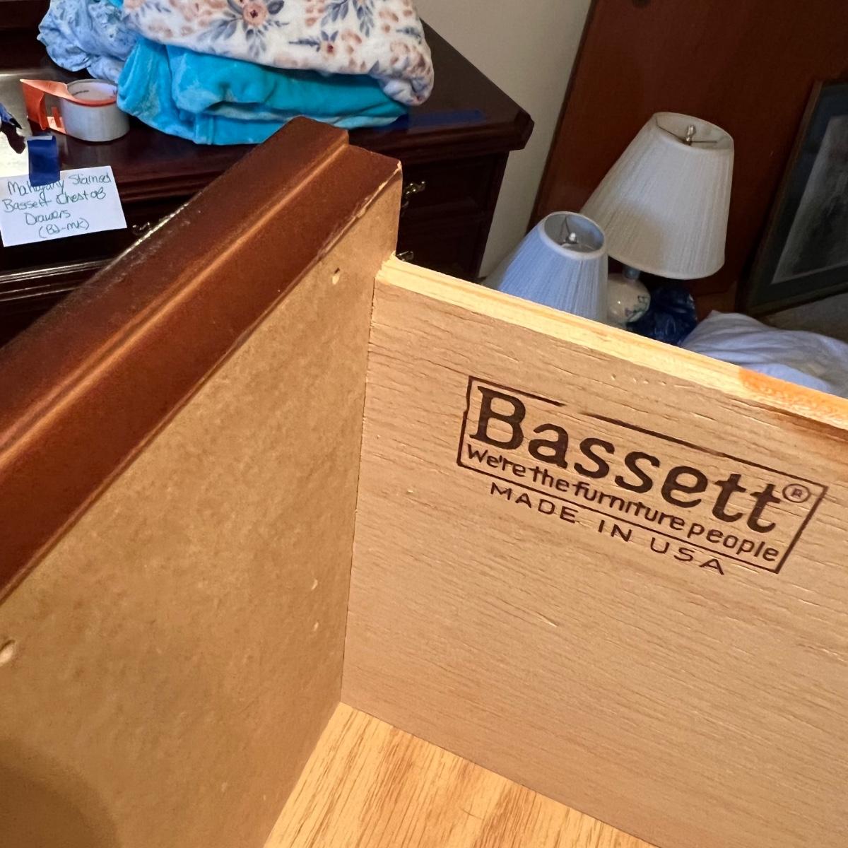 Lovely tall Bassett mahogany stain solid wood chest of drawers. The chest has six drawers as shown in the photographs. All hardware appears to be brass. The two “keyholes” are solely decorative and non-functional. The chest appears to be in excellent condition with no nicks or breaks in the stain finish. It measures 40” x 19.5” x 58.5". Dovetail drawer joins as shown. Local pickup only. Winning bidder must bring assistance to help move and load this item due to its weight and/or size.