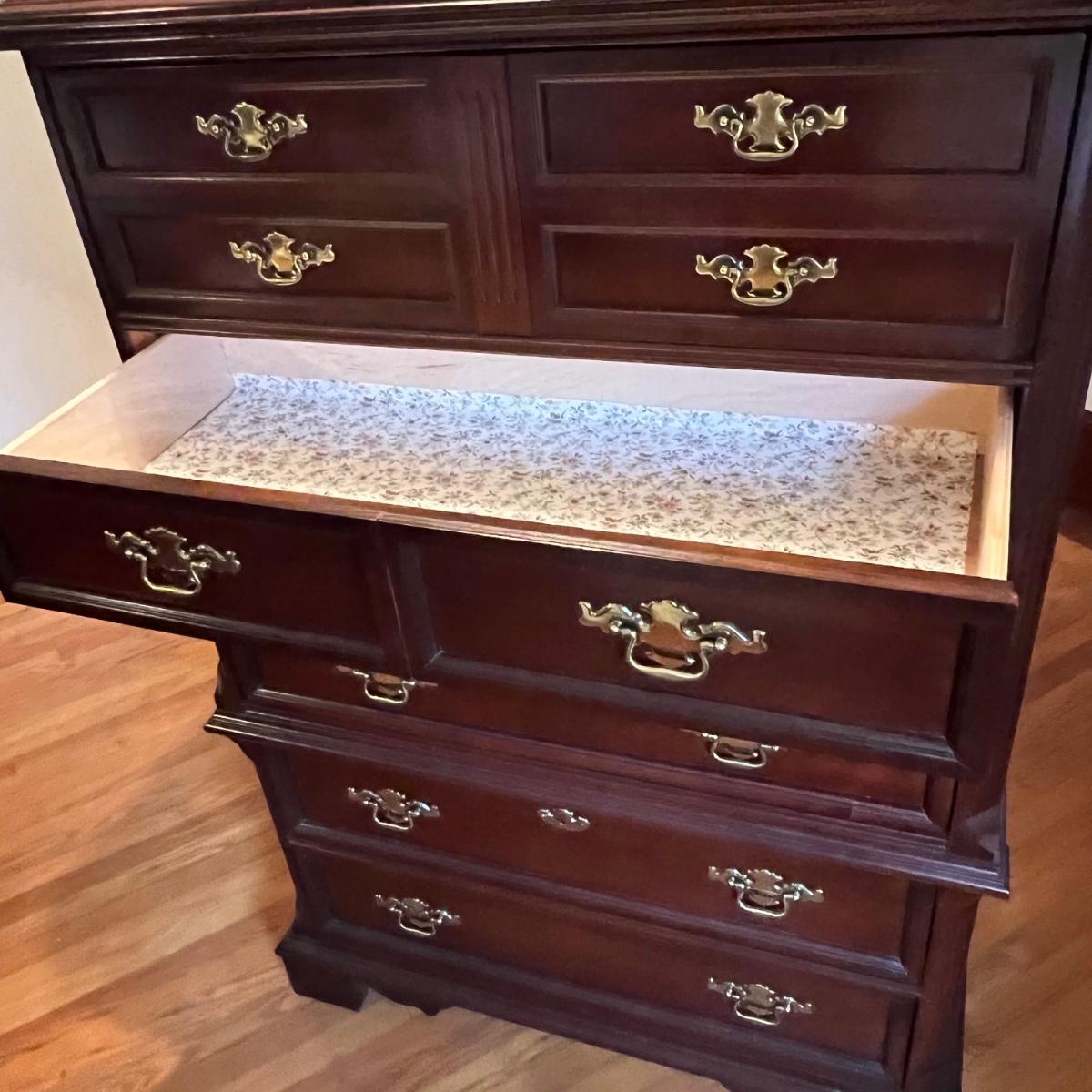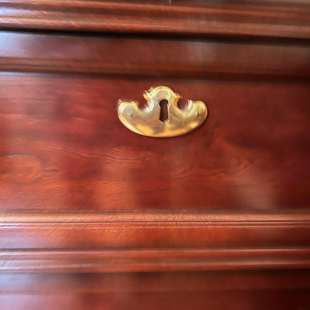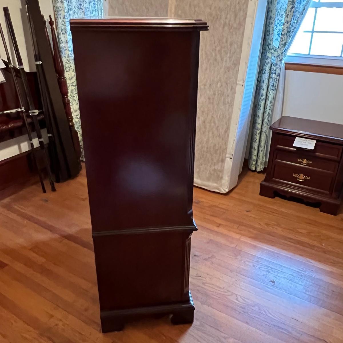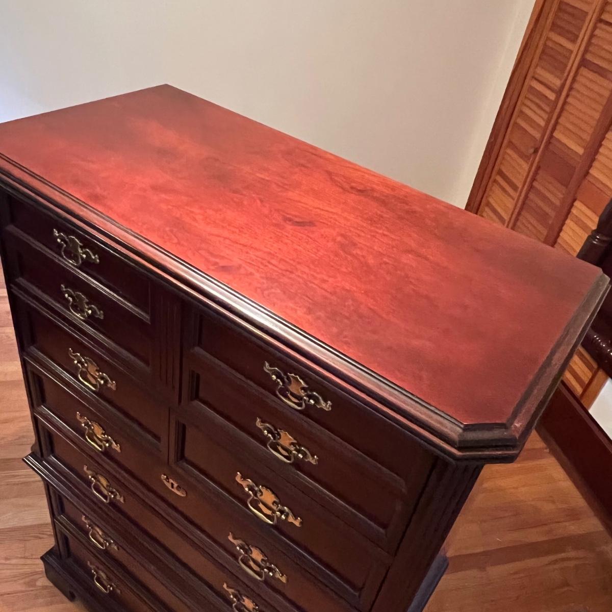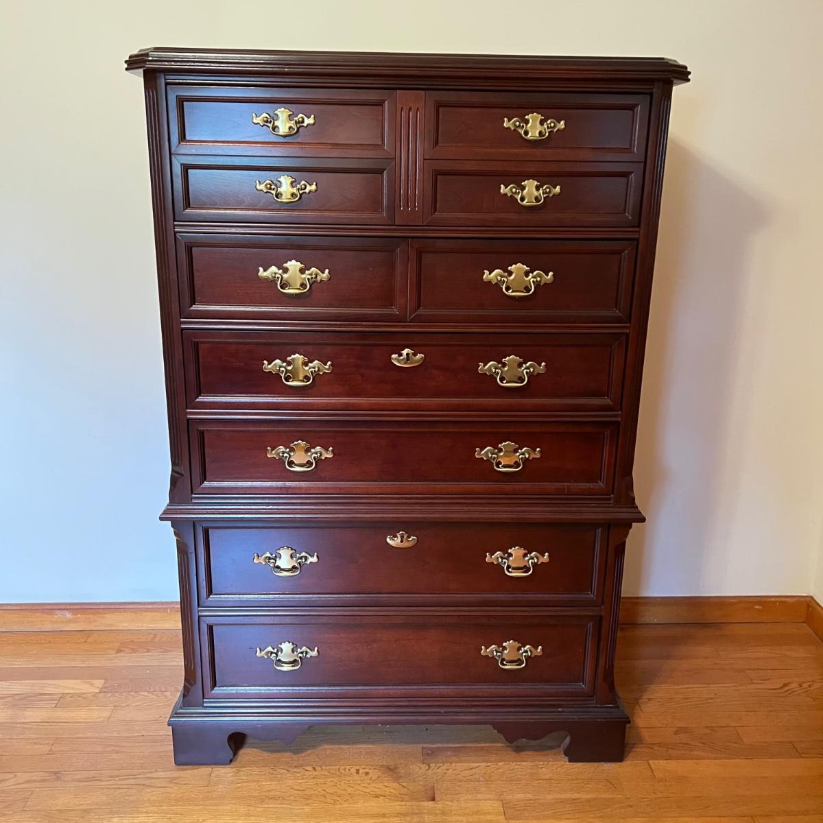 Lovely tall Bassett mahogany stain solid wood chest of drawers. The chest has six drawers as shown in the photographs. All hardware appears to be brass. The two “keyholes” are solely decorative and non-functional. The chest appears to be in excellent condition with no nicks or breaks in the stain finish. It measures 40” x 19.5” x 58.5". Dovetail drawer joins as shown. Local pickup only. Winning bidder must bring assistance to help move and load this item due to its weight and/or size.