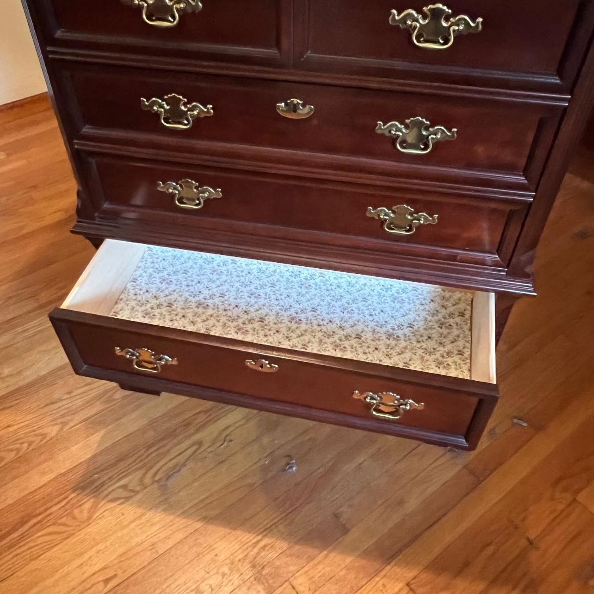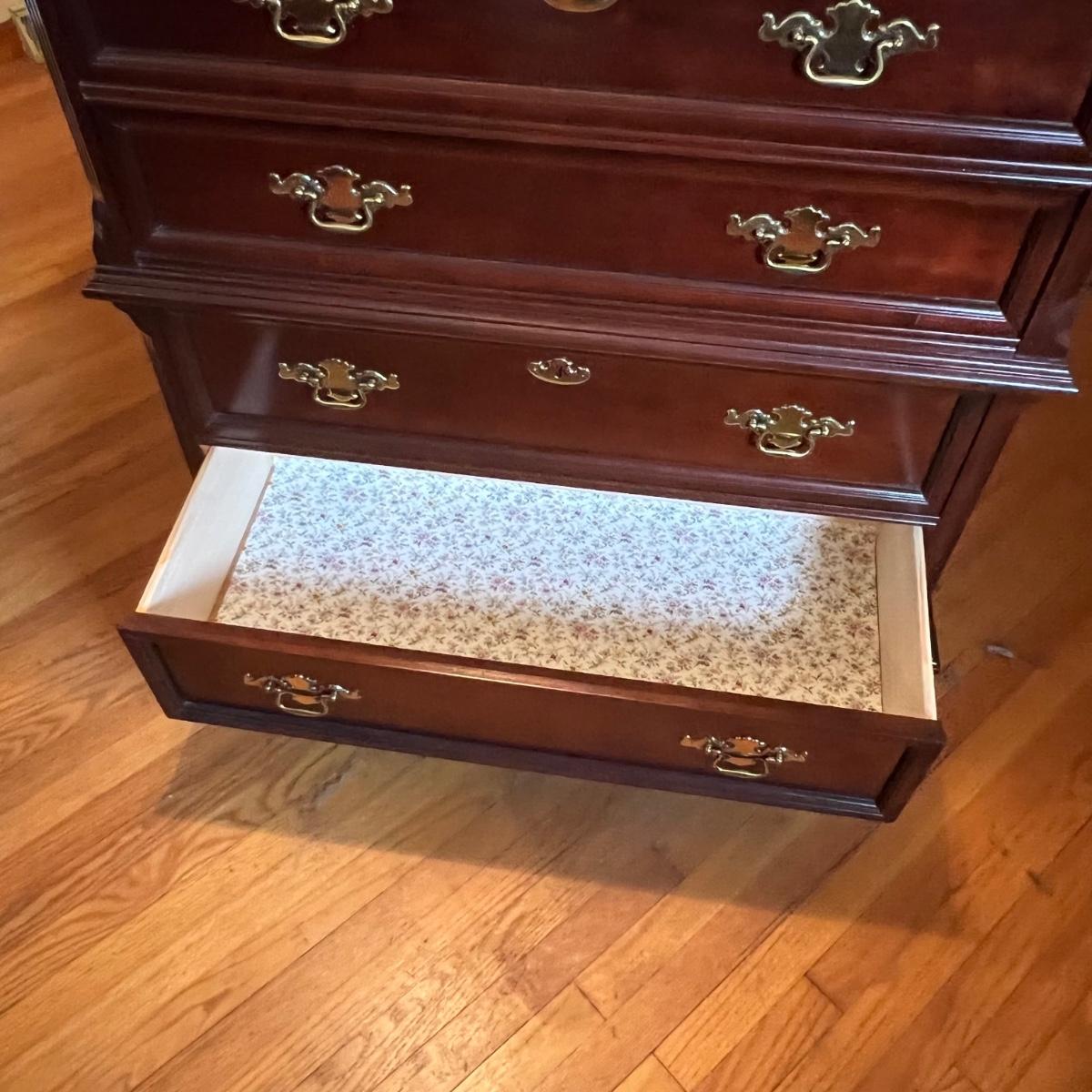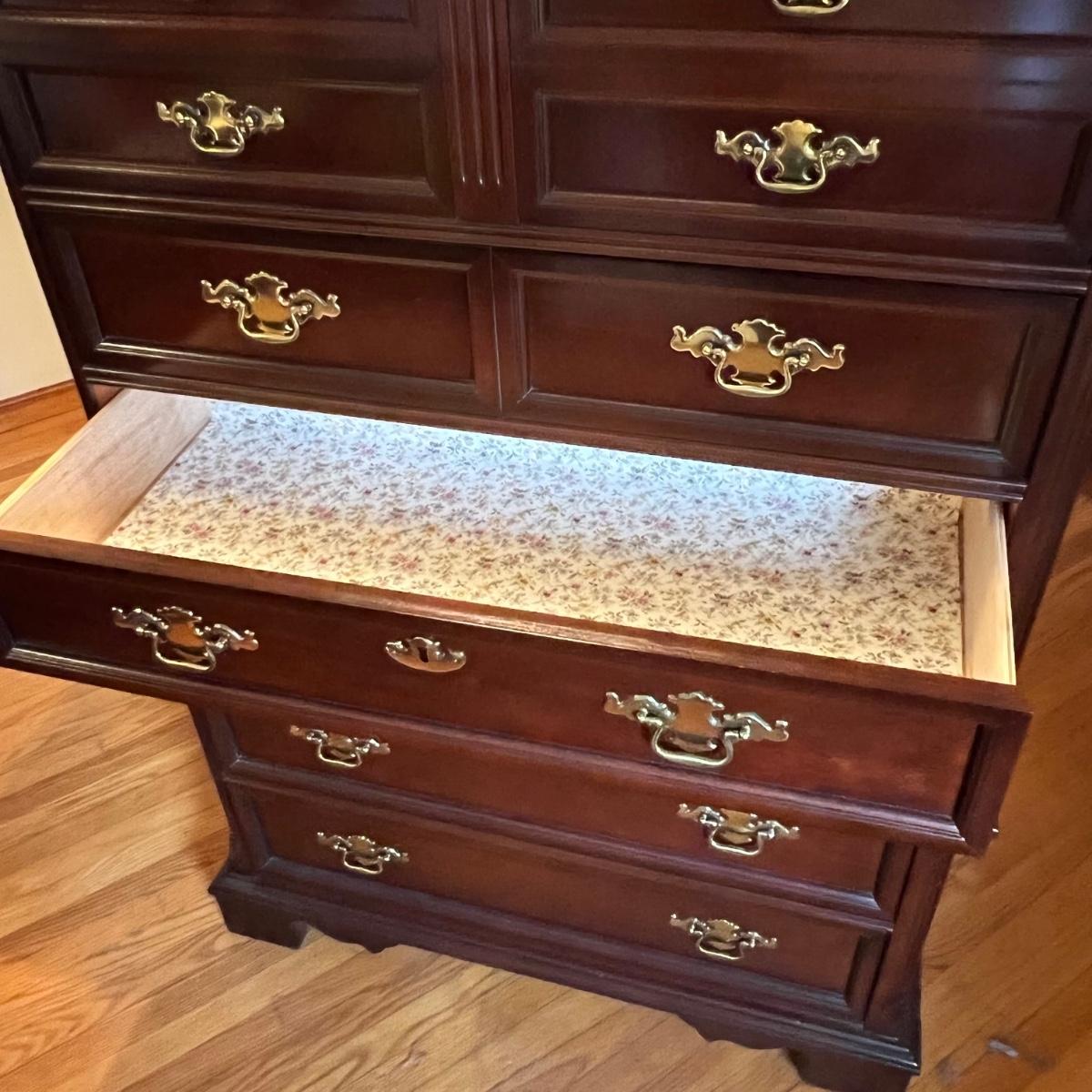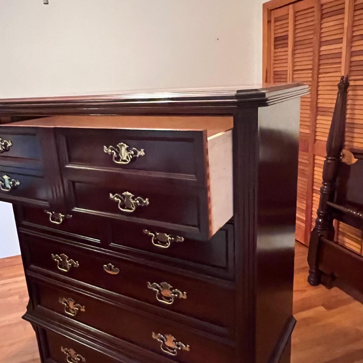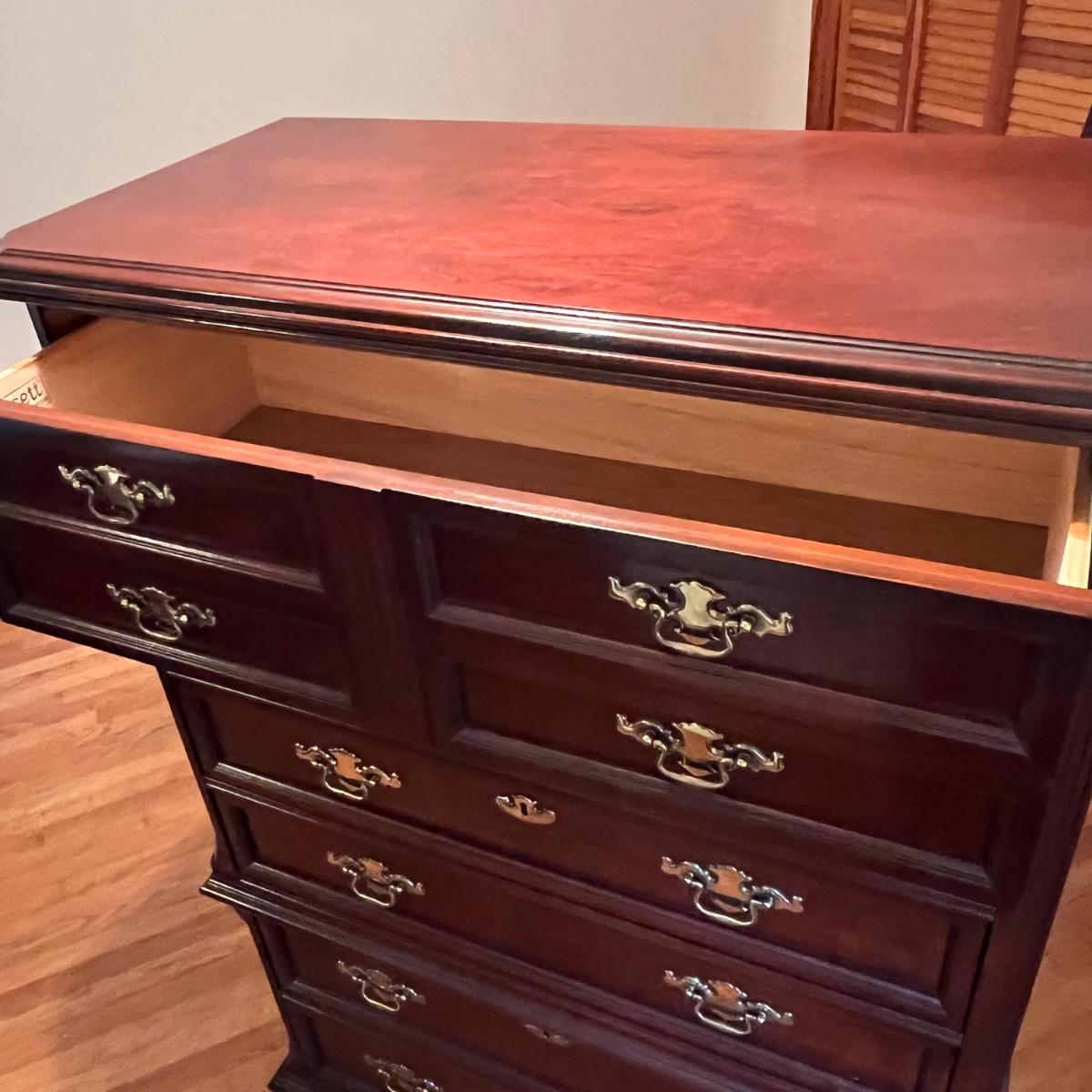 Lovely tall Bassett mahogany stain solid wood chest of drawers. The chest has six drawers as shown in the photographs. All hardware appears to be brass. The two “keyholes” are solely decorative and non-functional. The chest appears to be in excellent condition with no nicks or breaks in the stain finish. It measures 40” x 19.5” x 58.5". Dovetail drawer joins as shown. Local pickup only. Winning bidder must bring assistance to help move and load this item due to its weight and/or size.