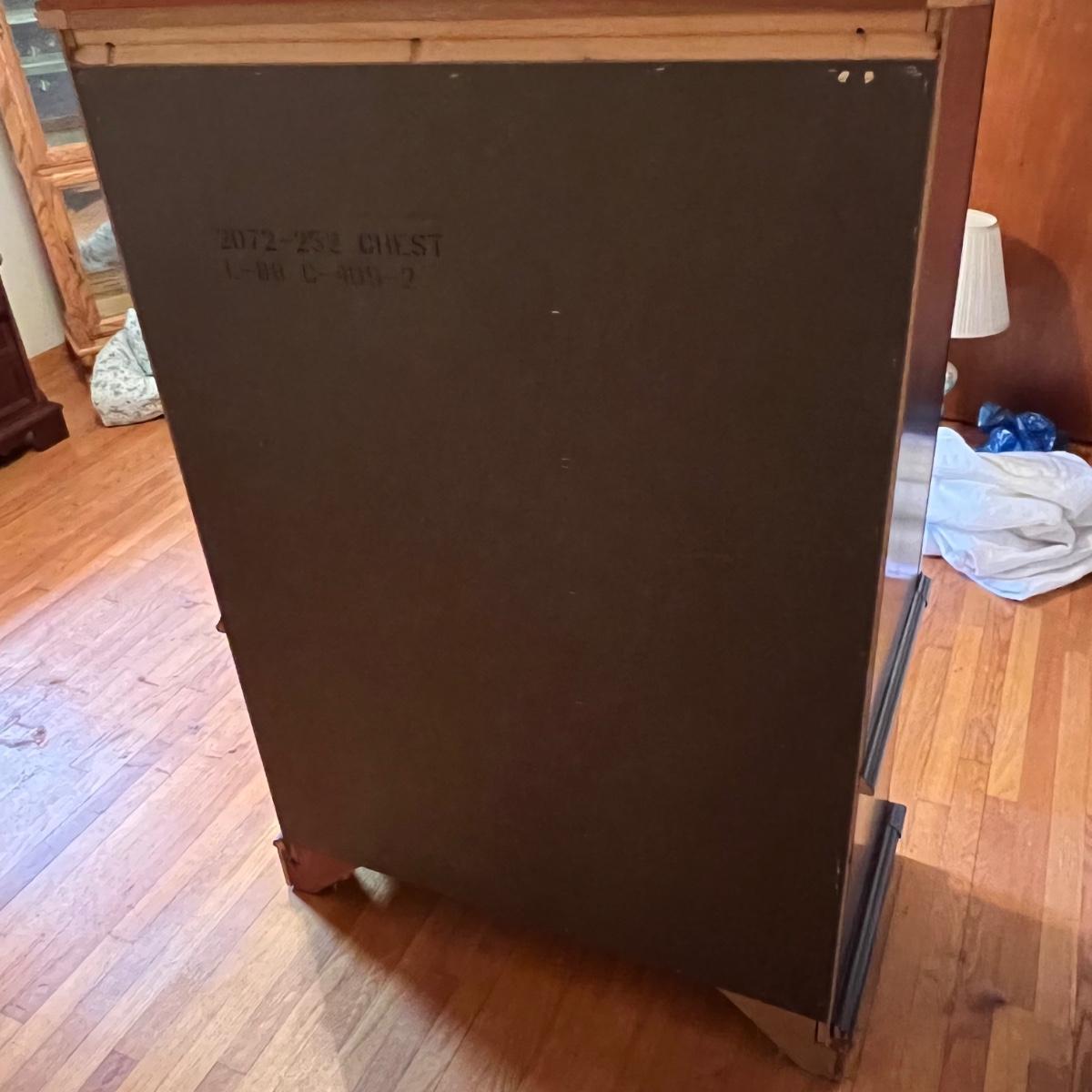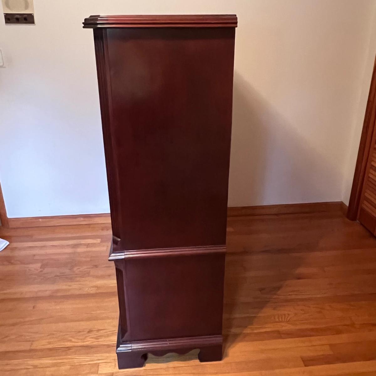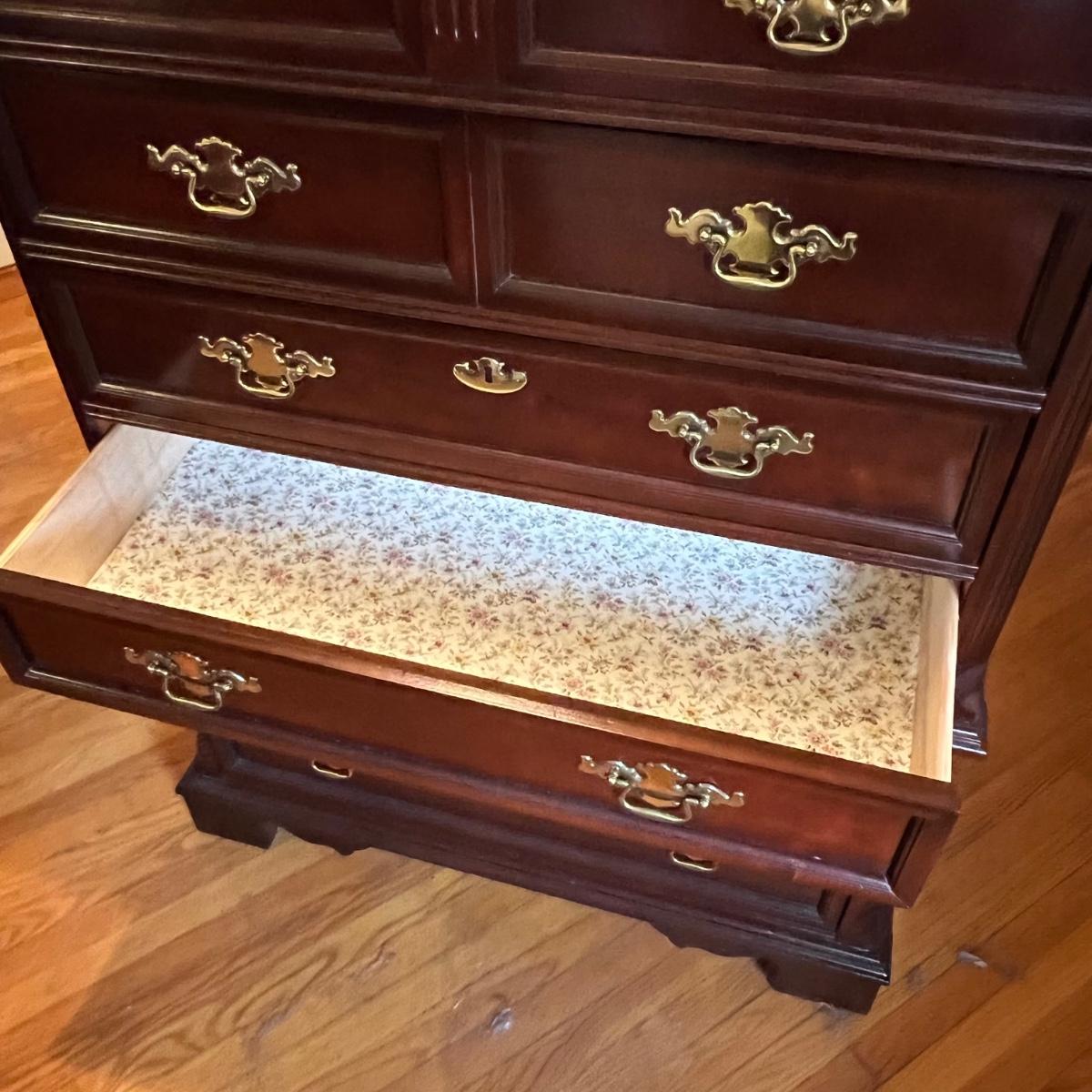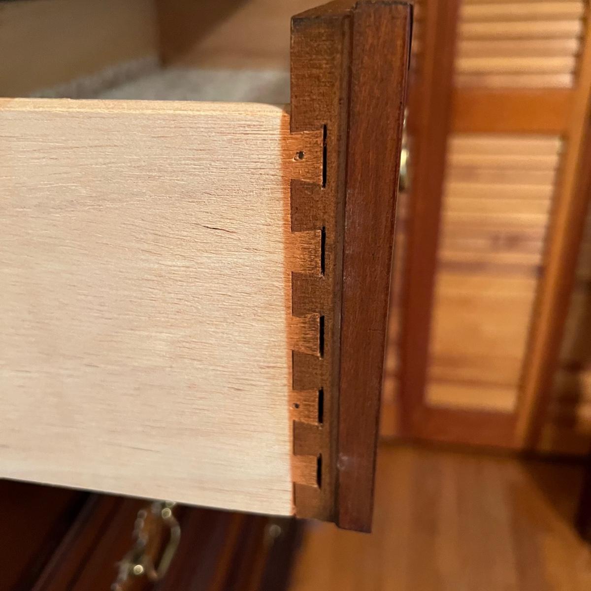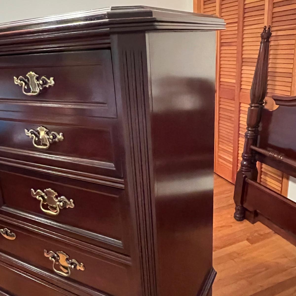 Lovely tall Bassett mahogany stain solid wood chest of drawers. The chest has six drawers as shown in the photographs. All hardware appears to be brass. The two “keyholes” are solely decorative and non-functional. The chest appears to be in excellent condition with no nicks or breaks in the stain finish. It measures 40” x 19.5” x 58.5". Dovetail drawer joins as shown. Local pickup only. Winning bidder must bring assistance to help move and load this item due to its weight and/or size.