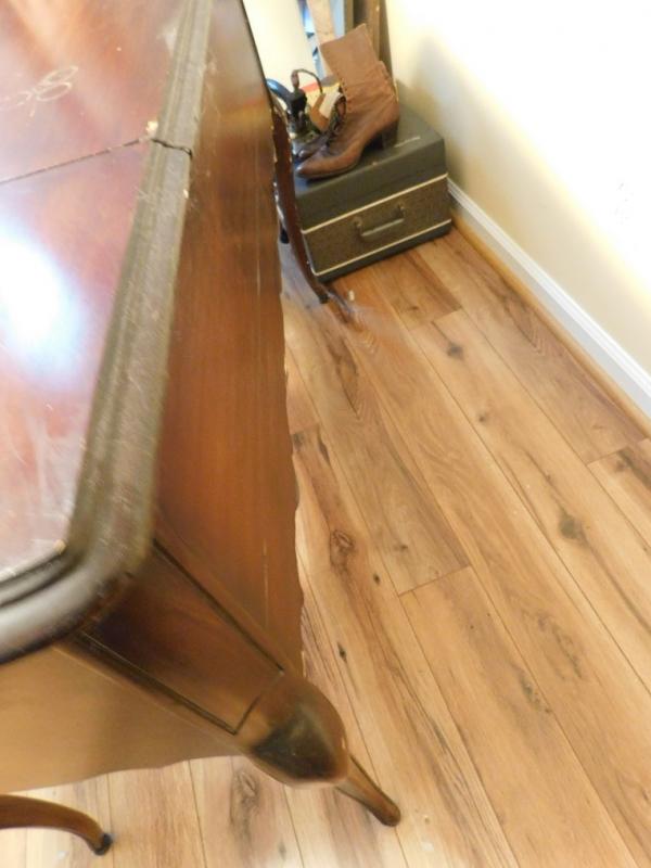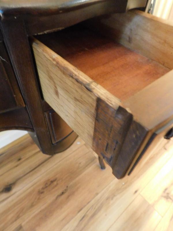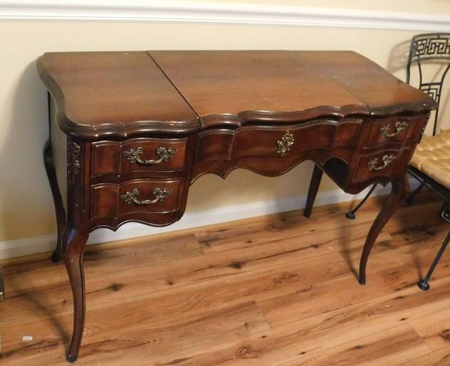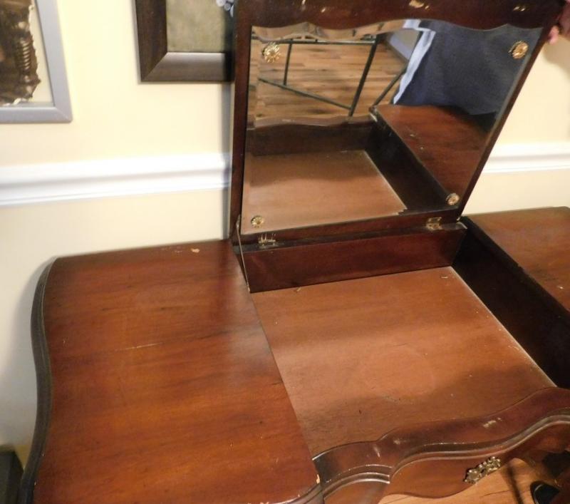 Mahogany Vanity Dressing Table has loose hinge on lid with some scratches and wear to the finish