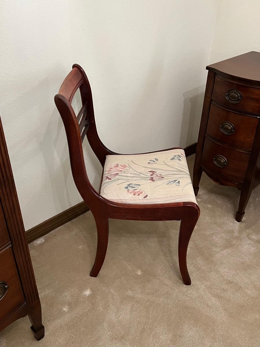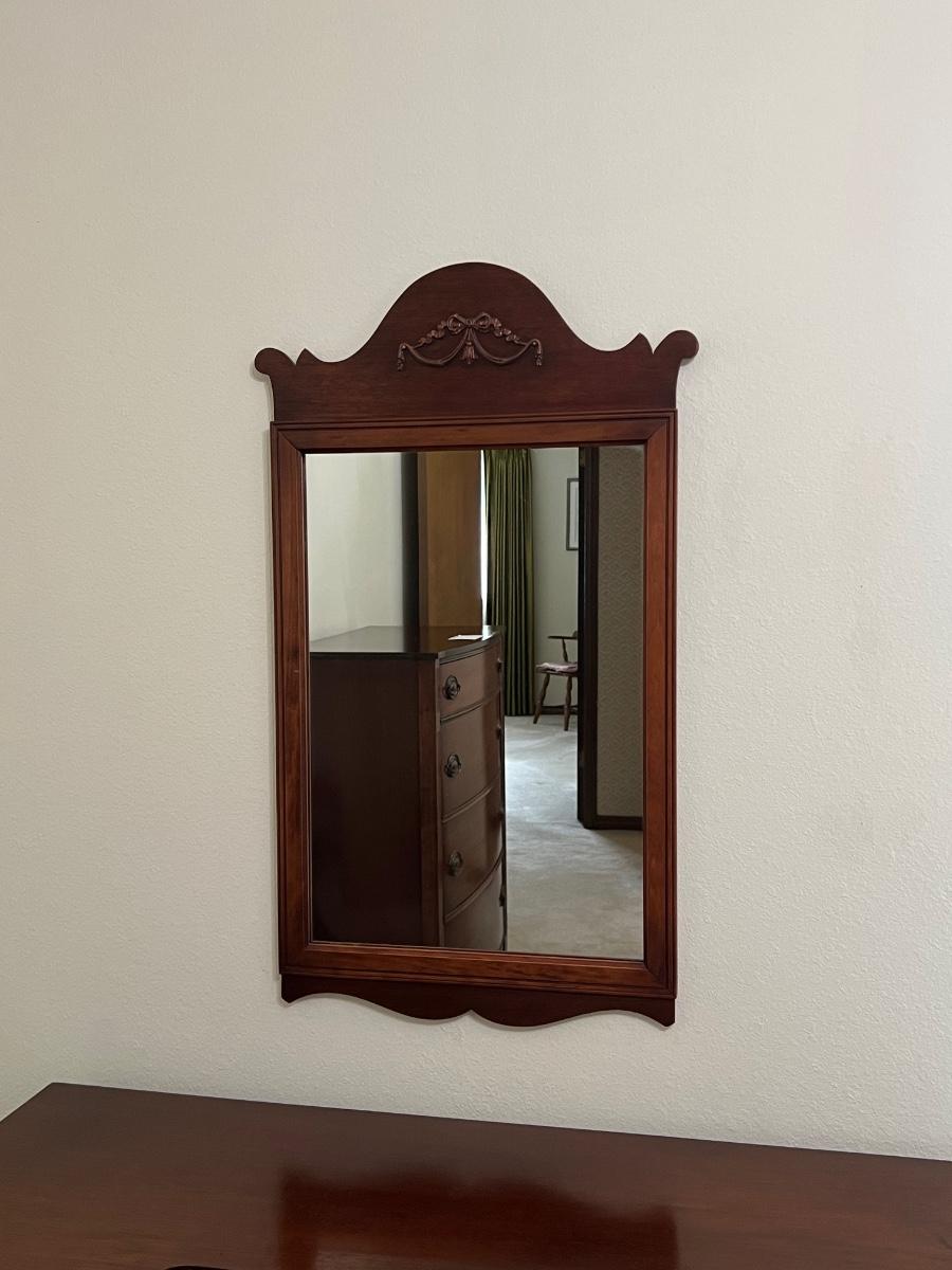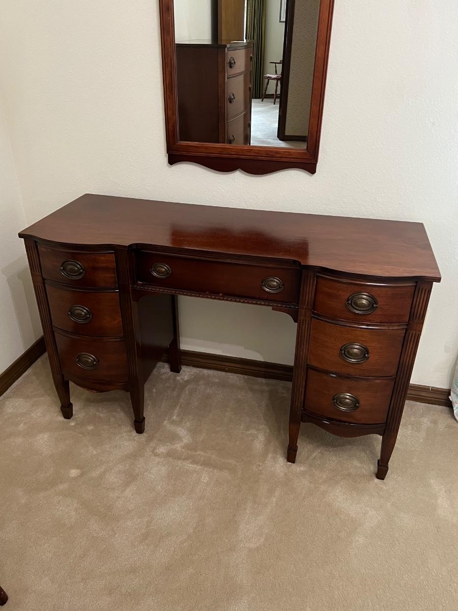 All drawers slide in & out easily. No brand name found. Vanity = 29” H x 47” W x 18” D ~ Mirror = 38” H x 20.5” W ~ Chair = 32” H x 17.5” H x 20” D