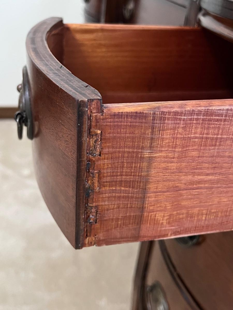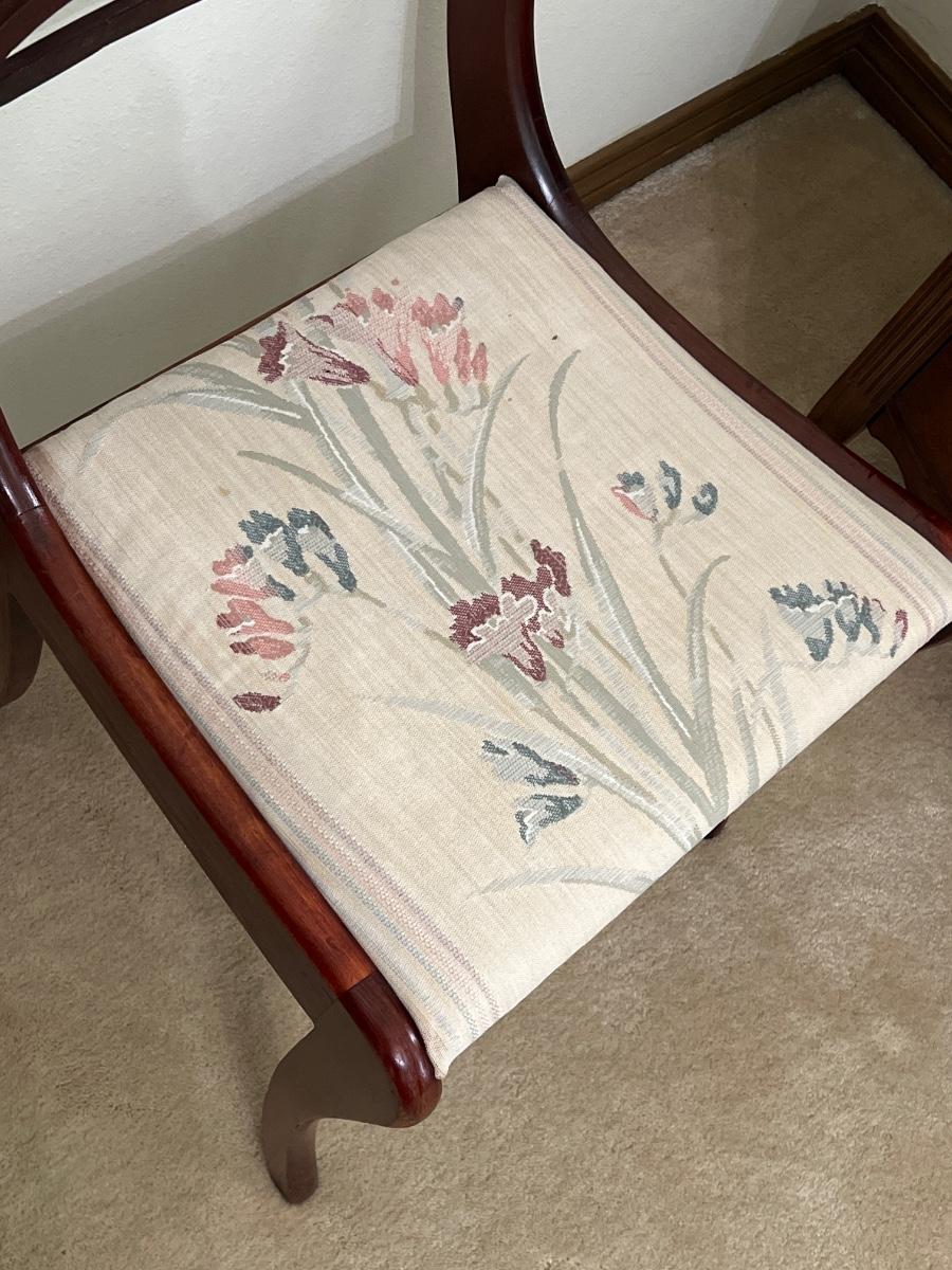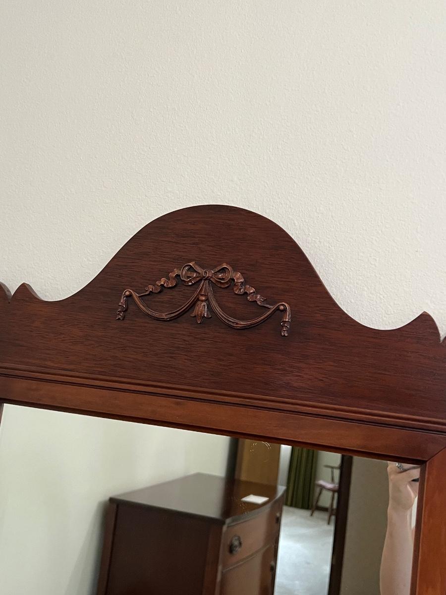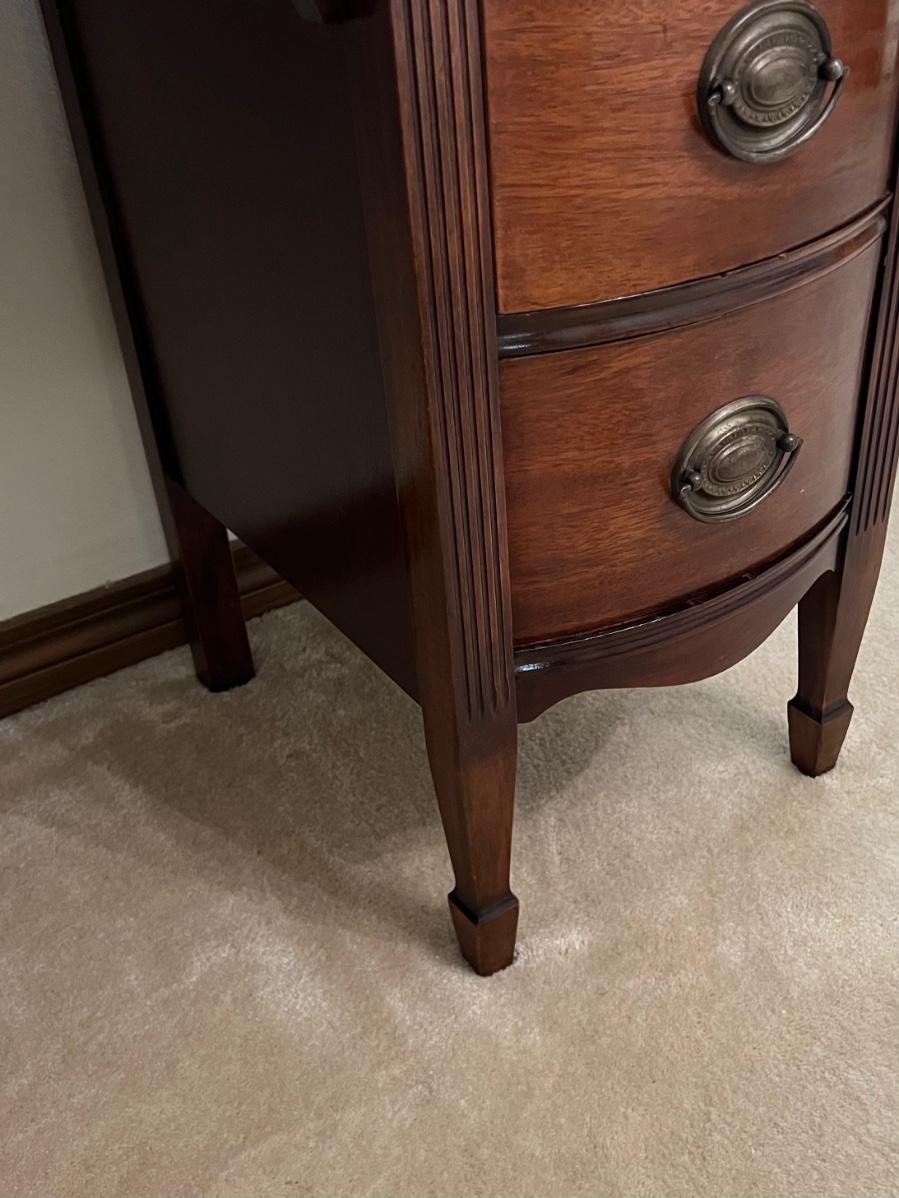 All drawers slide in & out easily. No brand name found. Vanity = 29” H x 47” W x 18” D ~ Mirror = 38” H x 20.5” W ~ Chair = 32” H x 17.5” H x 20” D
