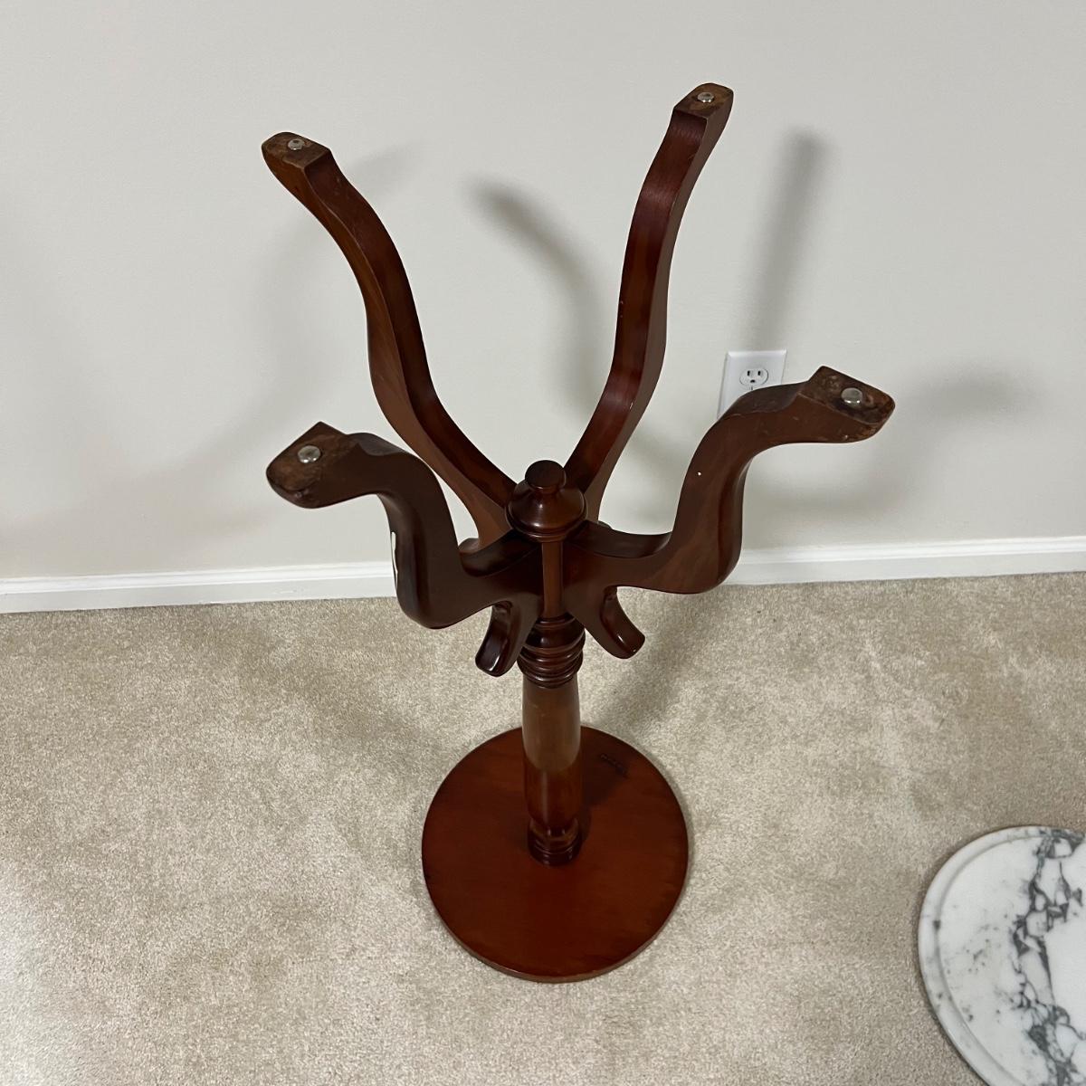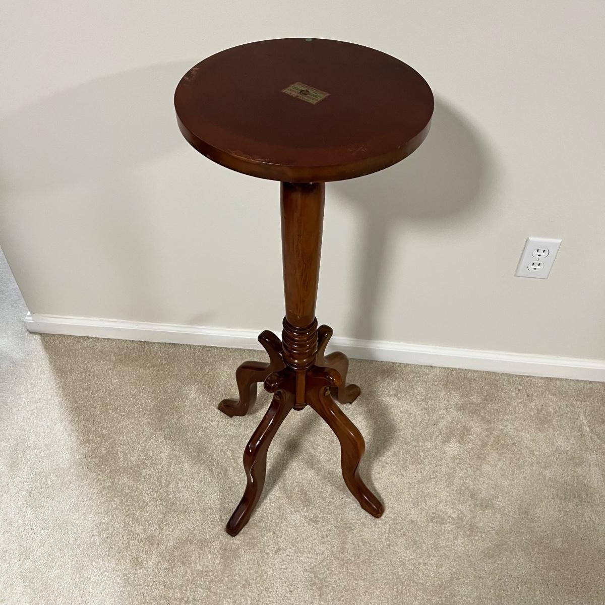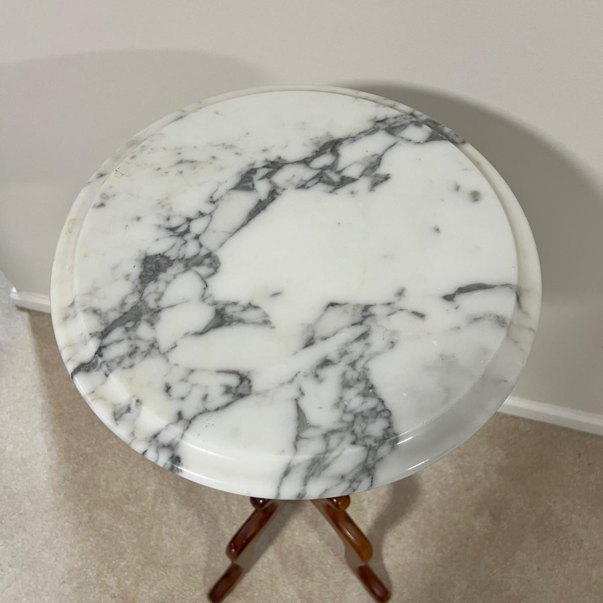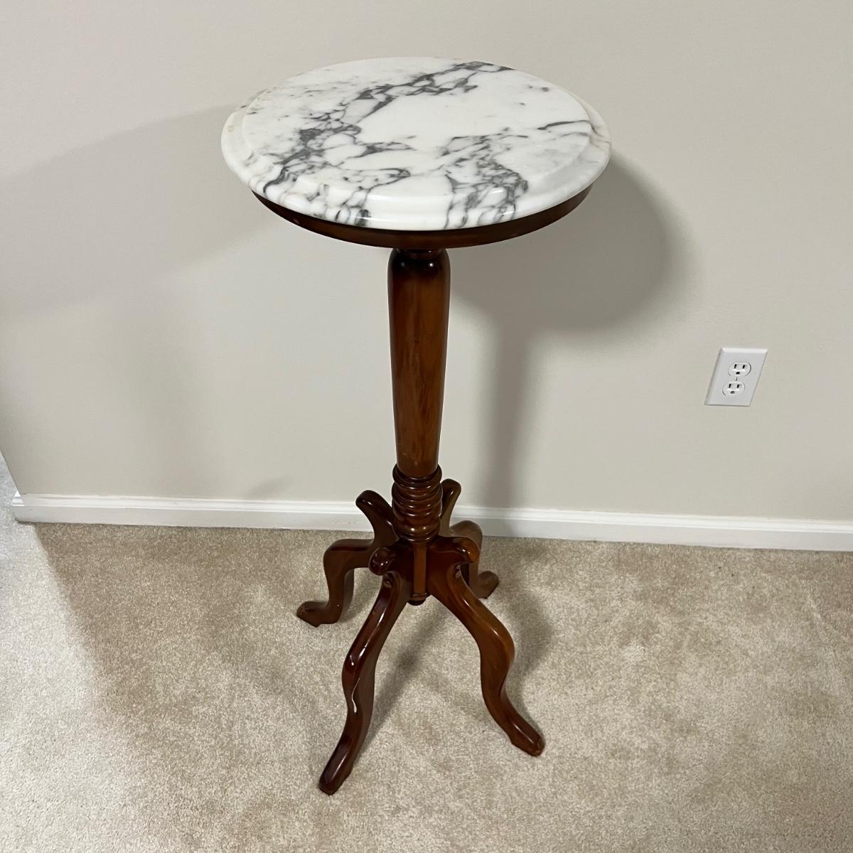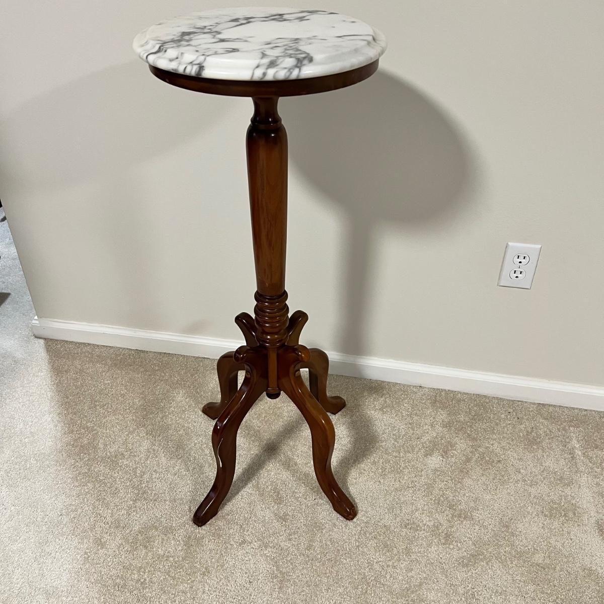 Rich solid mahogany plant stand has a stunning white with grey veins marble top. A few paint drops on a leg should be easy to scrape off.