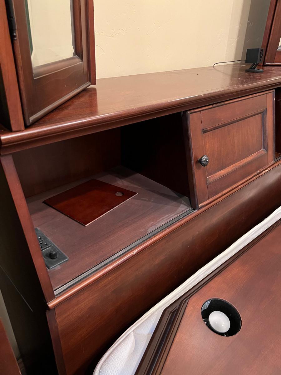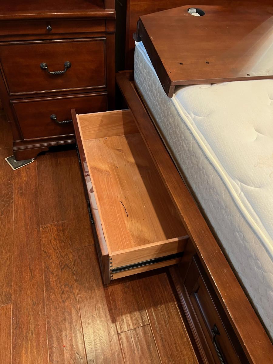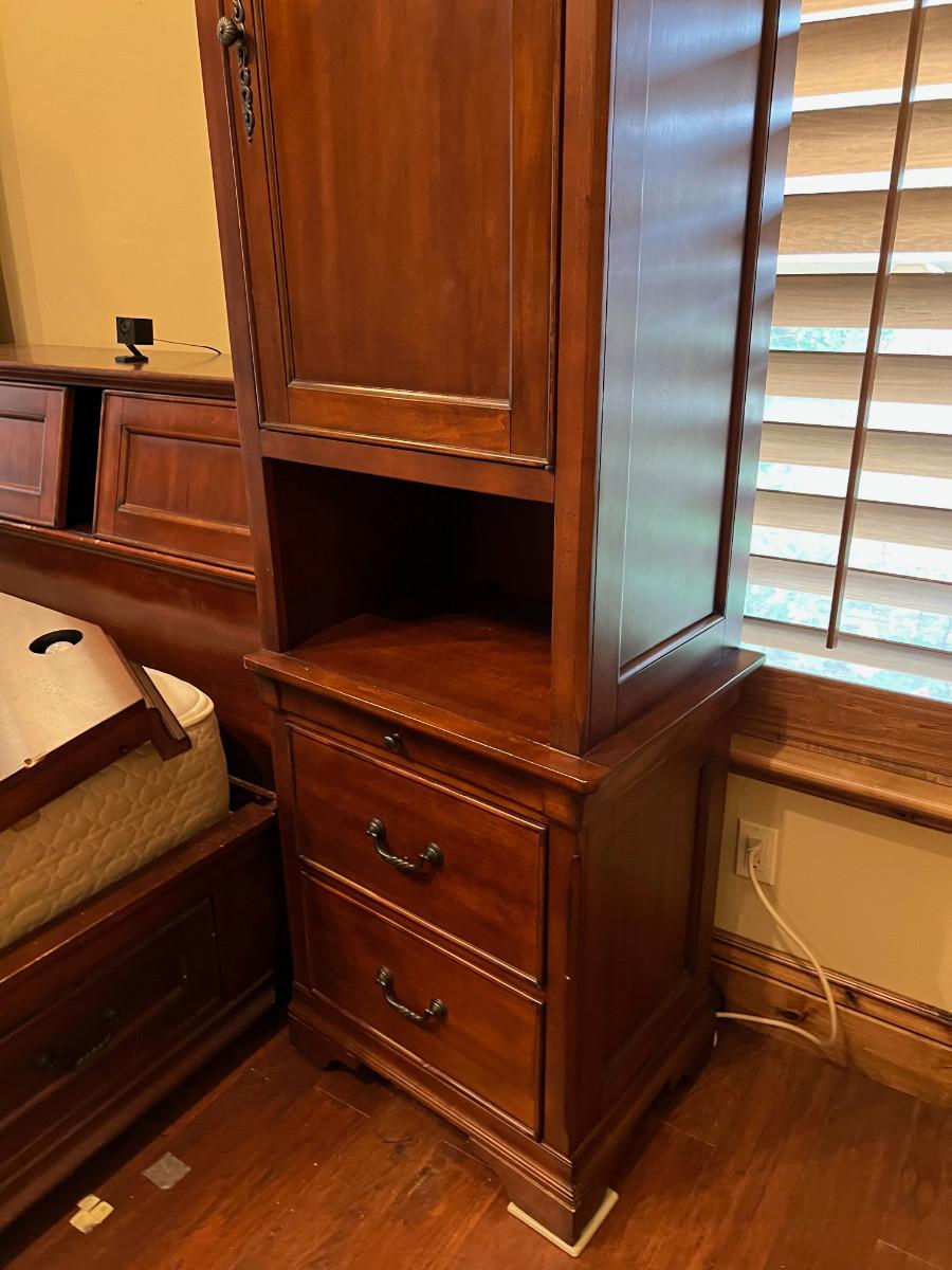 Bedroom set includes mattress all pieces shown included. One corner of the set has some damage to finish. Otherwise function as it should with normal wear and tear for a 30 year old set. No shipping on this item. If purchased buyer will need to arrange pick up and loading help.