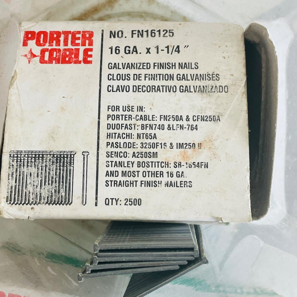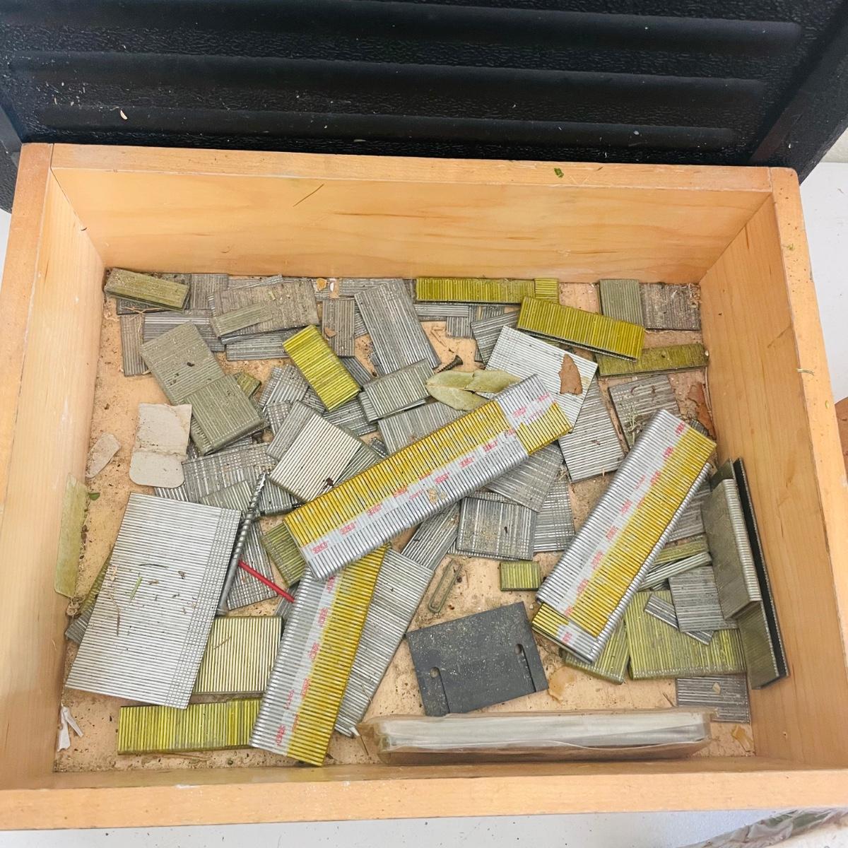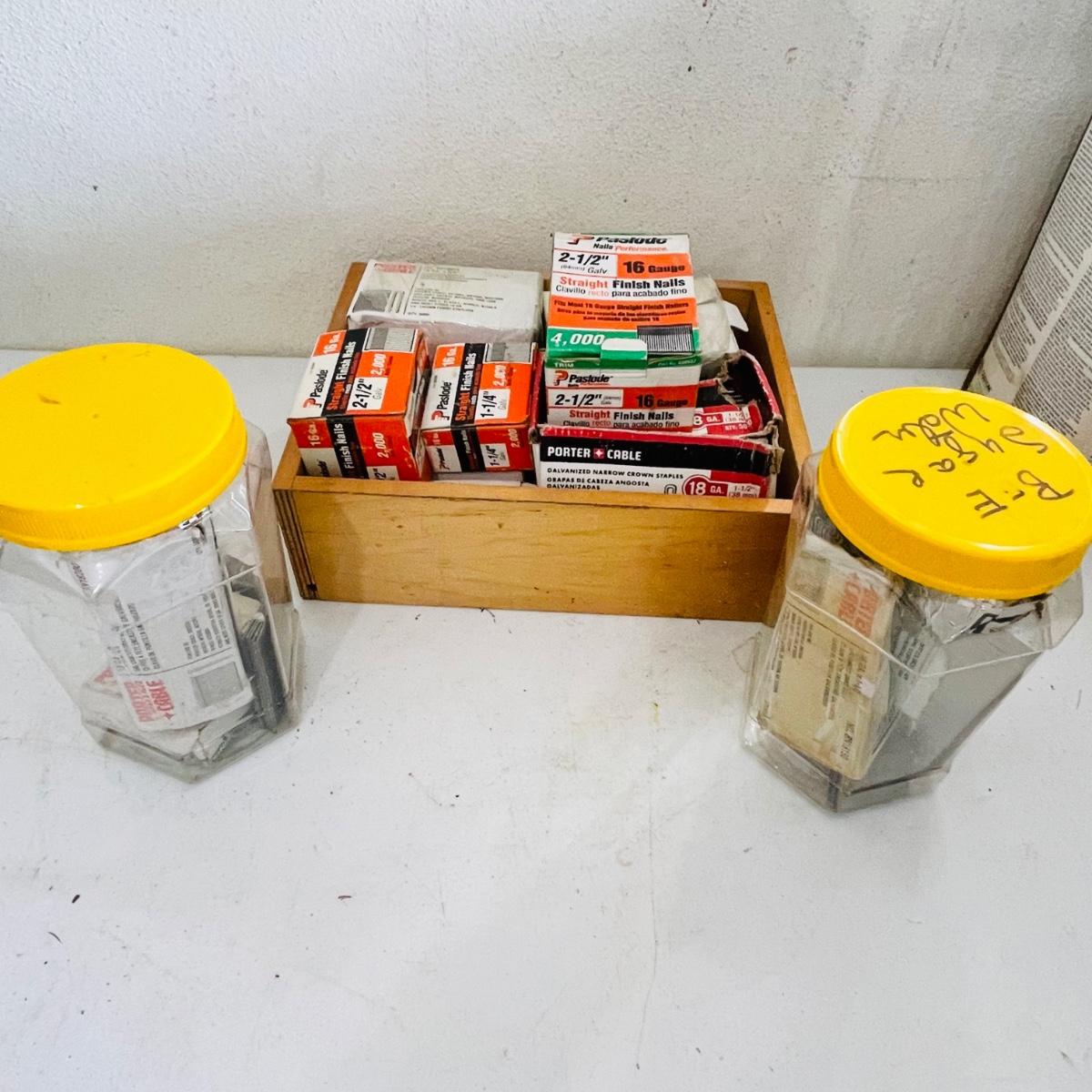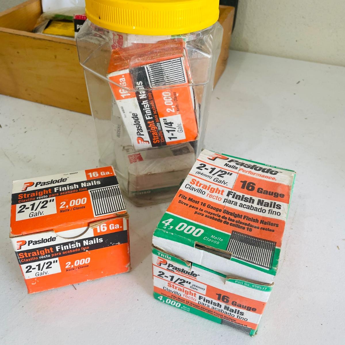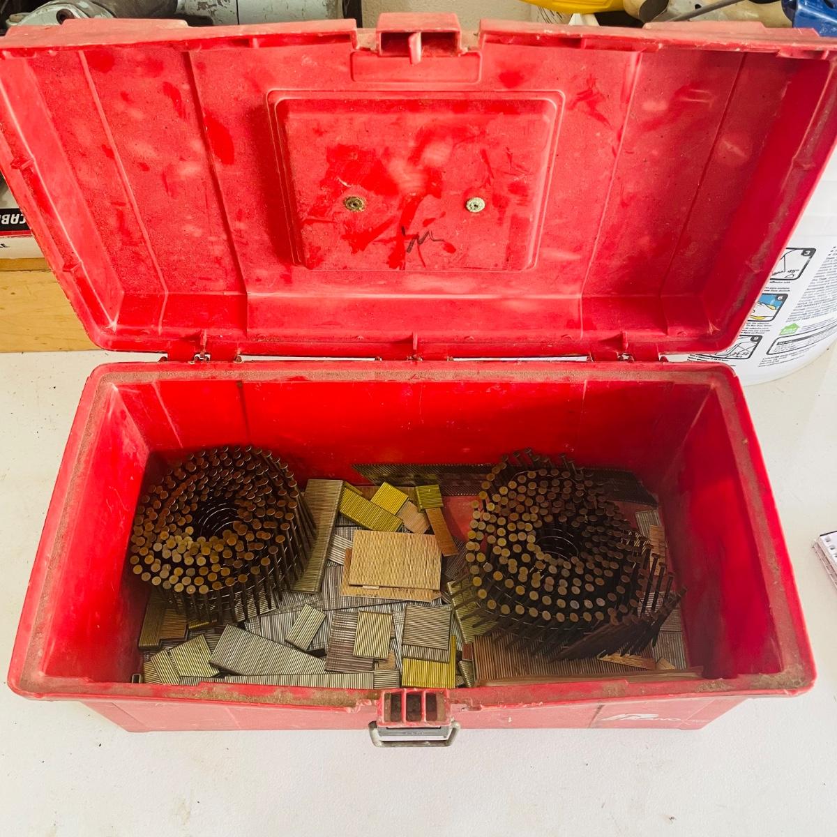 This lot includes 3 different nail guns and a large assortment of nails to accompany the guns. Nail guns include: a Porter Cable 18 ga. nail gun with case. A Hitachi 16 ga. - 2 1/2” nail gun with single or multiple nail option and a Hitachi NV83A2, 3 1/4” coil nailer. All 3 nail guns are used and unable to verify the working condition. The lot also includes a wooden box and Plano tool box full of Nail gun nails including Porter Cable 18ga x 1 1/2” and 2” galvanized Brad nails, 16ga 1 1/4” finishing nails. 18 ga. galvanized crown staples sizes 1/2”, 1” and 1 1/2”. Dewalt 18ga x 1” narrow crown staples and Paslode 16 ga x 2 1/2” finishing nails. The red Plano tool box is used and includes 2 rolls of nails for the Hitachi coil nailer. Two containers of nails gun nails are also included.