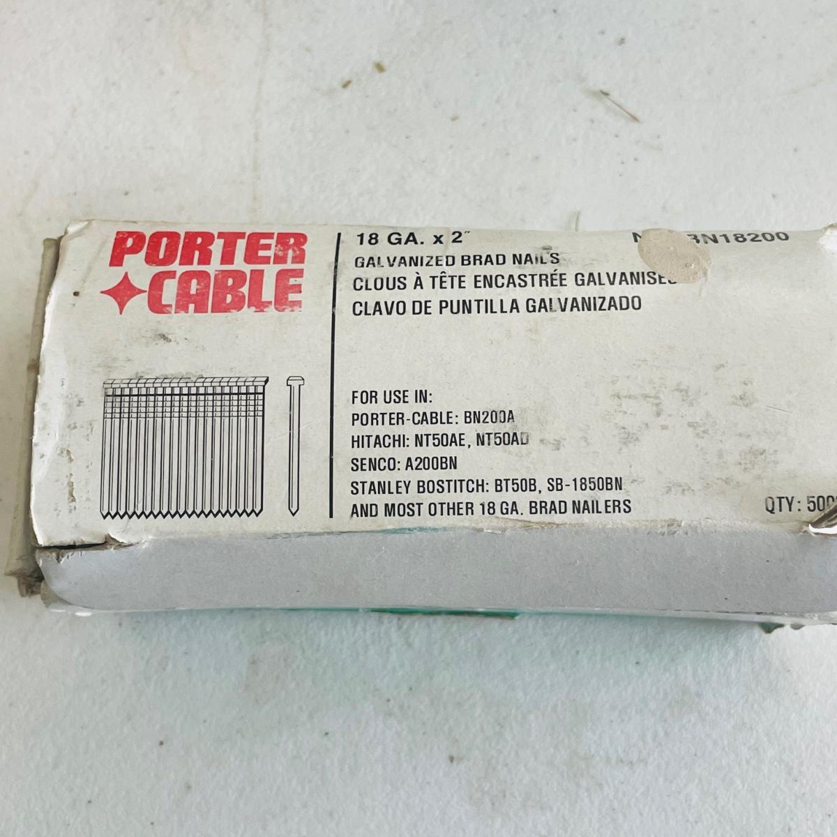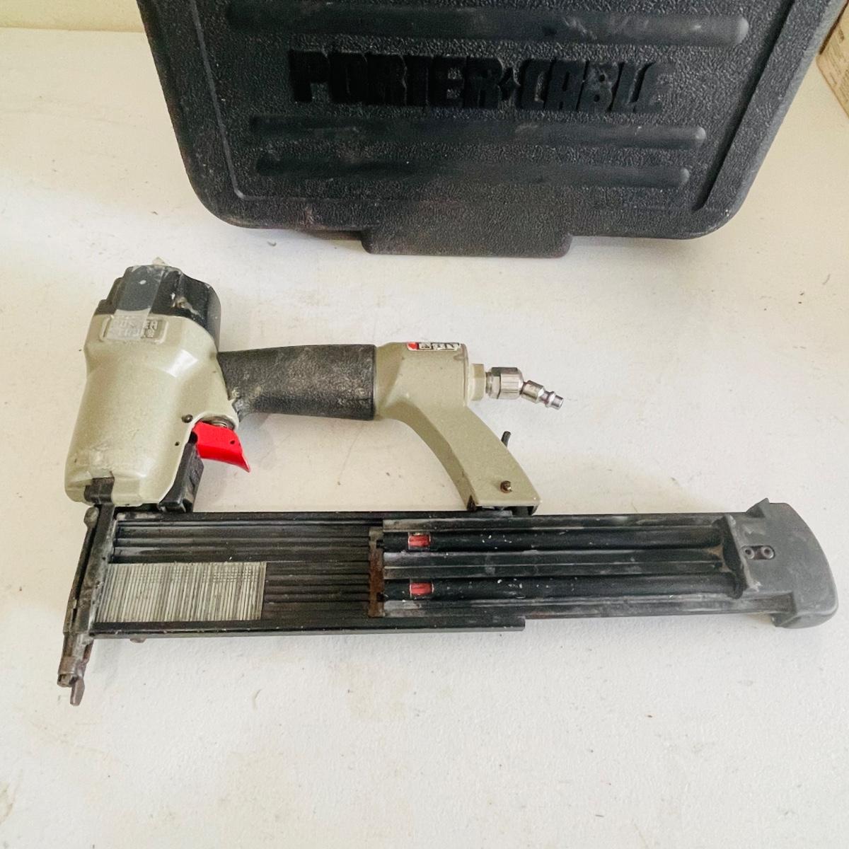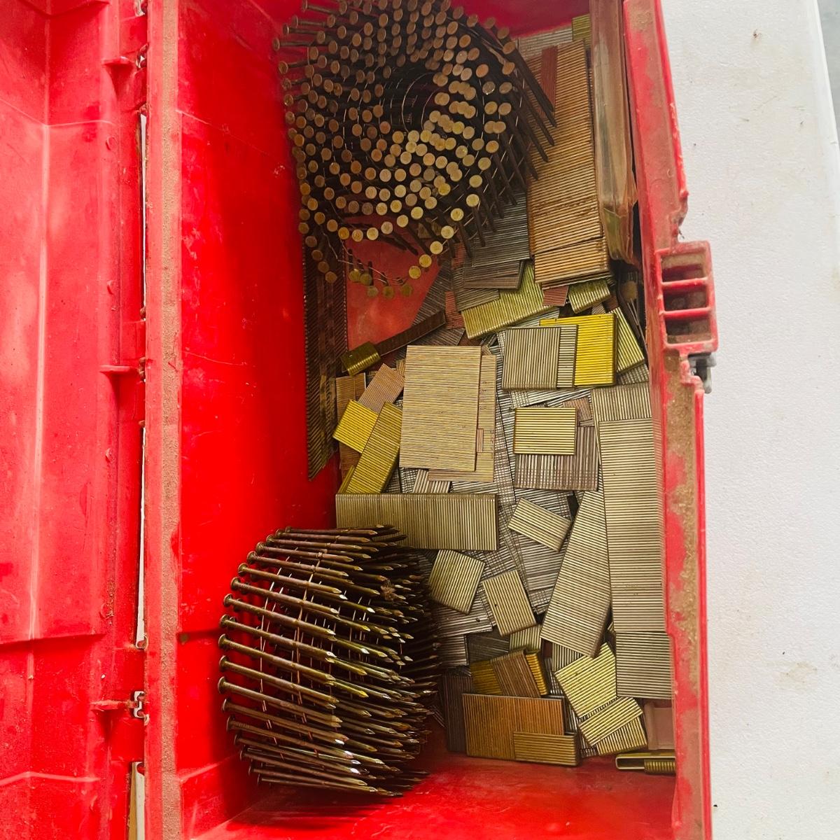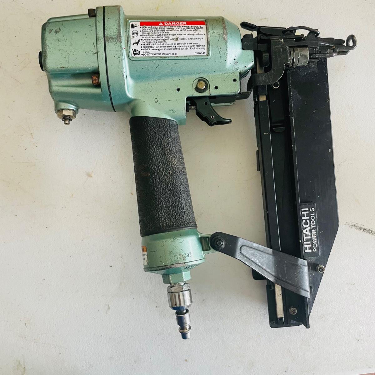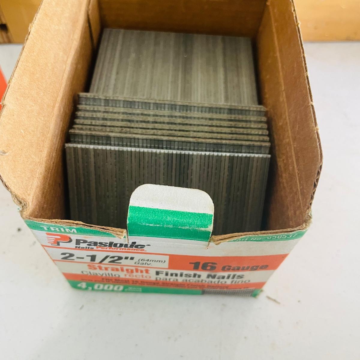 This lot includes 3 different nail guns and a large assortment of nails to accompany the guns. Nail guns include: a Porter Cable 18 ga. nail gun with case. A Hitachi 16 ga. - 2 1/2” nail gun with single or multiple nail option and a Hitachi NV83A2, 3 1/4” coil nailer. All 3 nail guns are used and unable to verify the working condition. The lot also includes a wooden box and Plano tool box full of Nail gun nails including Porter Cable 18ga x 1 1/2” and 2” galvanized Brad nails, 16ga 1 1/4” finishing nails. 18 ga. galvanized crown staples sizes 1/2”, 1” and 1 1/2”. Dewalt 18ga x 1” narrow crown staples and Paslode 16 ga x 2 1/2” finishing nails. The red Plano tool box is used and includes 2 rolls of nails for the Hitachi coil nailer. Two containers of nails gun nails are also included.