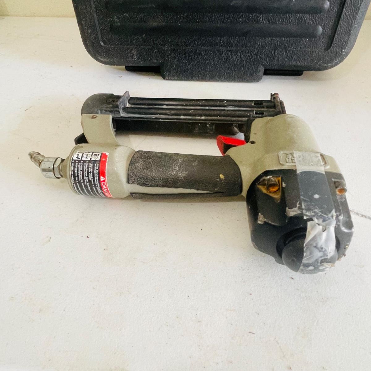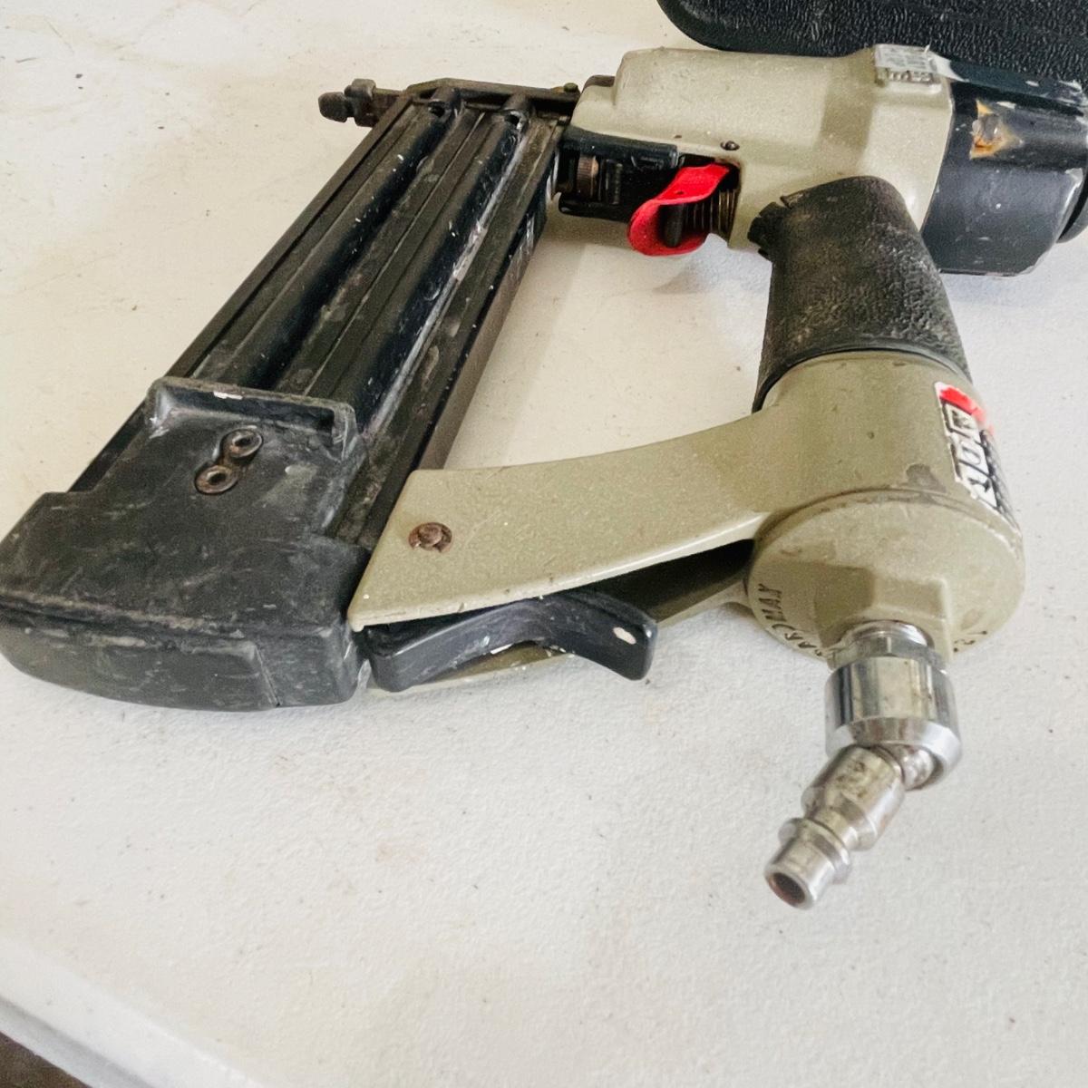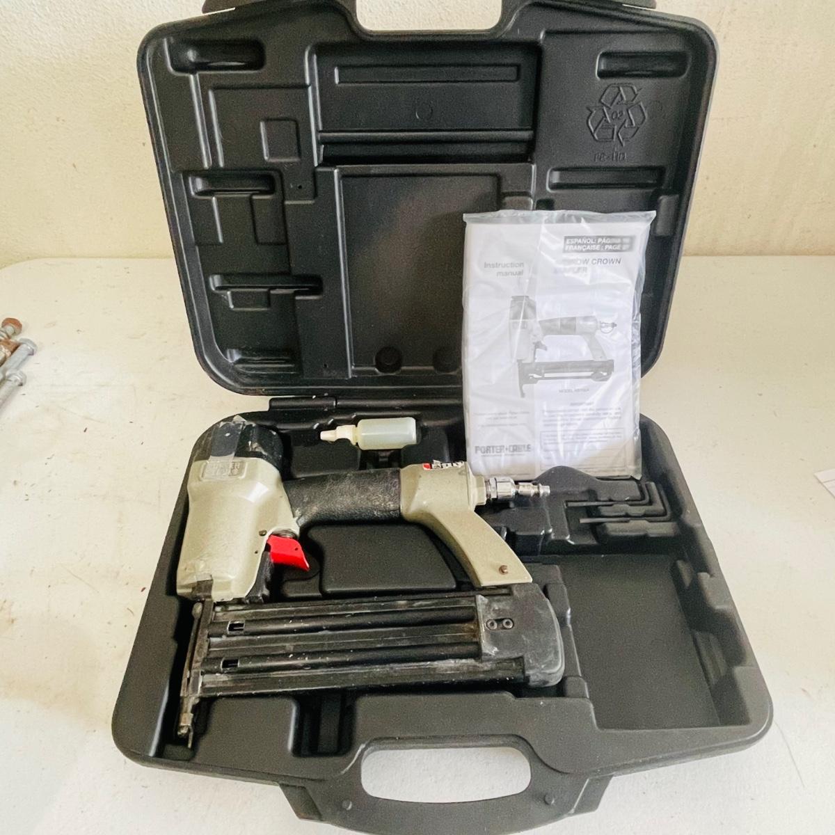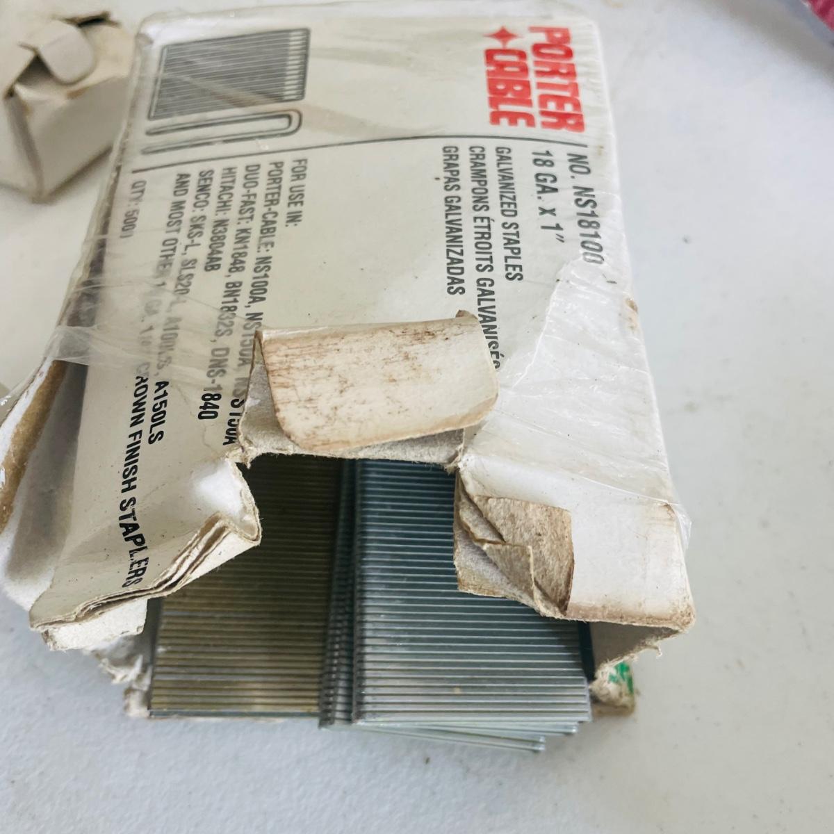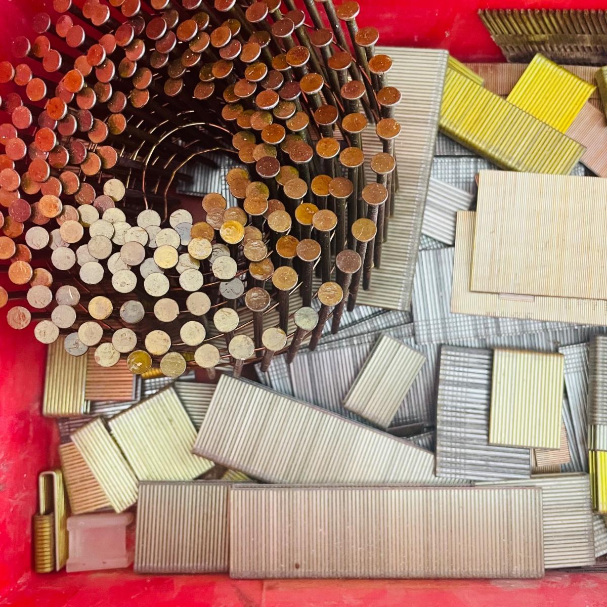 This lot includes 3 different nail guns and a large assortment of nails to accompany the guns. Nail guns include: a Porter Cable 18 ga. nail gun with case. A Hitachi 16 ga. - 2 1/2” nail gun with single or multiple nail option and a Hitachi NV83A2, 3 1/4” coil nailer. All 3 nail guns are used and unable to verify the working condition. The lot also includes a wooden box and Plano tool box full of Nail gun nails including Porter Cable 18ga x 1 1/2” and 2” galvanized Brad nails, 16ga 1 1/4” finishing nails. 18 ga. galvanized crown staples sizes 1/2”, 1” and 1 1/2”. Dewalt 18ga x 1” narrow crown staples and Paslode 16 ga x 2 1/2” finishing nails. The red Plano tool box is used and includes 2 rolls of nails for the Hitachi coil nailer. Two containers of nails gun nails are also included.