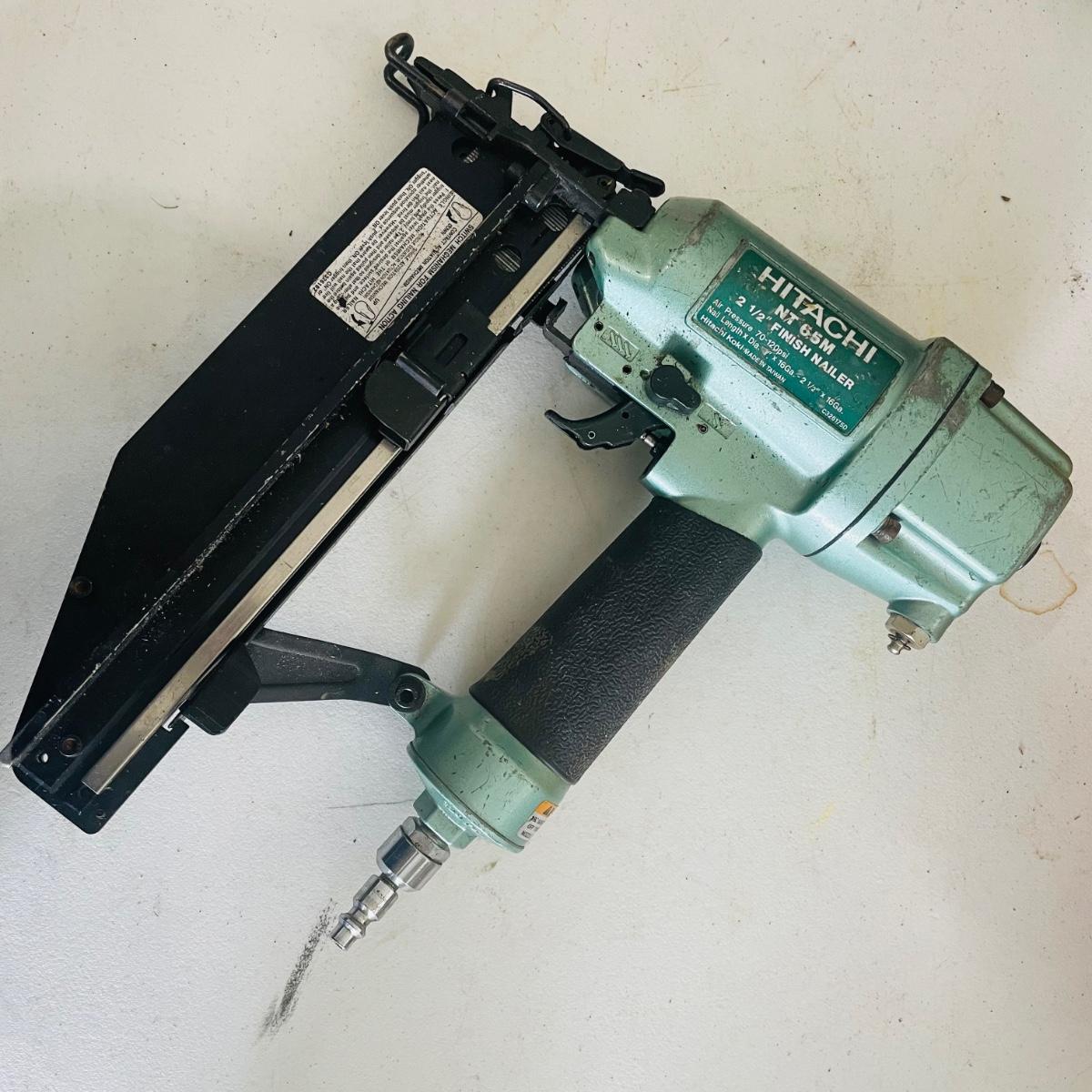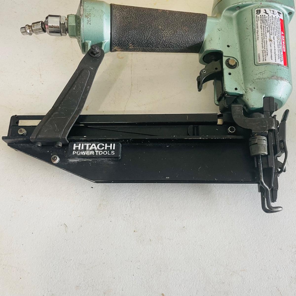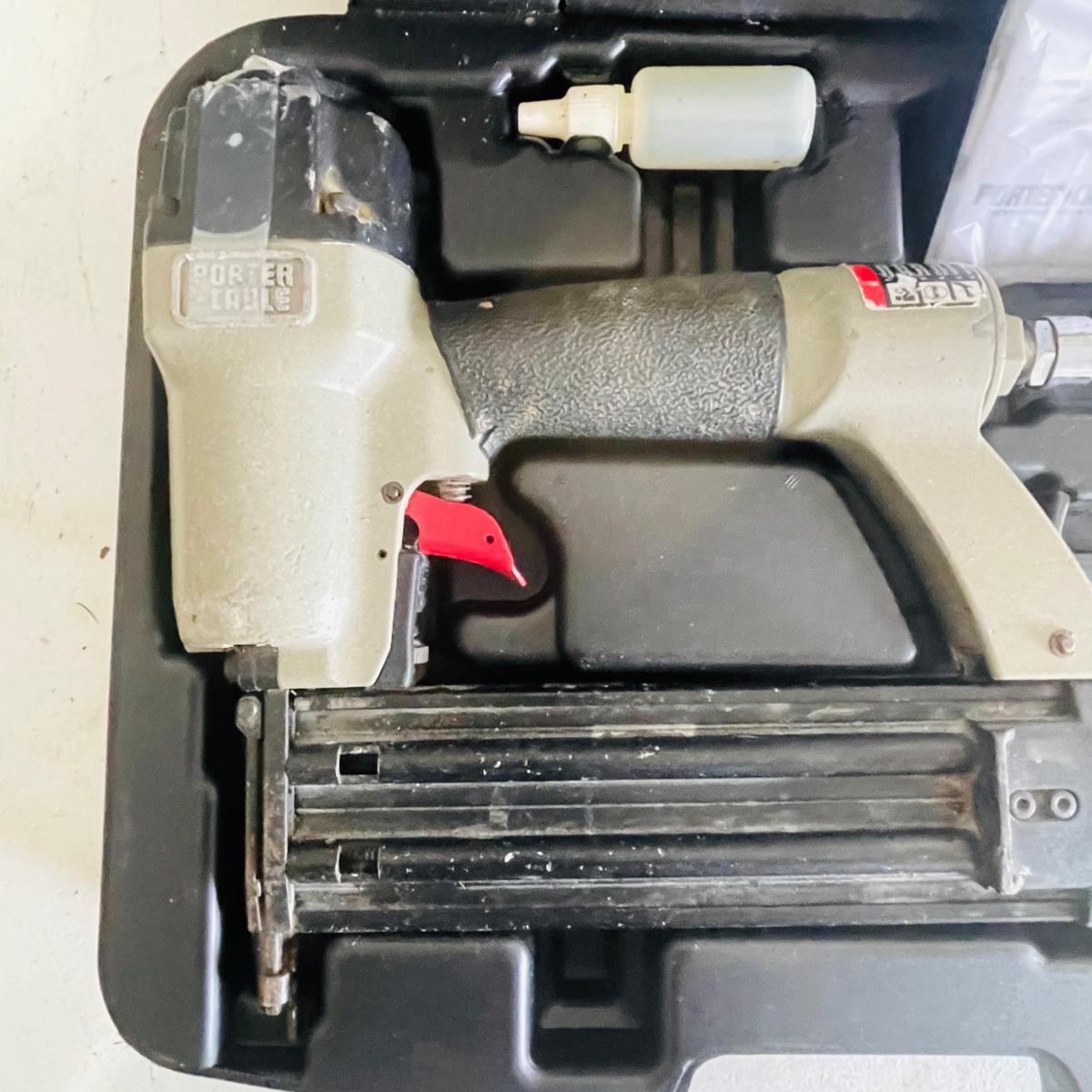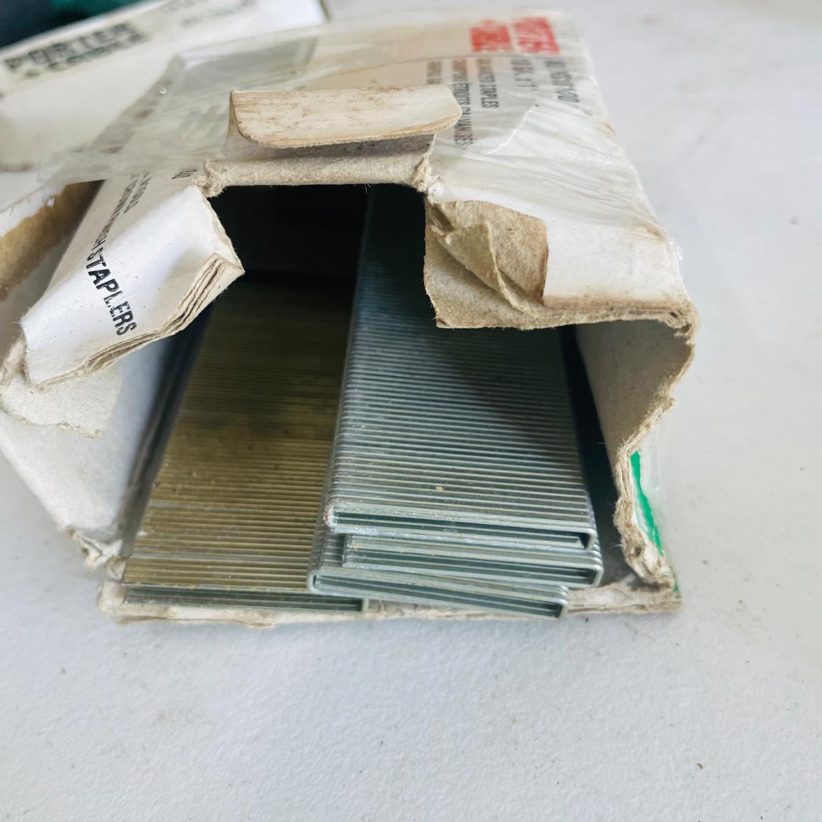 This lot includes 3 different nail guns and a large assortment of nails to accompany the guns. Nail guns include: a Porter Cable 18 ga. nail gun with case. A Hitachi 16 ga. - 2 1/2” nail gun with single or multiple nail option and a Hitachi NV83A2, 3 1/4” coil nailer. All 3 nail guns are used and unable to verify the working condition. The lot also includes a wooden box and Plano tool box full of Nail gun nails including Porter Cable 18ga x 1 1/2” and 2” galvanized Brad nails, 16ga 1 1/4” finishing nails. 18 ga. galvanized crown staples sizes 1/2”, 1” and 1 1/2”. Dewalt 18ga x 1” narrow crown staples and Paslode 16 ga x 2 1/2” finishing nails. The red Plano tool box is used and includes 2 rolls of nails for the Hitachi coil nailer. Two containers of nails gun nails are also included.