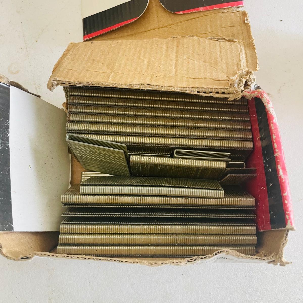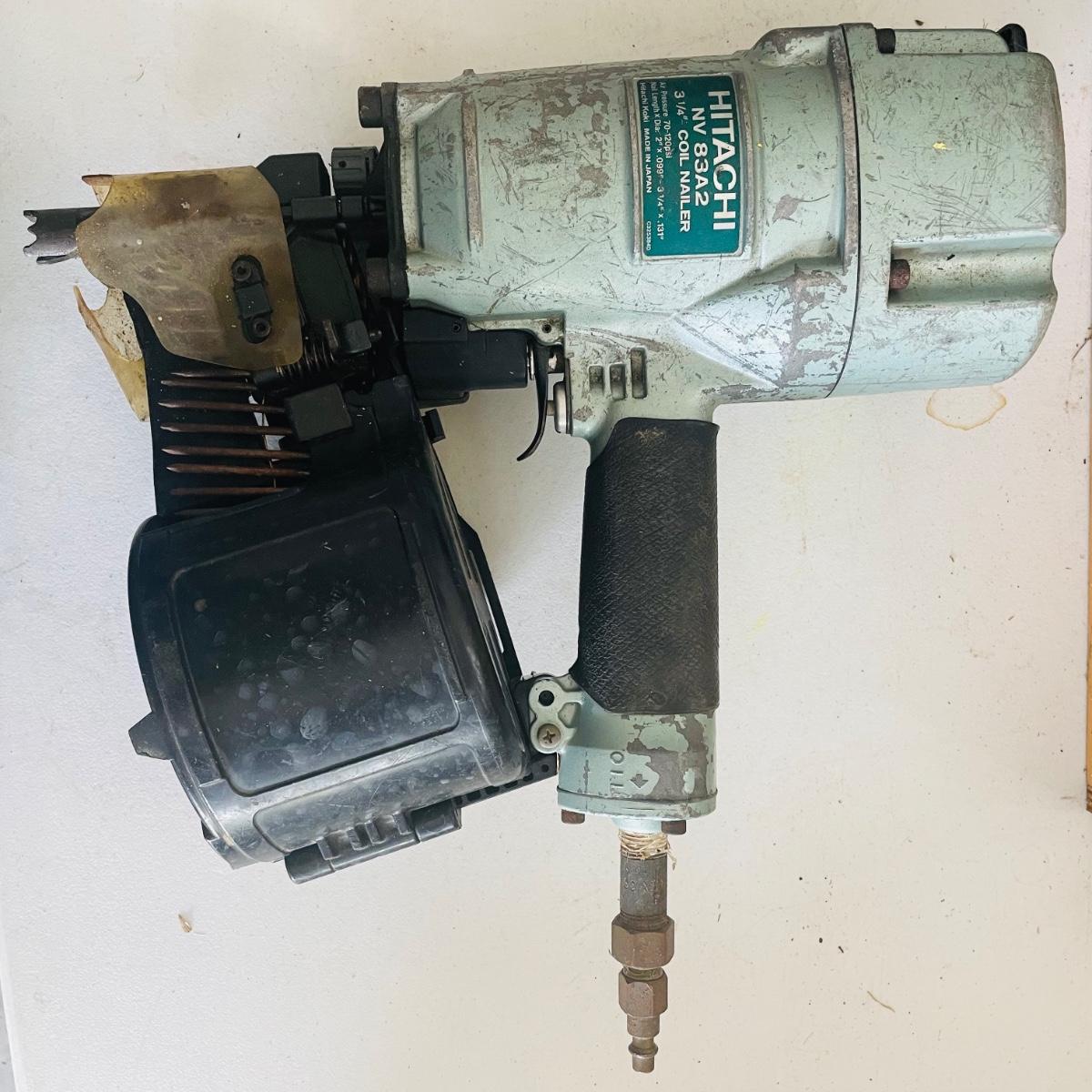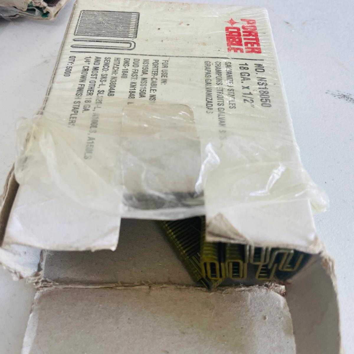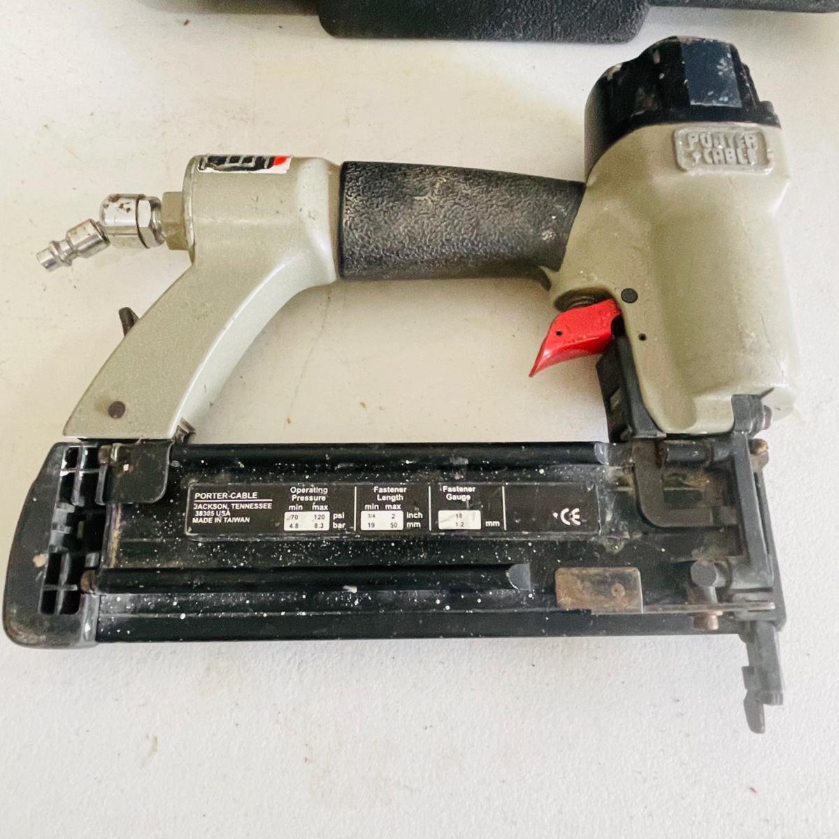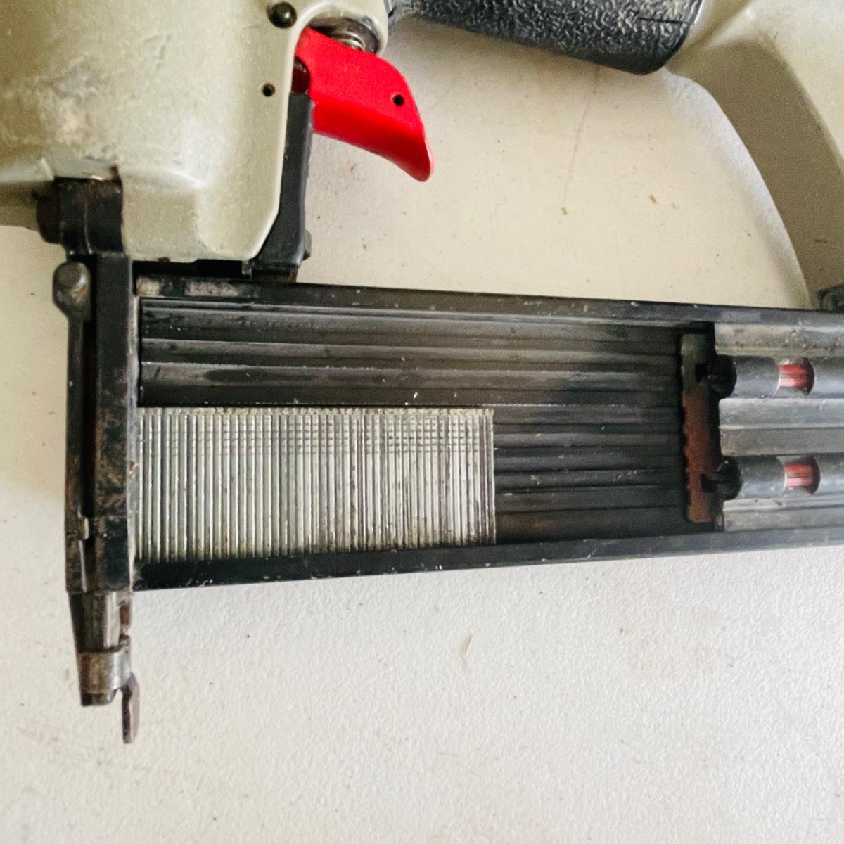 This lot includes 3 different nail guns and a large assortment of nails to accompany the guns. Nail guns include: a Porter Cable 18 ga. nail gun with case. A Hitachi 16 ga. - 2 1/2” nail gun with single or multiple nail option and a Hitachi NV83A2, 3 1/4” coil nailer. All 3 nail guns are used and unable to verify the working condition. The lot also includes a wooden box and Plano tool box full of Nail gun nails including Porter Cable 18ga x 1 1/2” and 2” galvanized Brad nails, 16ga 1 1/4” finishing nails. 18 ga. galvanized crown staples sizes 1/2”, 1” and 1 1/2”. Dewalt 18ga x 1” narrow crown staples and Paslode 16 ga x 2 1/2” finishing nails. The red Plano tool box is used and includes 2 rolls of nails for the Hitachi coil nailer. Two containers of nails gun nails are also included.