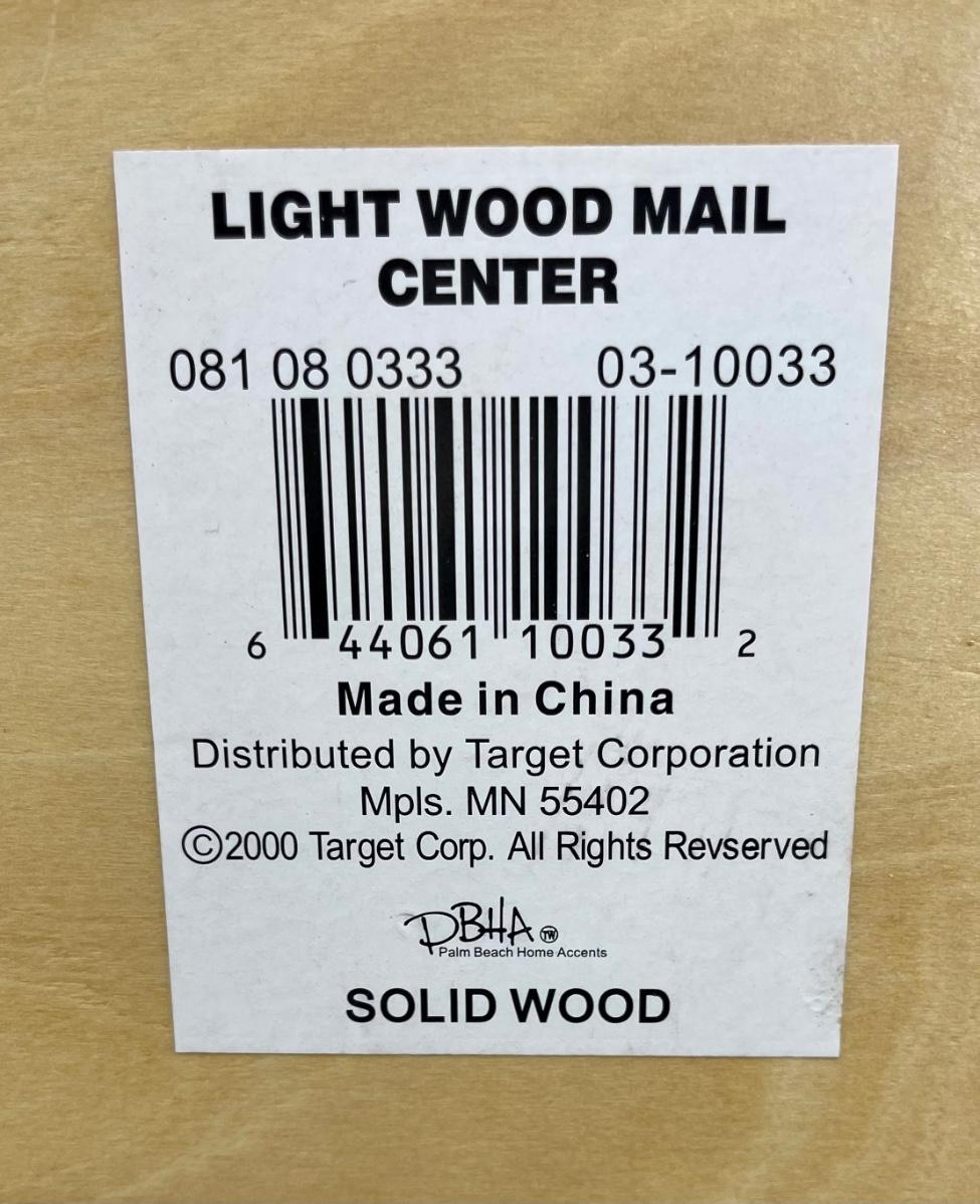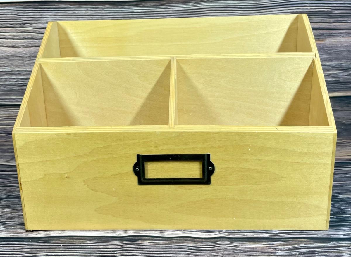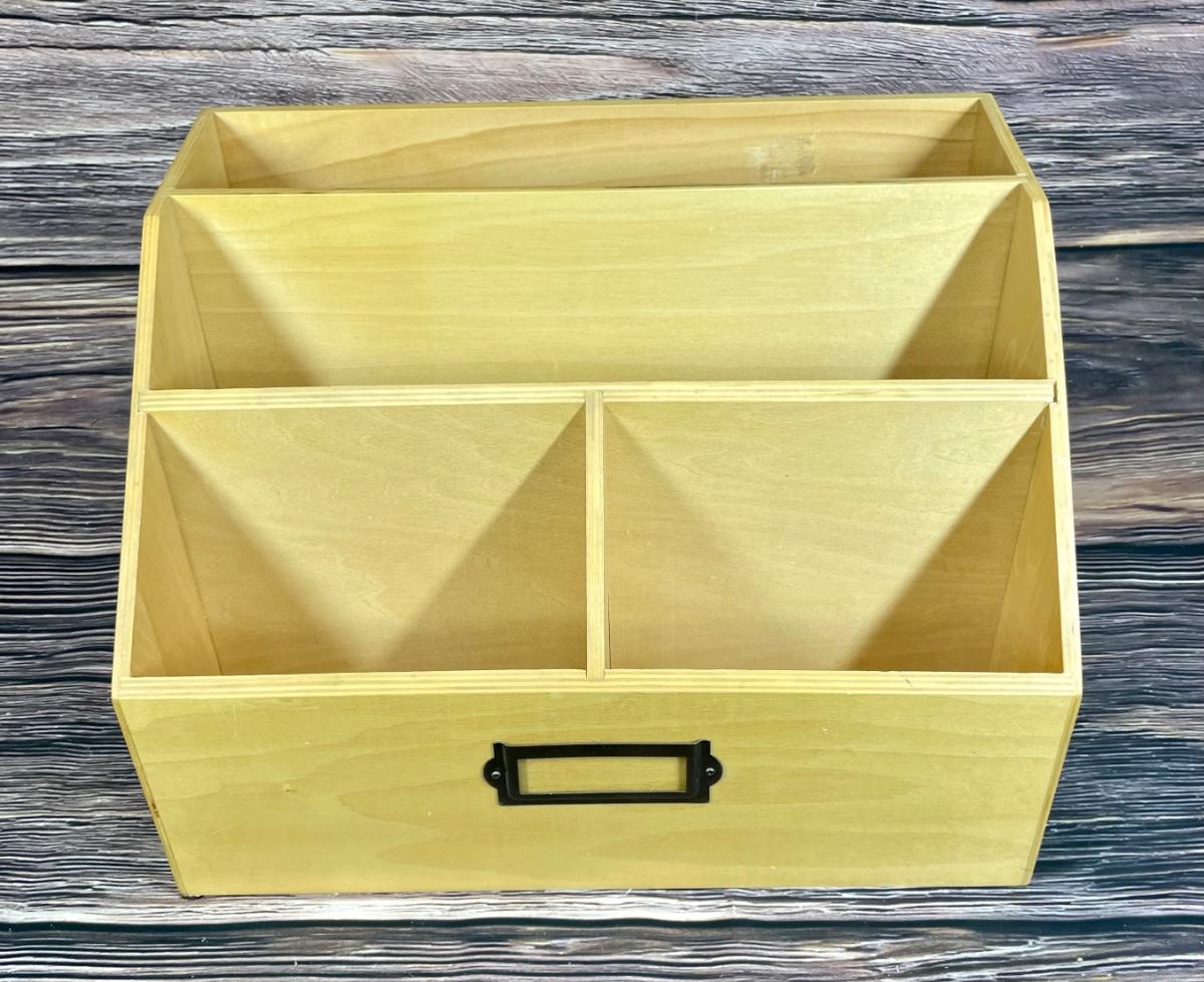 Wooden mail/letter/bill sorter. Can easily hold 8.5 x 11 papers. Made of light-colored plywood. 4 separate compartments. Approx 12.5” wide, 8” tall and 8” deep.