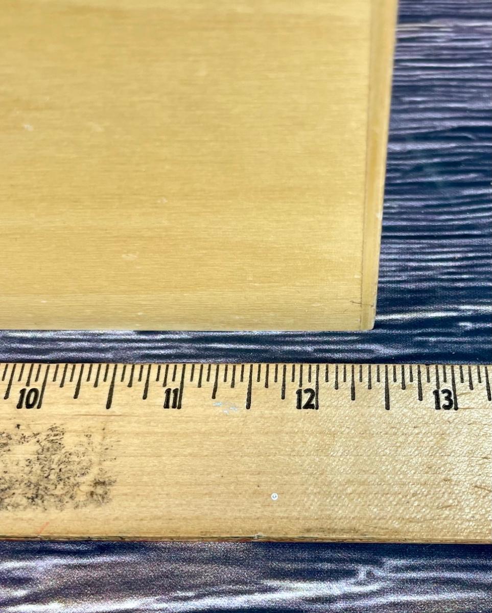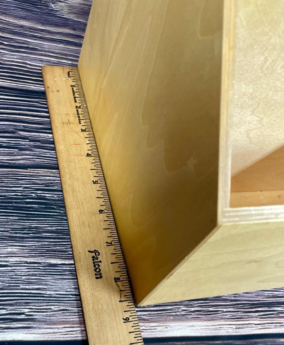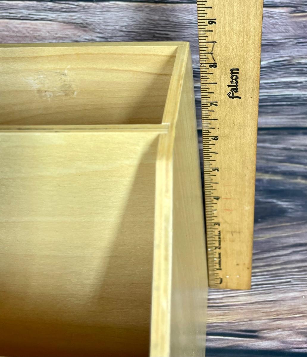 Wooden mail/letter/bill sorter. Can easily hold 8.5 x 11 papers. Made of light-colored plywood. 4 separate compartments. Approx 12.5” wide, 8” tall and 8” deep.