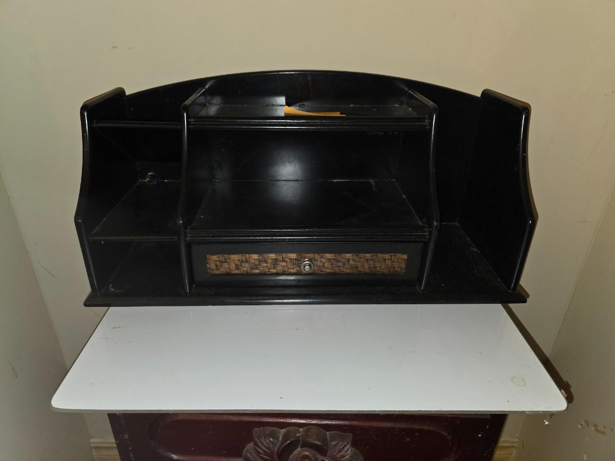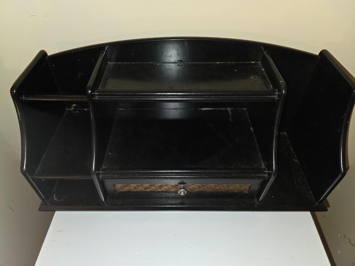 Black color. Measures 21 and half wide by 8 and half deep 9 inches tall
