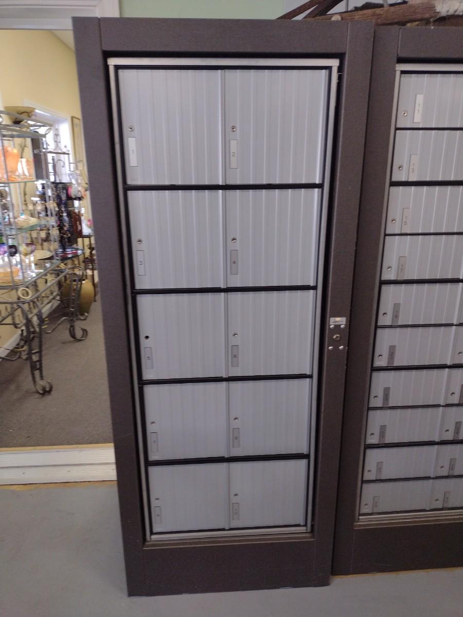 Steel Mailbox Cabinet for Large Packages 10 Door Most Have Keys. Has open back for delivery of packages into box cubby.