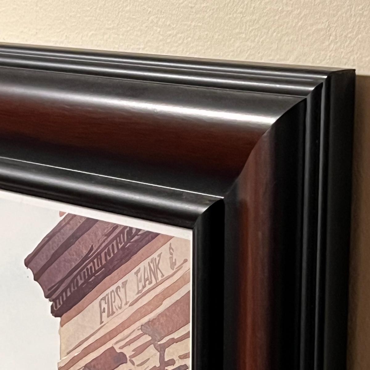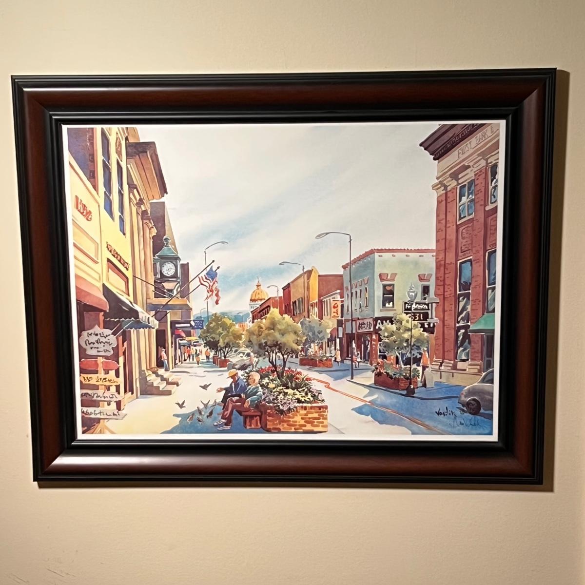 Large framed print of our beloved downtown Hendersonville by renowned local artist Ann Vasilik. Under glass, this signed and numbered print is housed in a dark cherry faux wood frame. Frame measures 29” x 23”H.