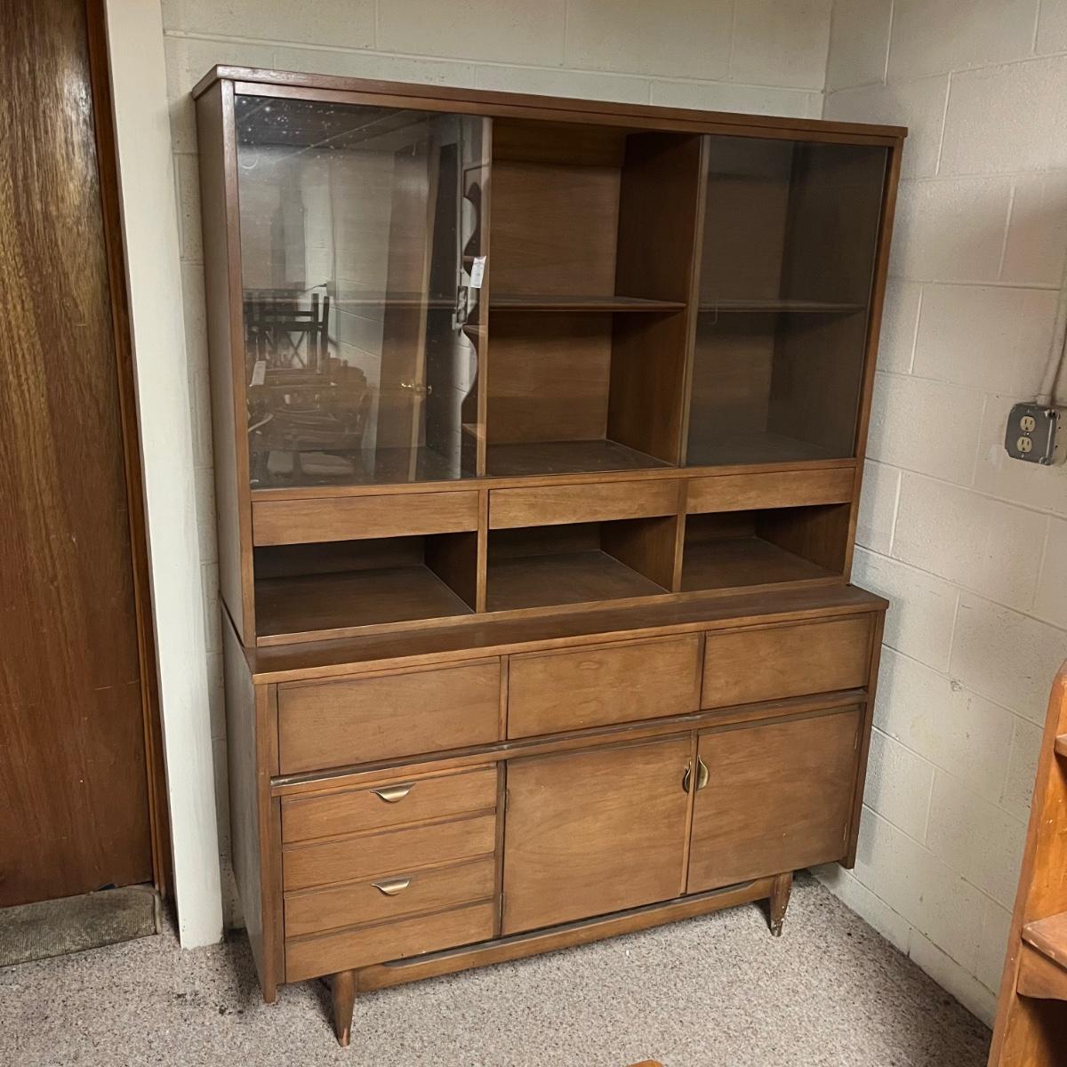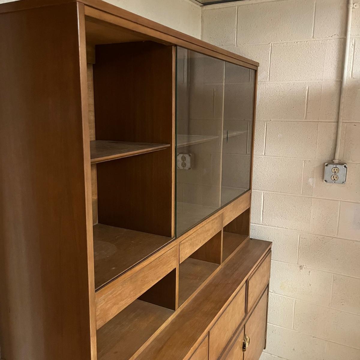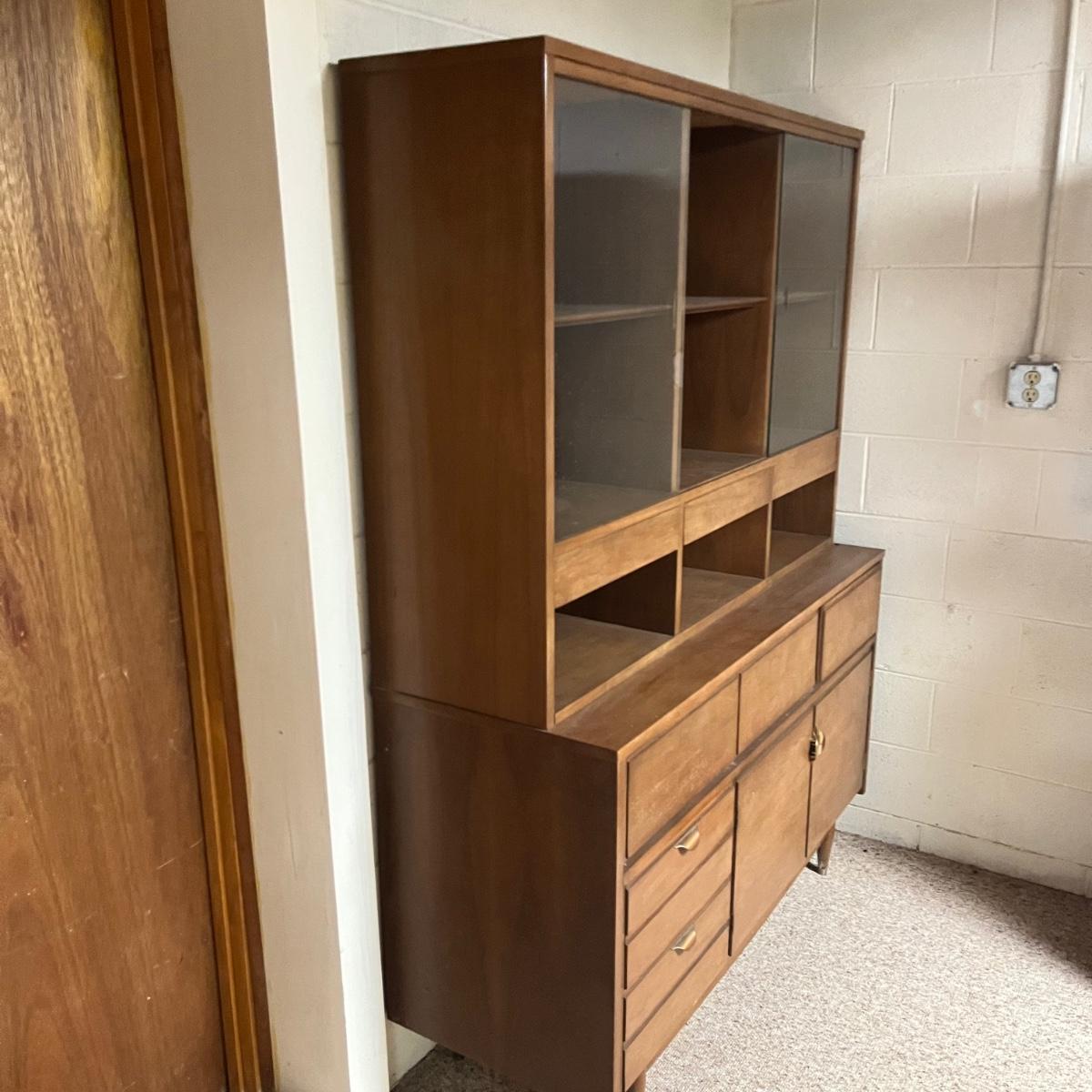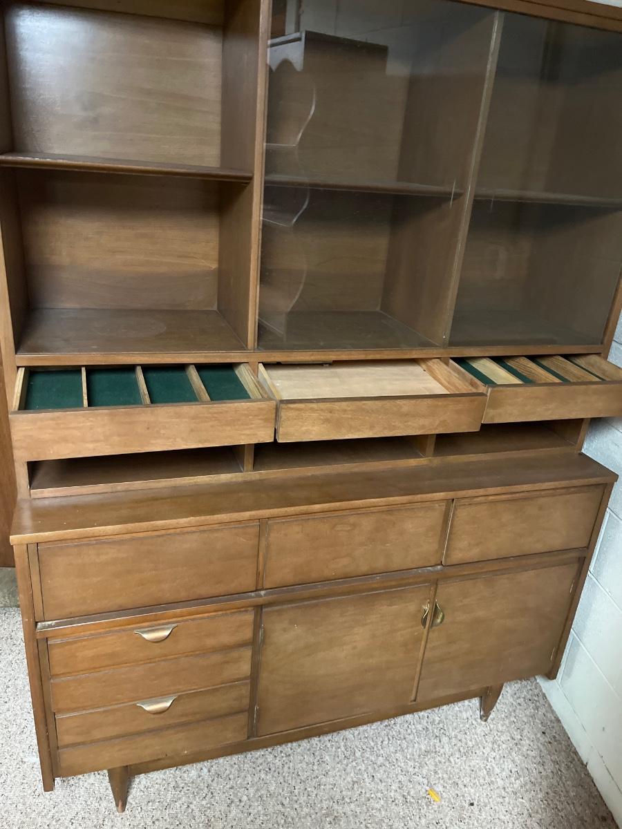 Lot includes a Mainline by Hooker MCM China cabinet with sliding glass doors on the top and three drawers and five dovetailed drawers and two door cabinet on the bottom. Item appears to be in two pieces with a bracket on each side, see pictures. Bottom piece measures 19” x 54” x 33” and top piece measures 14” x 54” x 39”.