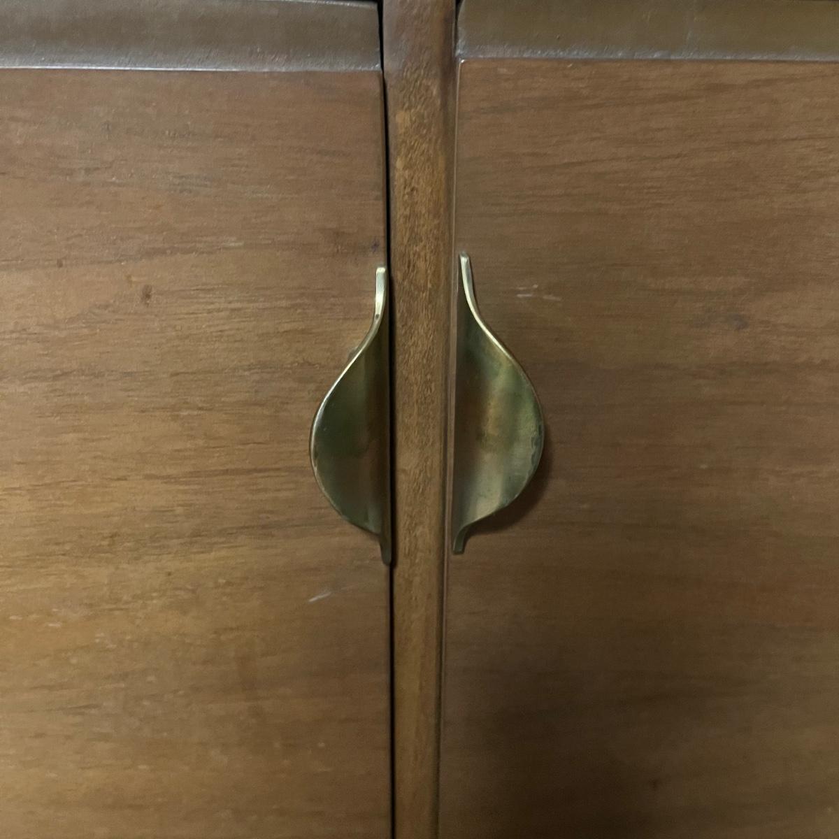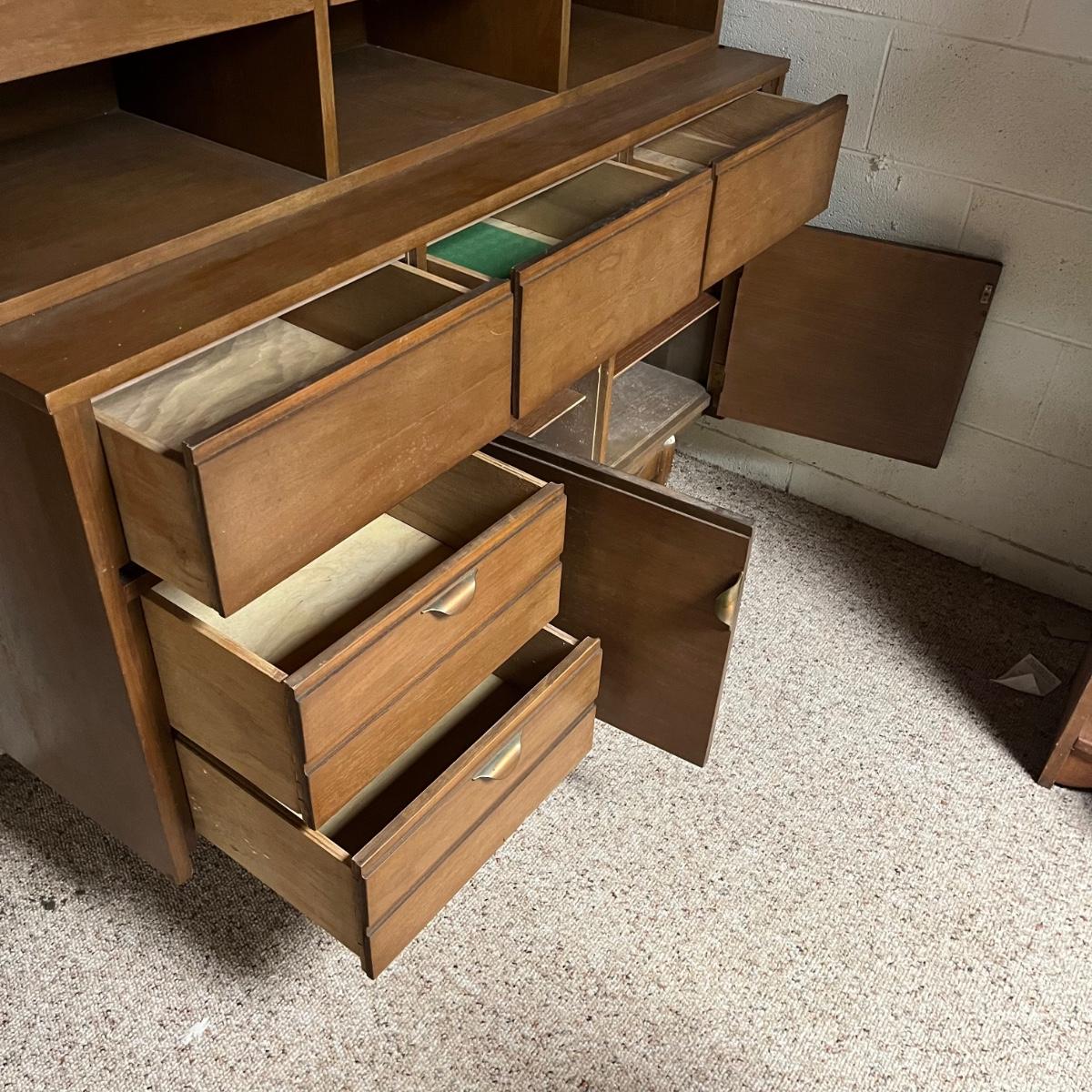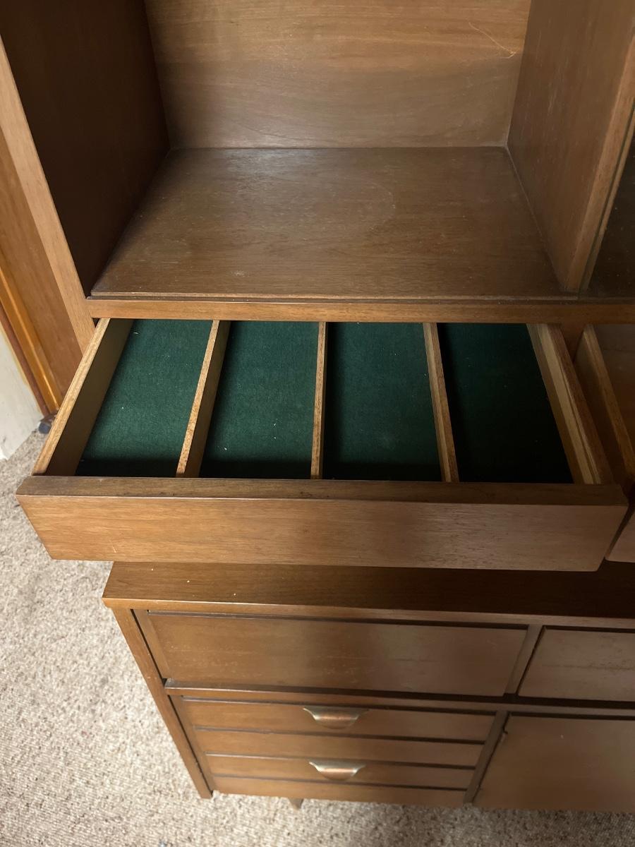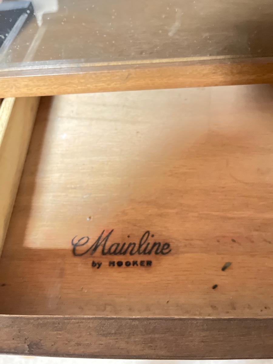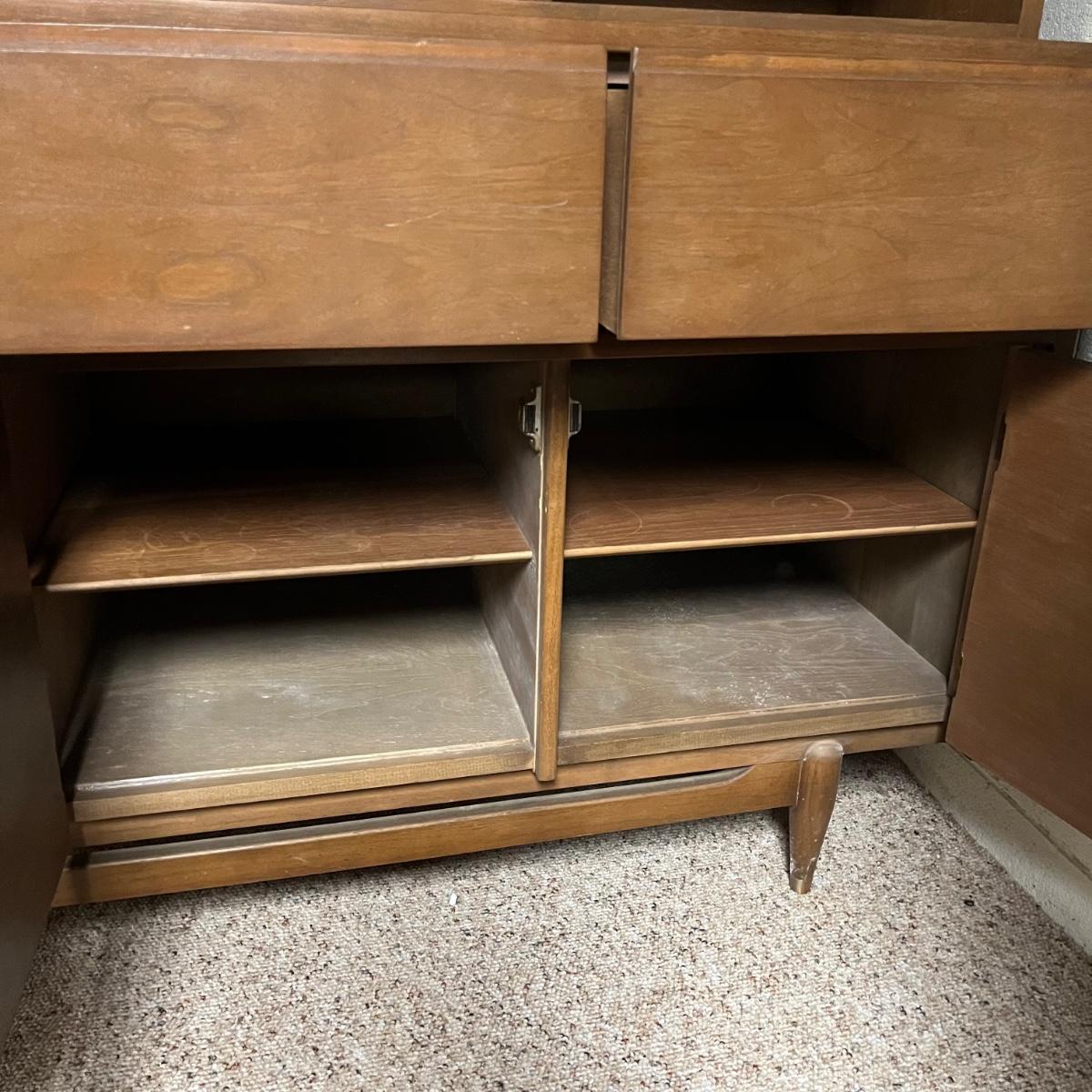 Lot includes a Mainline by Hooker MCM China cabinet with sliding glass doors on the top and three drawers and five dovetailed drawers and two door cabinet on the bottom. Item appears to be in two pieces with a bracket on each side, see pictures. Bottom piece measures 19” x 54” x 33” and top piece measures 14” x 54” x 39”.