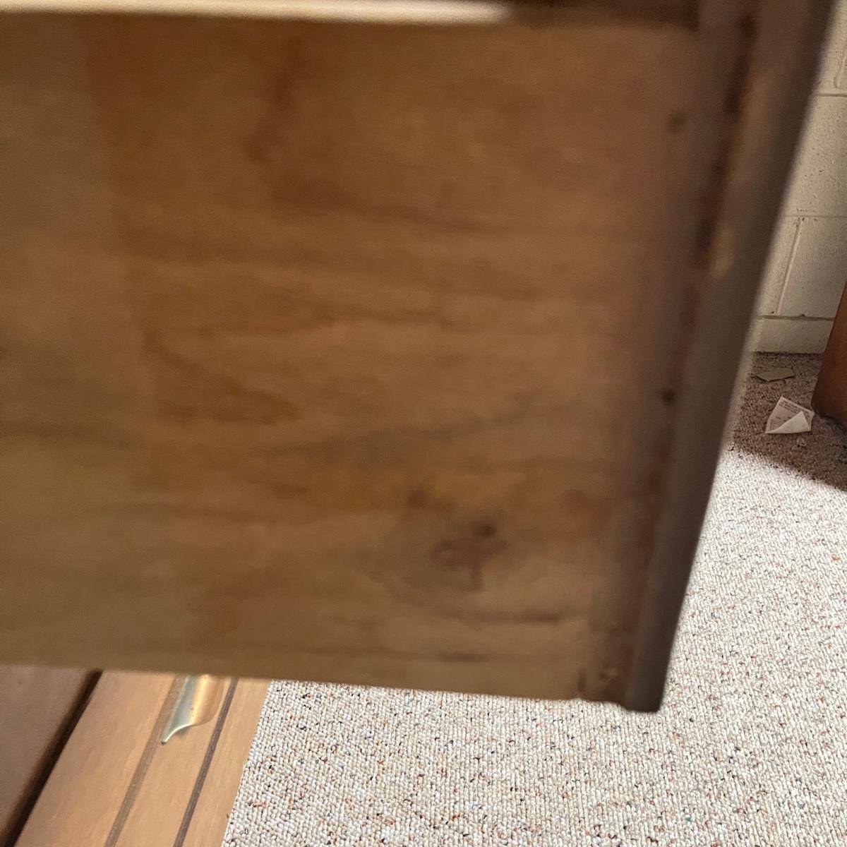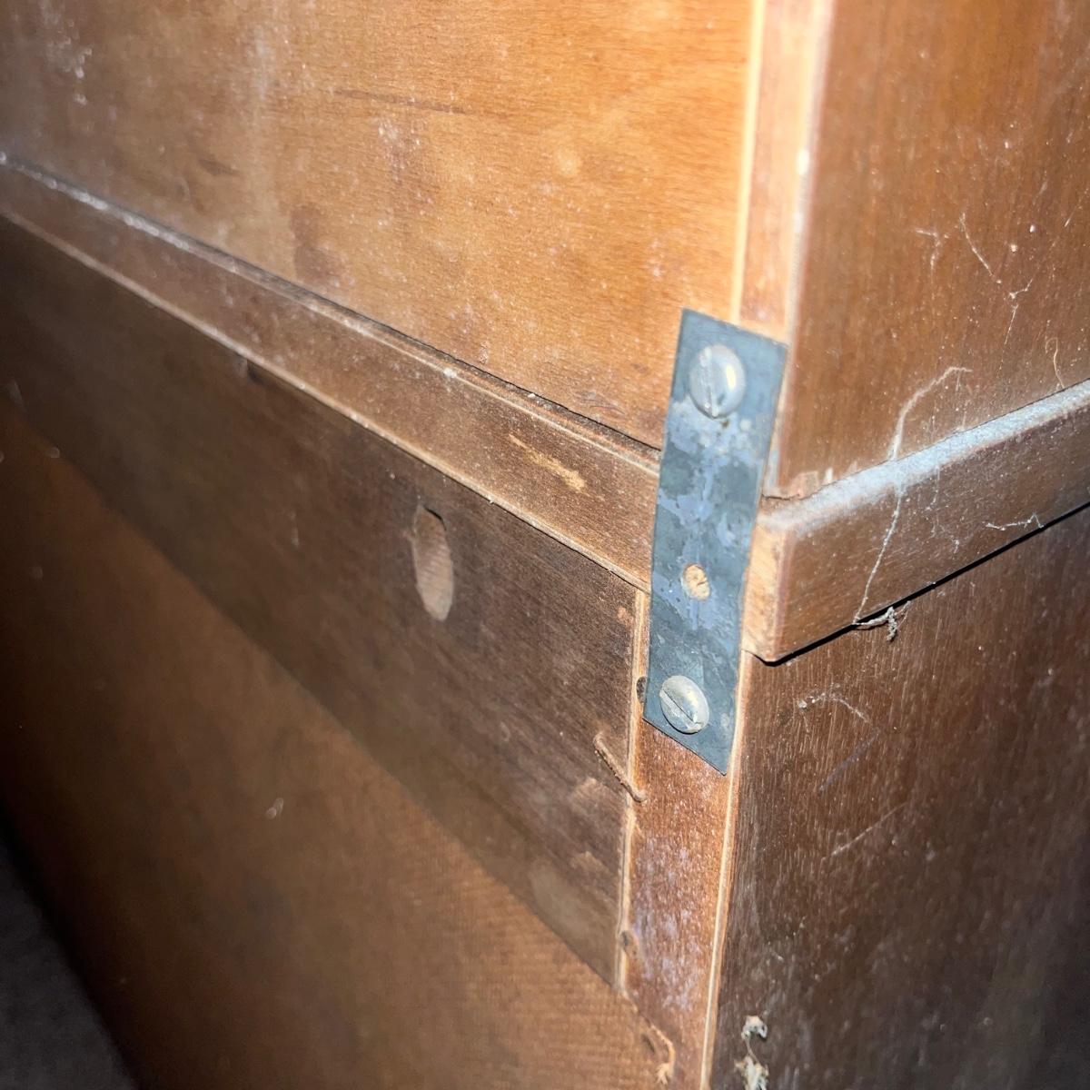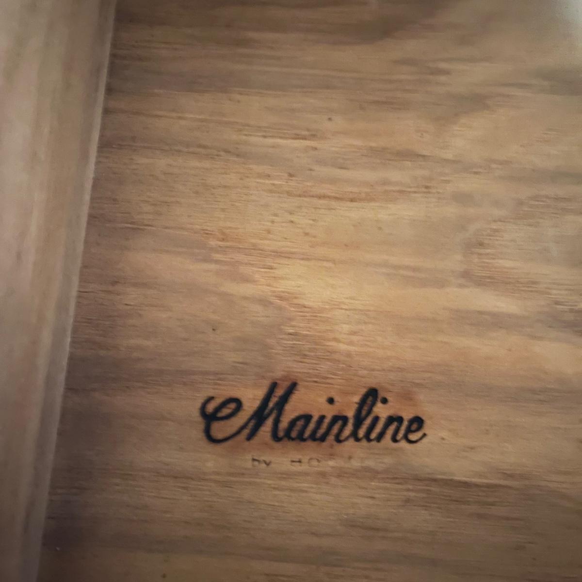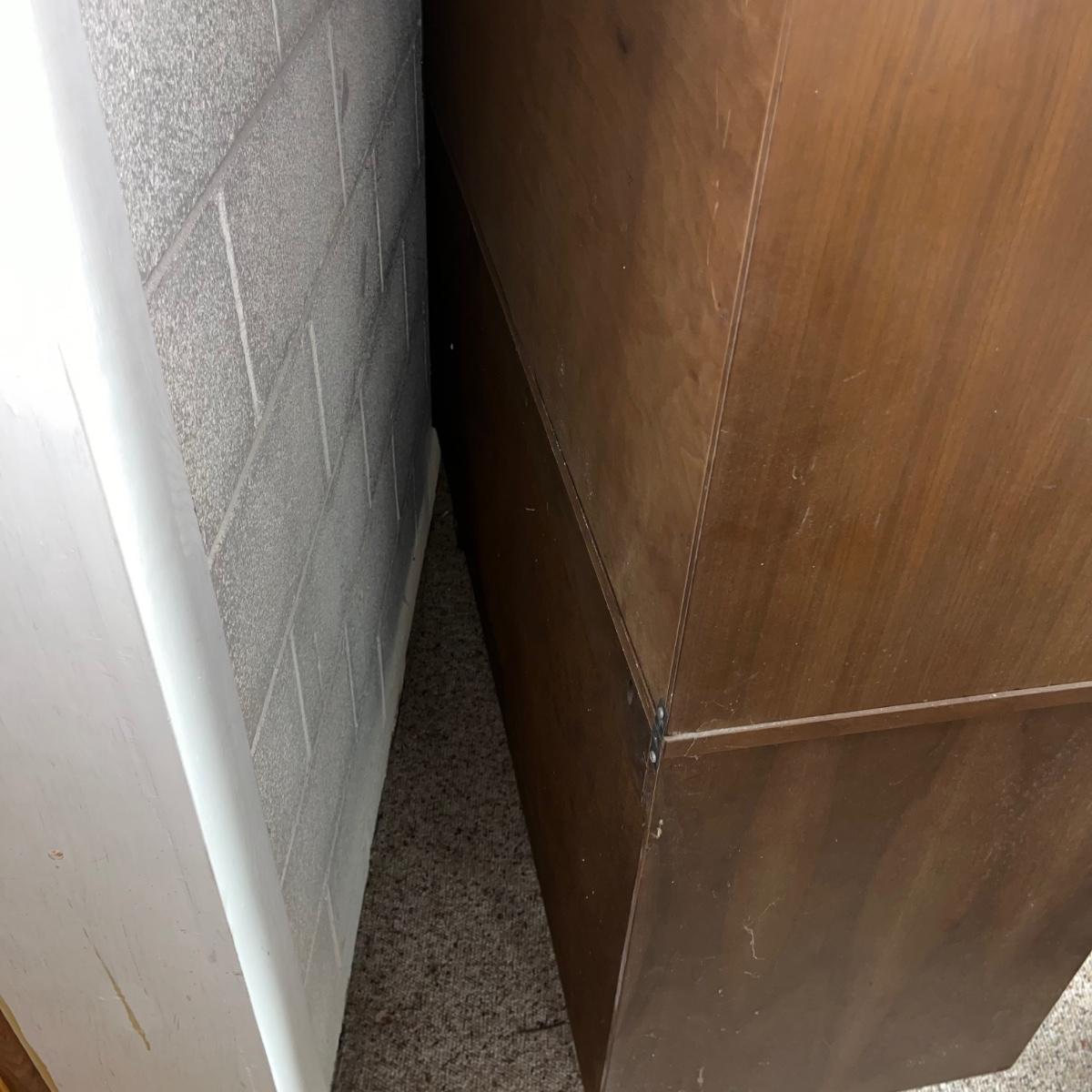 Lot includes a Mainline by Hooker MCM China cabinet with sliding glass doors on the top and three drawers and five dovetailed drawers and two door cabinet on the bottom. Item appears to be in two pieces with a bracket on each side, see pictures. Bottom piece measures 19” x 54” x 33” and top piece measures 14” x 54” x 39”.