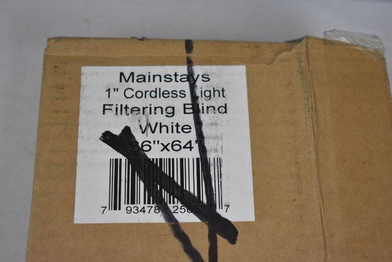 Mainstays 1" Cordless Light Filtering Blinds, White, 36" x 64" Damaged, missing hardware