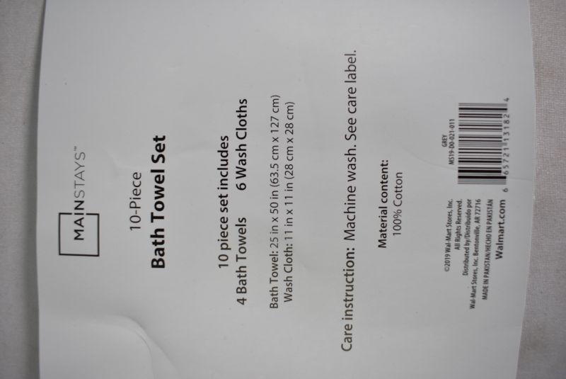 Mainstays 10 Piece Best Value Bath Towel Set - Includes 4 Bath Towels & 6 Washcloths, Grey - New