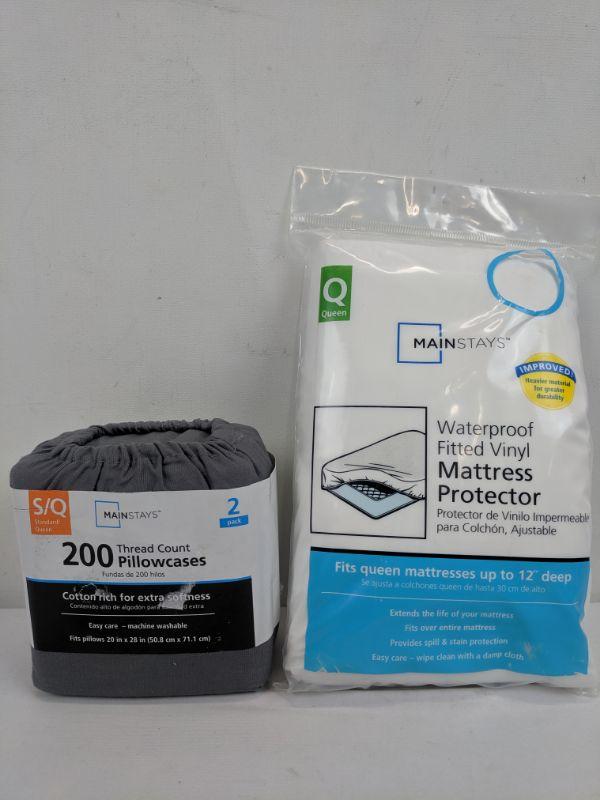 Mainstays 200 Thread Count Gray Pillow Cases 2 Pack, Standard & Mainstays Waterproof Fitted Mattress Protector, Queen - New