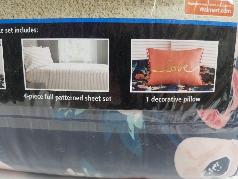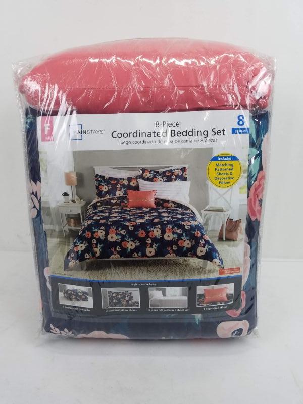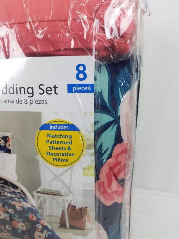 Mainstays 8 piece Coordinated Bed Set, Full Size, Navy/Pink "Garden Floral" - New