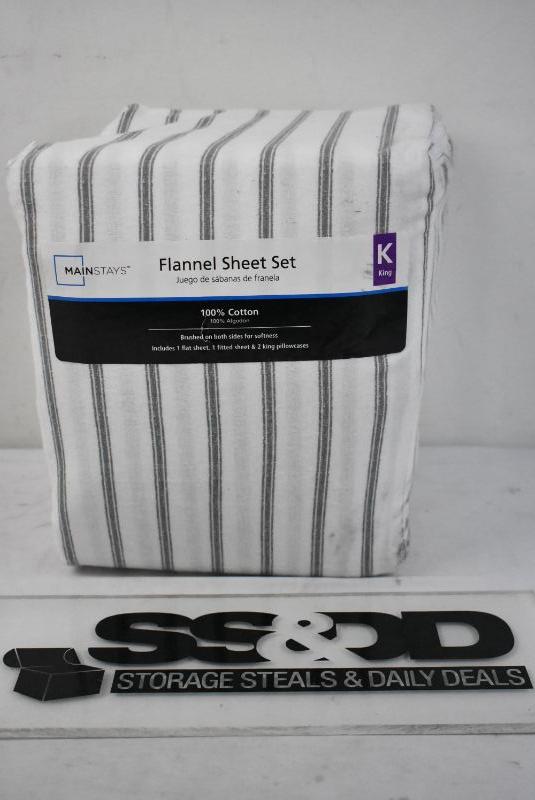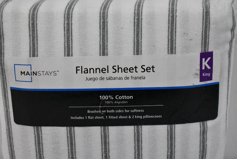 Mainstays Flannel Sheet Set, King Size, 100% Cotton White w/ Gray Stripes - New