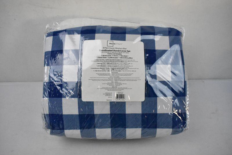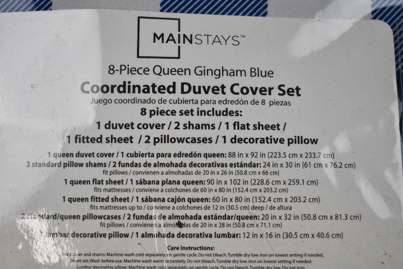 Mainstays Gingham Blue Duvet Cover and Sheet Set with Decorative Pillow, Queen Size, 8 Piece Set - New