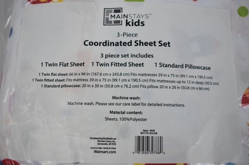 Mainstays Kids 3 pc Coordinated Sheet Set, Twin Size, Rocket Ship Theme - New