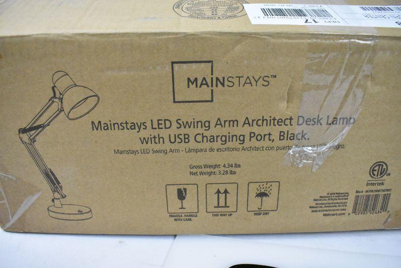 Mainstays LED Swing Arm Architect Desk Lamp with USB Charging Port, Black - New