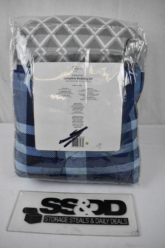 Mainstays Luxe Plaid 8 Piece Bed in a Bag Bedding Comforter Set with BONUS Sheet Set and Throw Pillow, Full, Blue - New