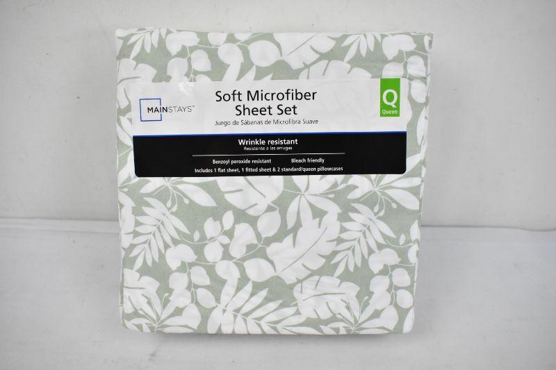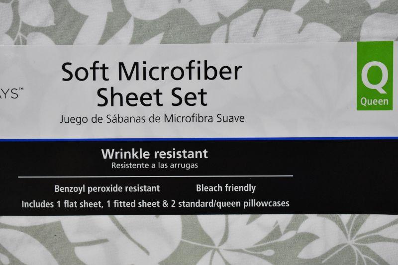 Mainstays Microfiber Sheet Set, Queen Size, Green with White Leaves - New