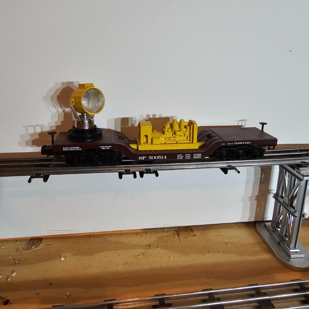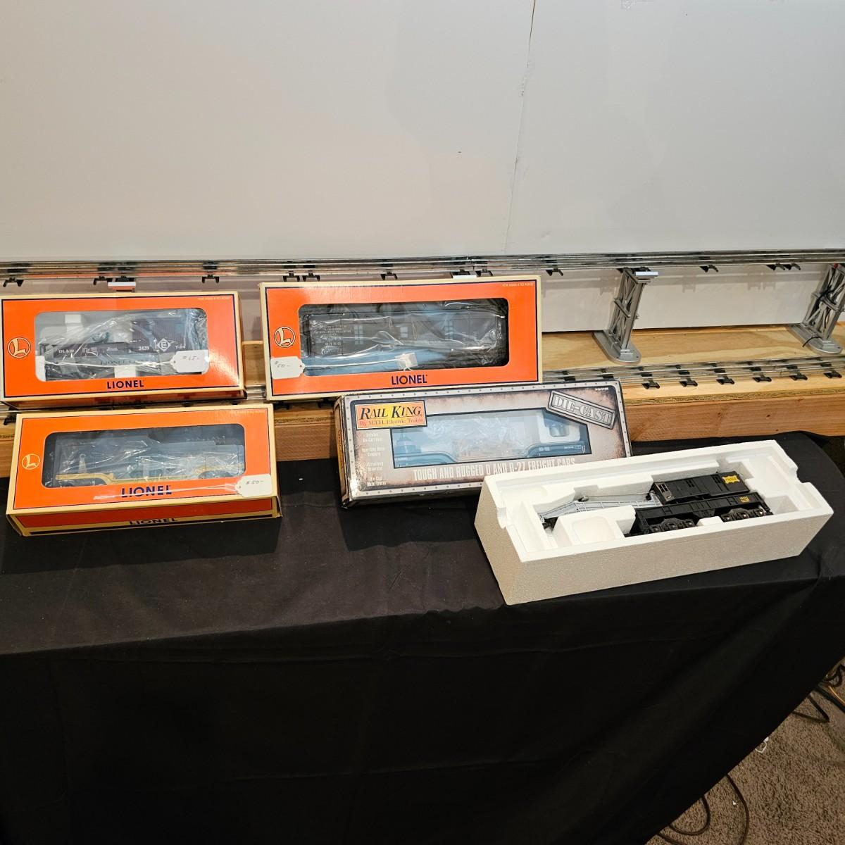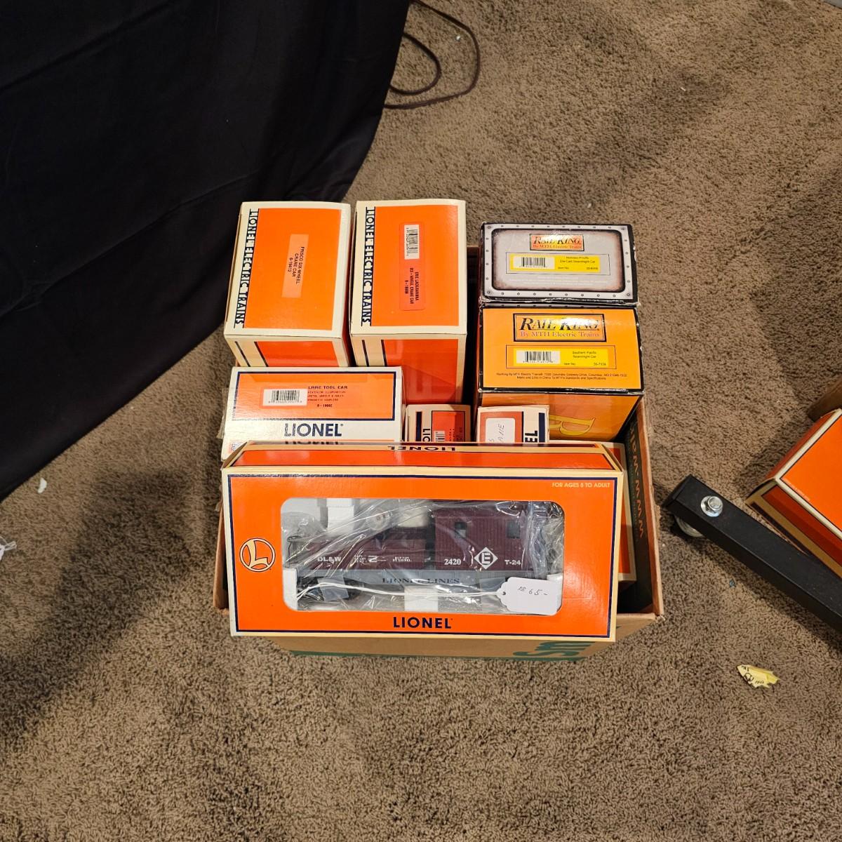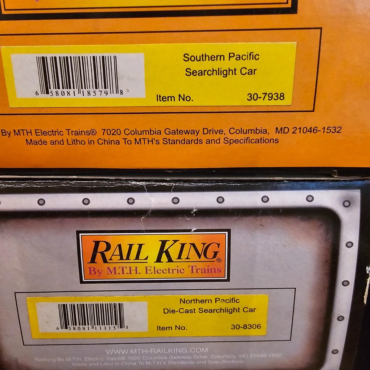 Searchlight cars, cranes, tool cars and more. Several different road names represented, U.P. , Erie, Frisco and others. Many of these cars have lights and one caboose has smoke features. Not all features tested. Original boxes for all items, see photos for details. Shipping available. Please note that any price tag seen on an item was not put there by Sterling Transitions and does not reflect the current value of the item. Any train tracks shown in photos are not included but are available in another lot in this sale.