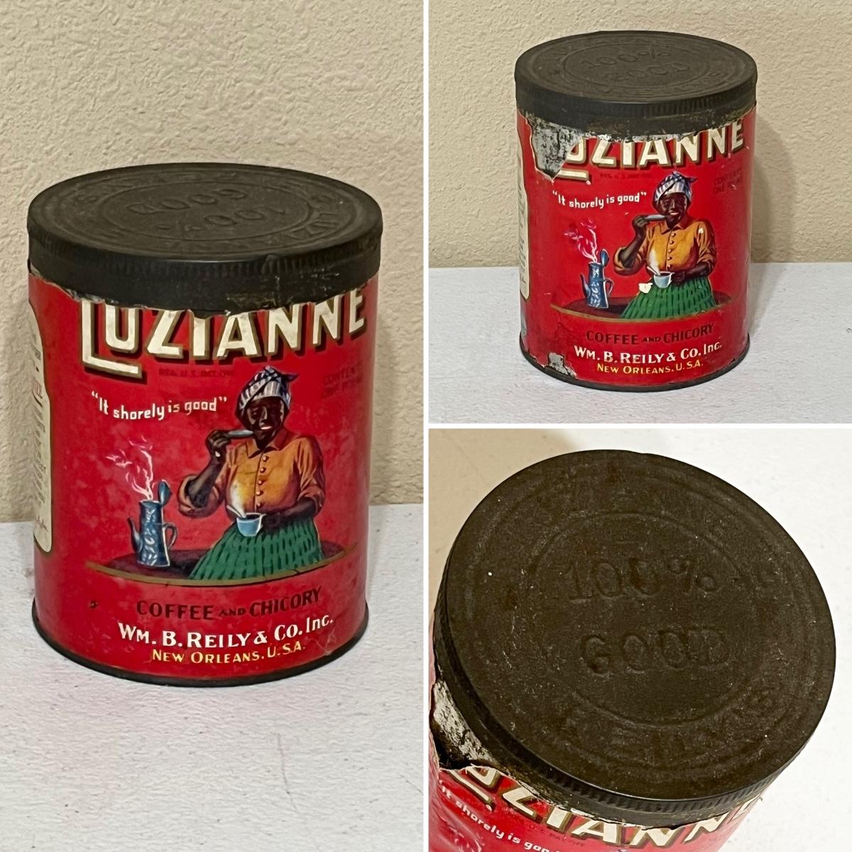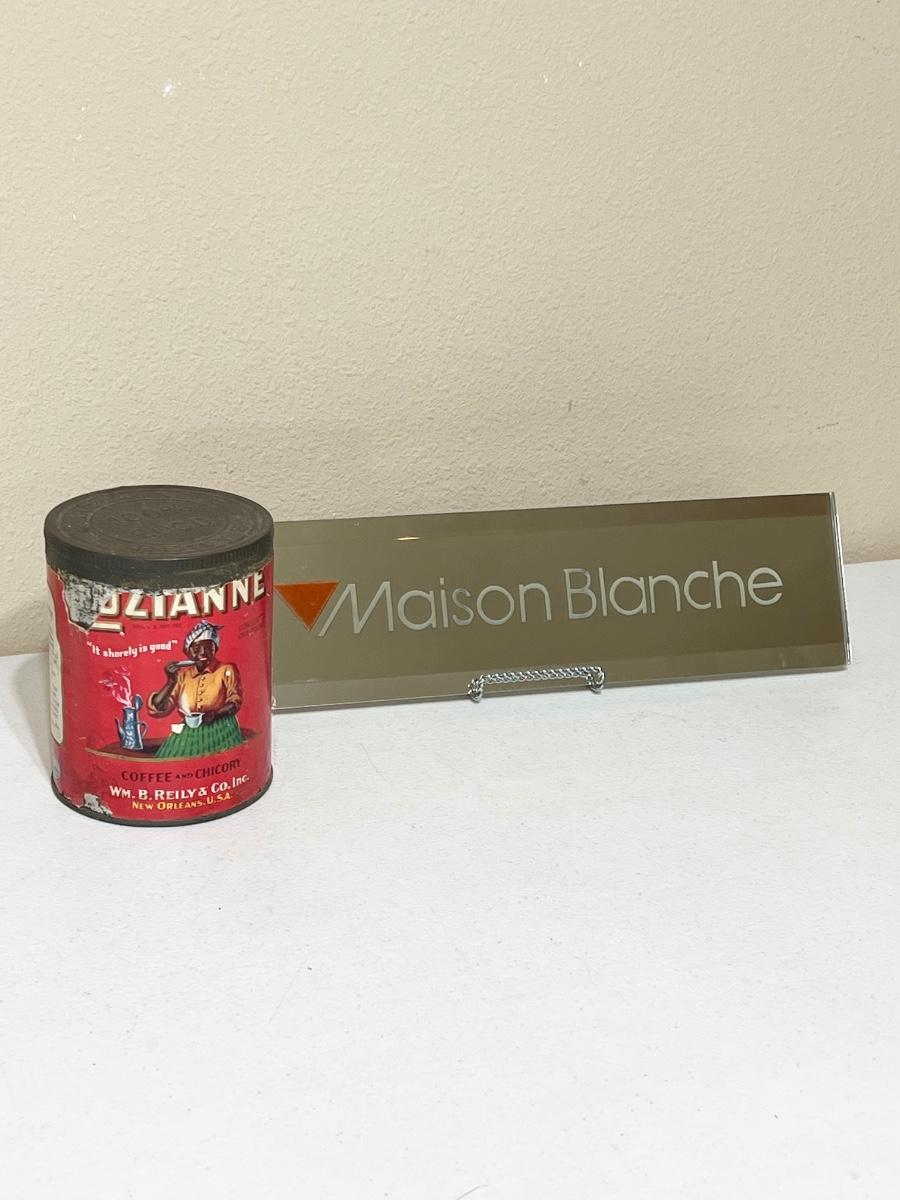 Luzianne metal can = 5.5” H x 4.25” Round ~ Maison Blanche beveled mirrored sign = 4” H x 15” W