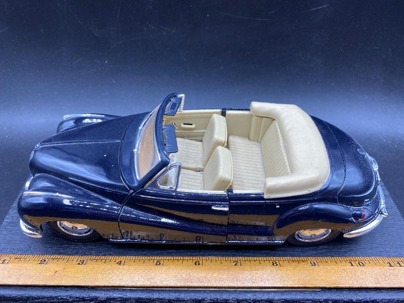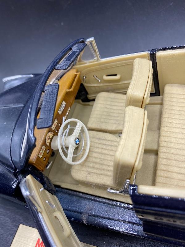 Maisto 1955 BMW 502 car. Scale model, unsure of actual scale. Doors open, wheels move, seats fold forward, and trunk opens. Can easily take off the base by removing two screws. Great for collectors or for kids.