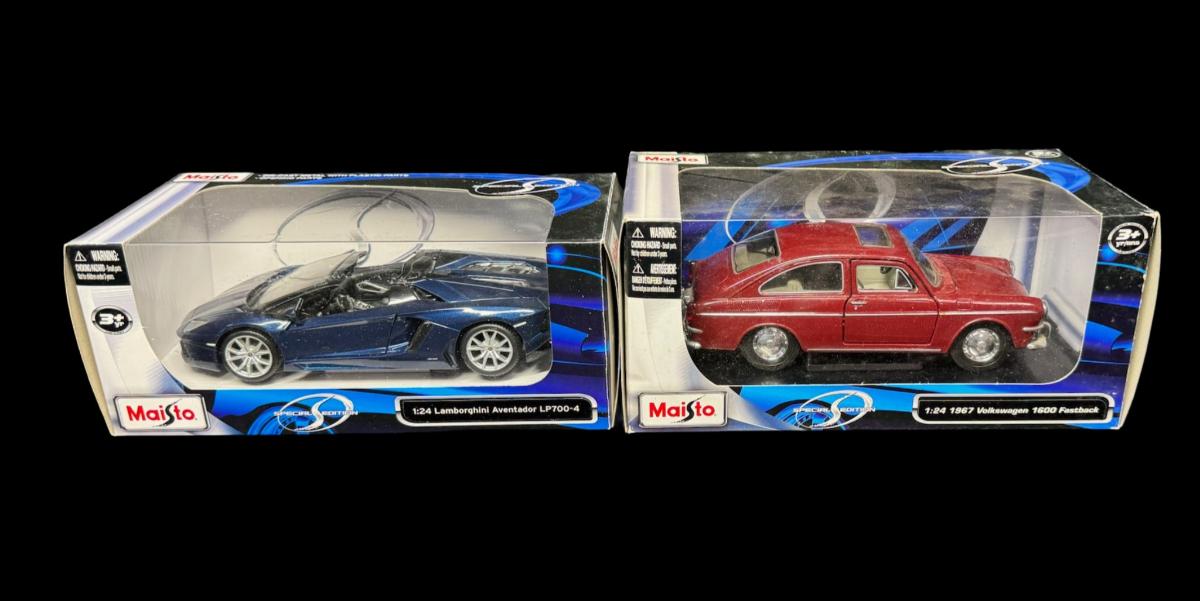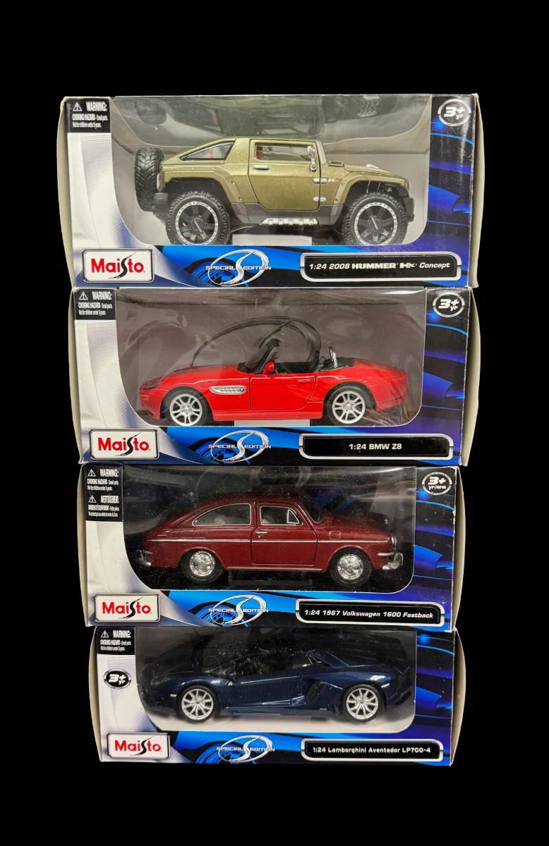 Includes a 1967 Volkswagen 1600 Fastback, a Lamborghini Aventador LP700-4, a BMW Z8, and a 2008 Hummer HX Concept. Total of four pieces, in the original boxes.