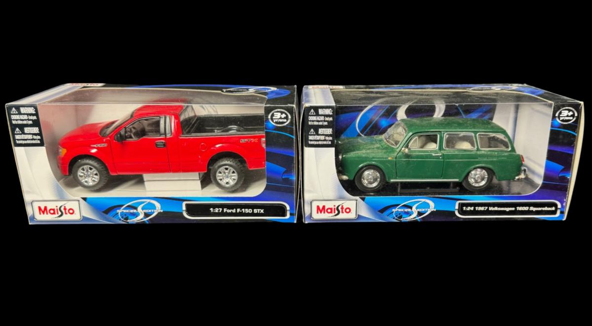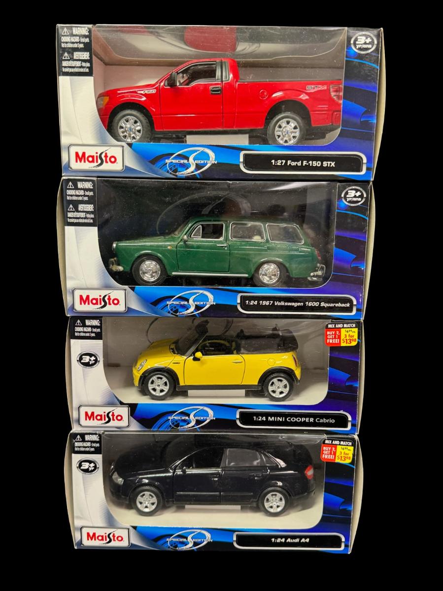 Includes a Ford F-150 STX, a 1967 Volkswagen 1600 Squareback, a Mini Cooper Cabrio, and an Audi A4. Total of four pieces, in the original boxes.