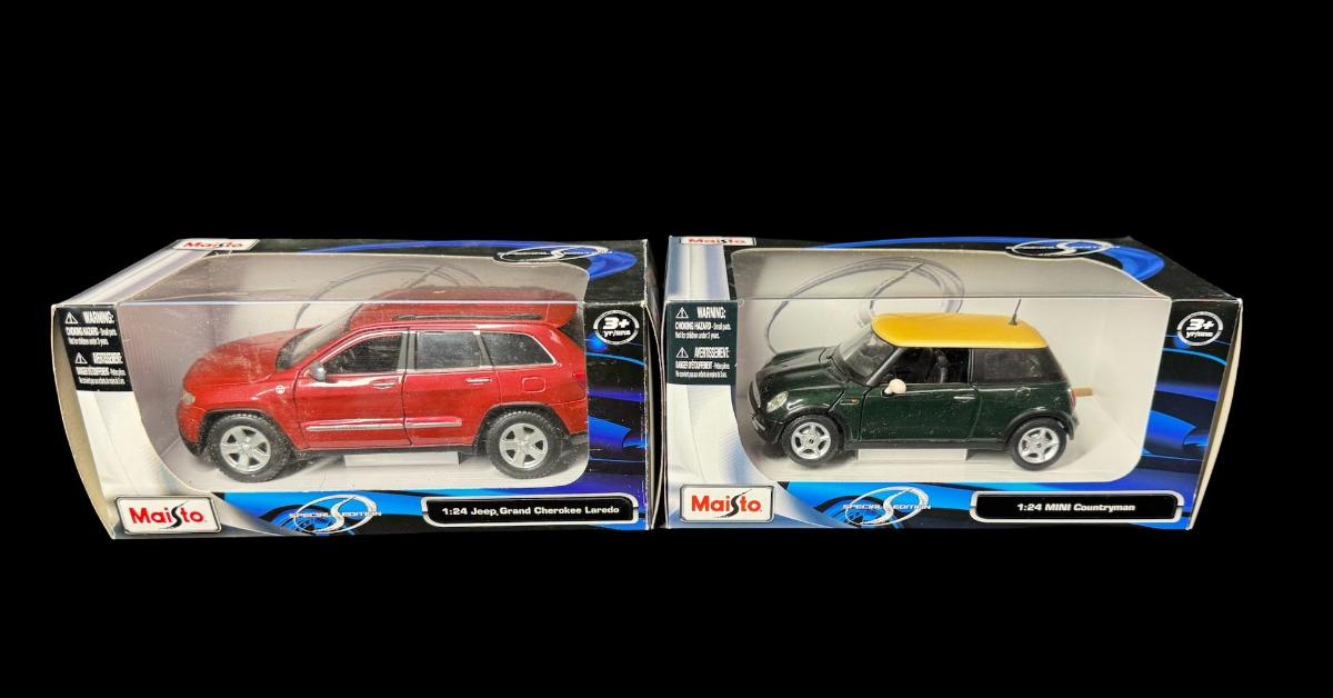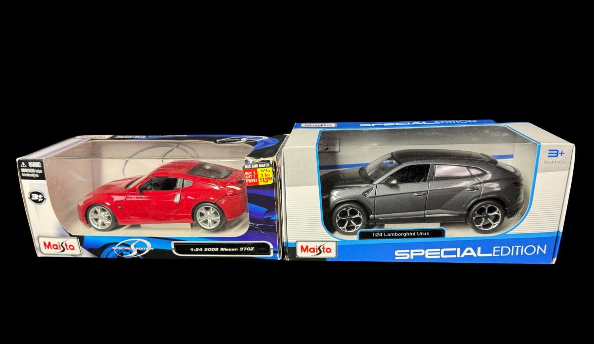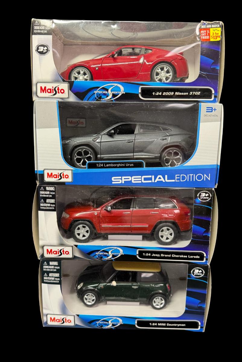 Includes a 2009 Nissan 370-Z, a Lamborghini Urus, a Mini Countryman, and a Jeep Grand Cherokee Laredo. Total of four pieces. In the original boxes.