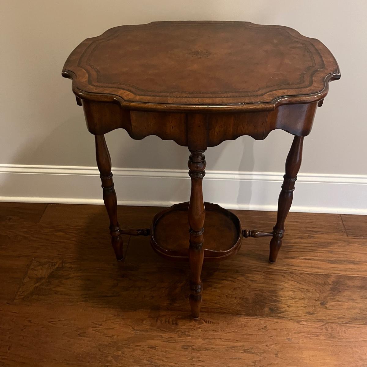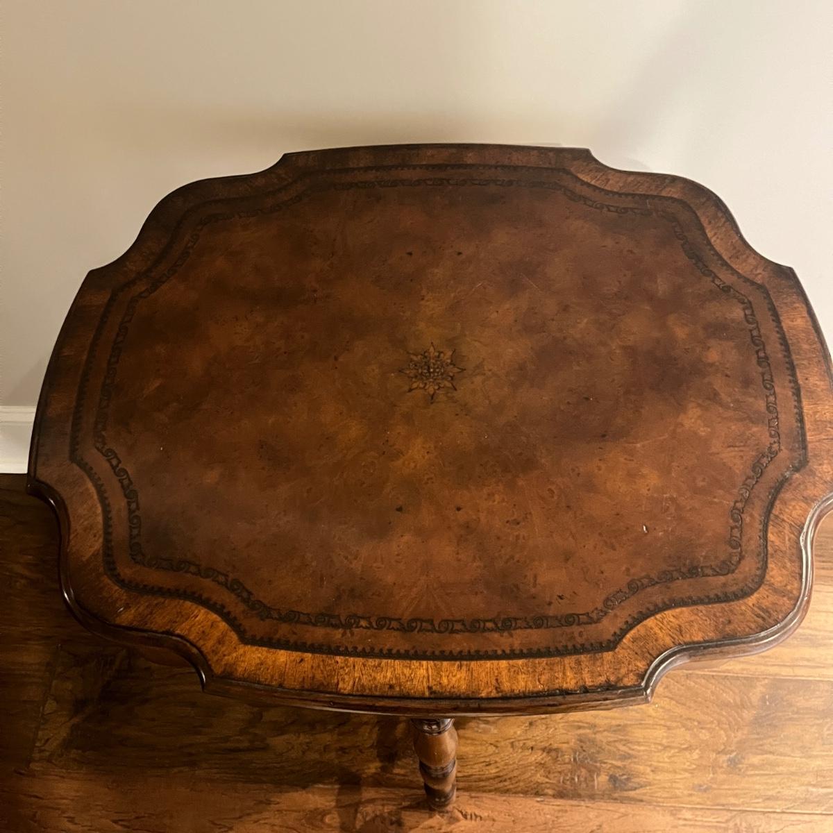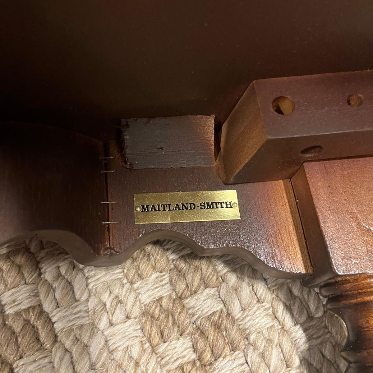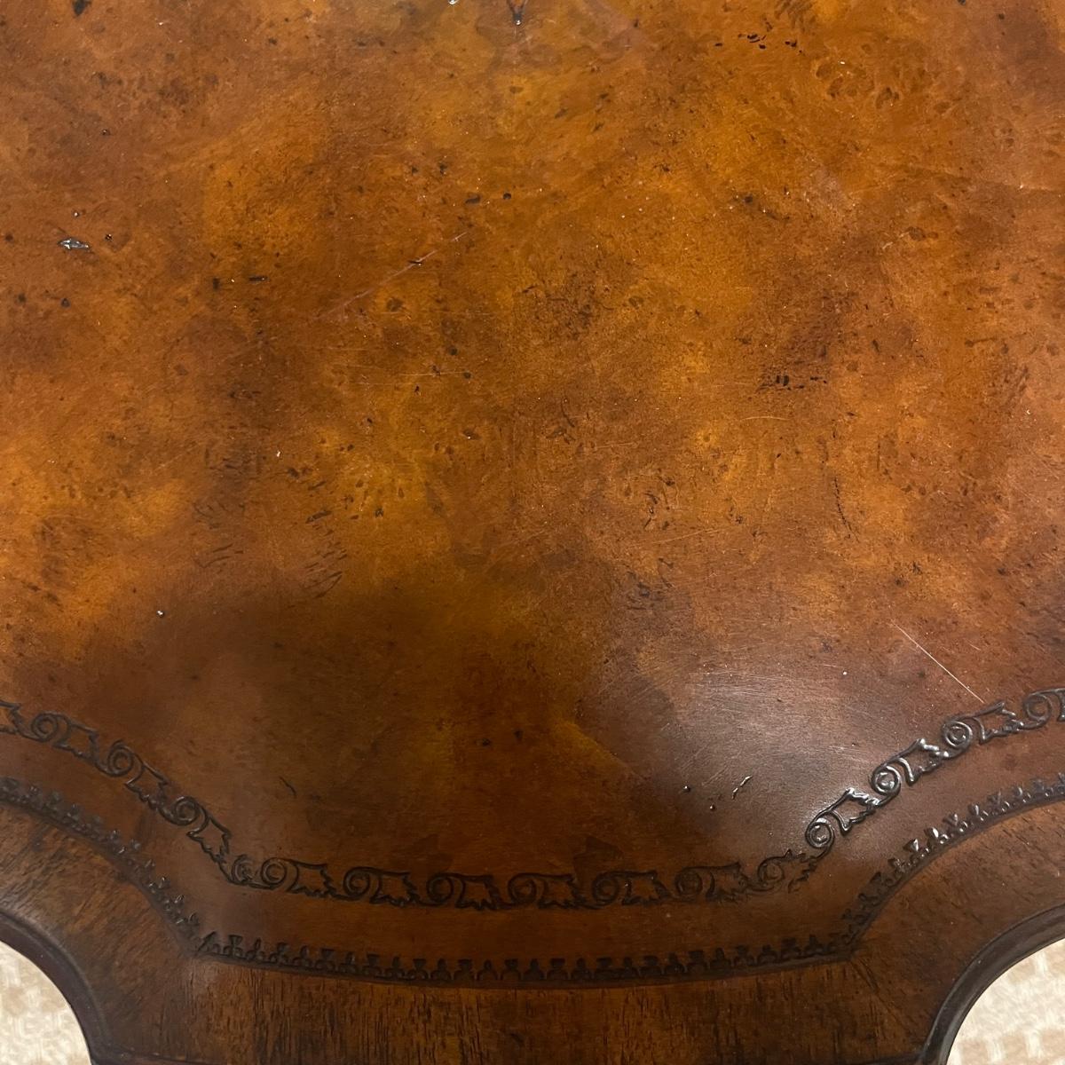 This Maitland Smith occasional table is solid wood, possibly mahogany. It has stamped designs in the middle and around the edge of the burl top. Table has a small shelf underneath.