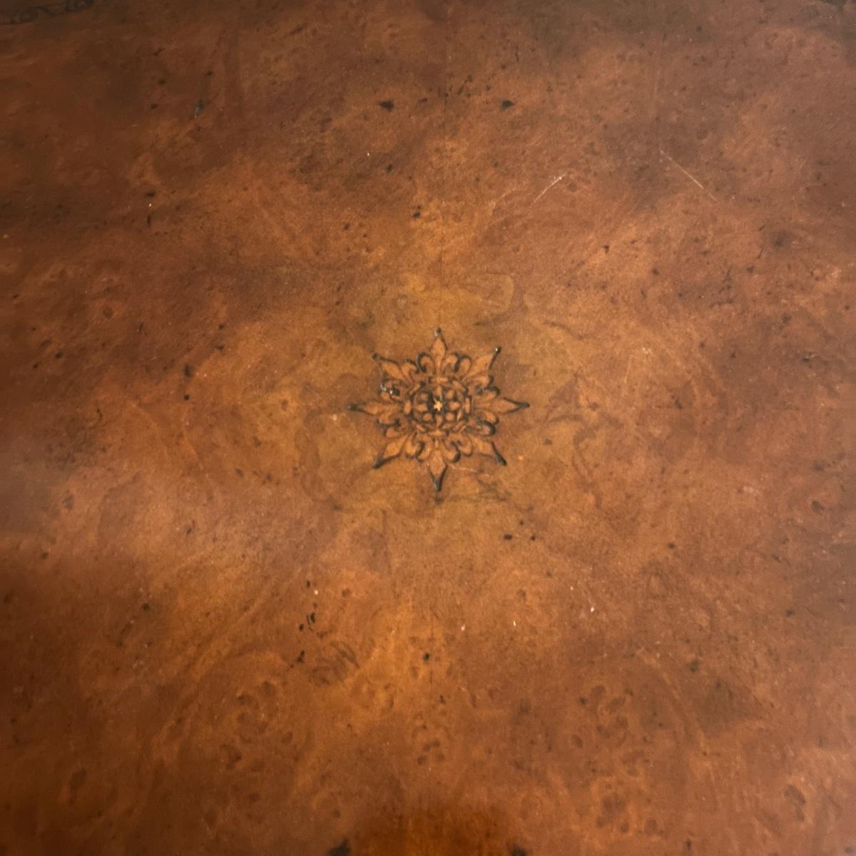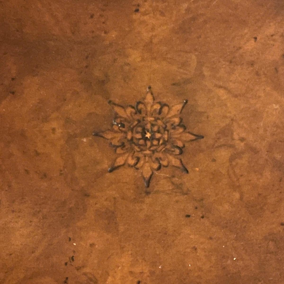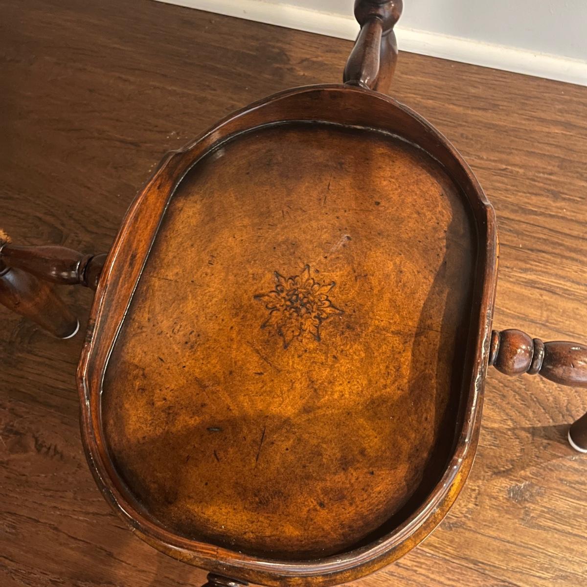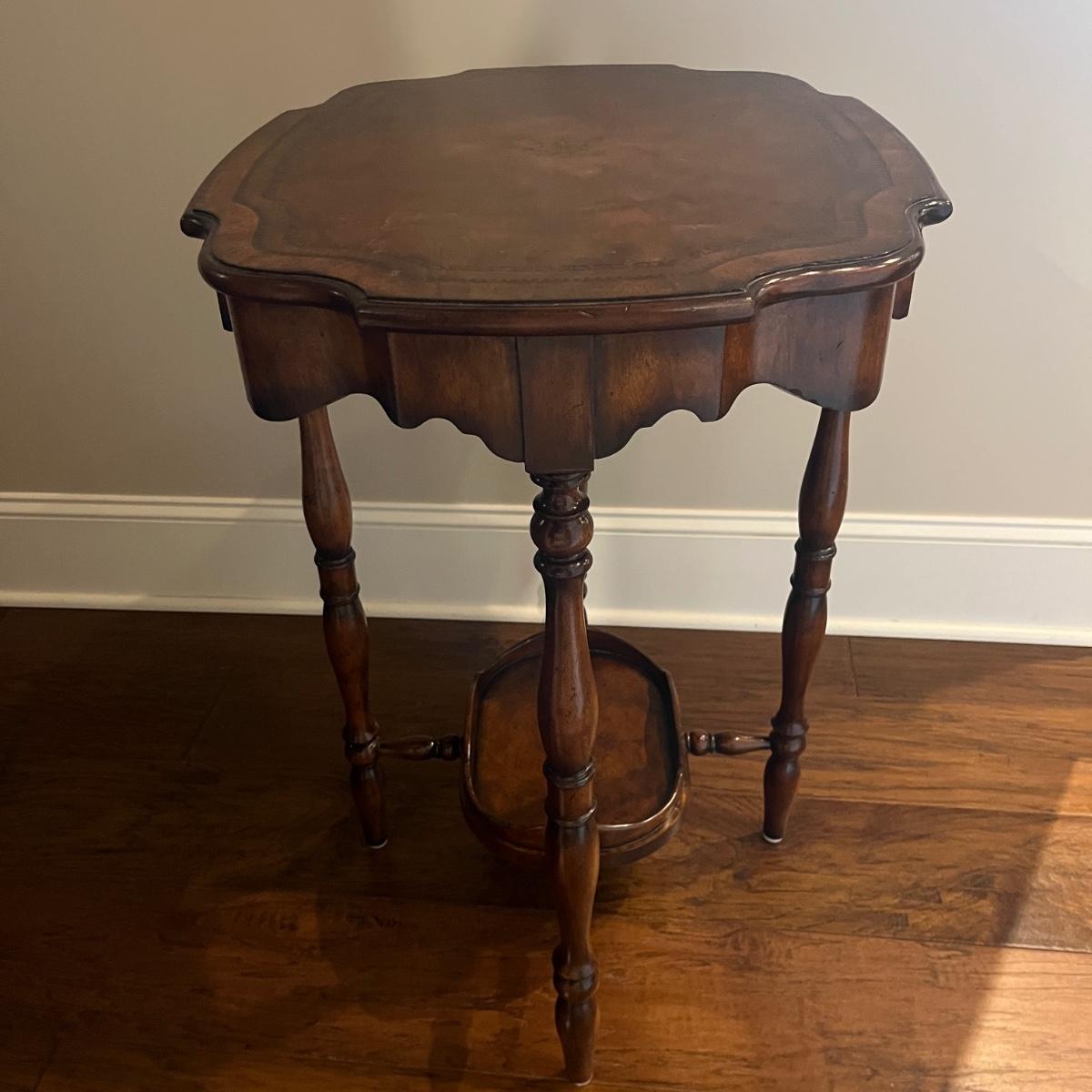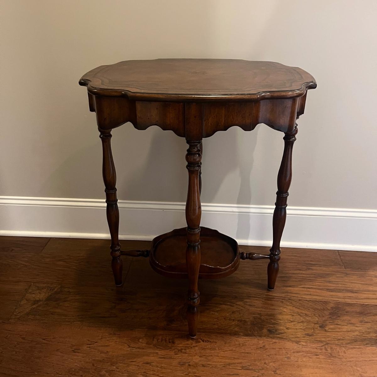 This Maitland Smith occasional table is solid wood, possibly mahogany. It has stamped designs in the middle and around the edge of the burl top. Table has a small shelf underneath.