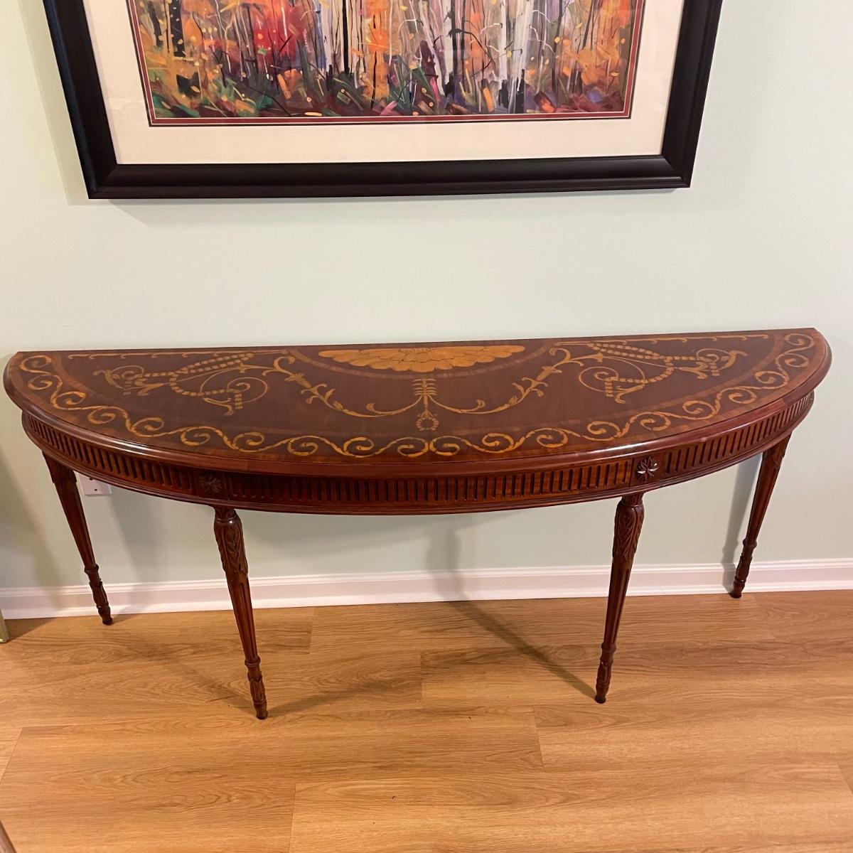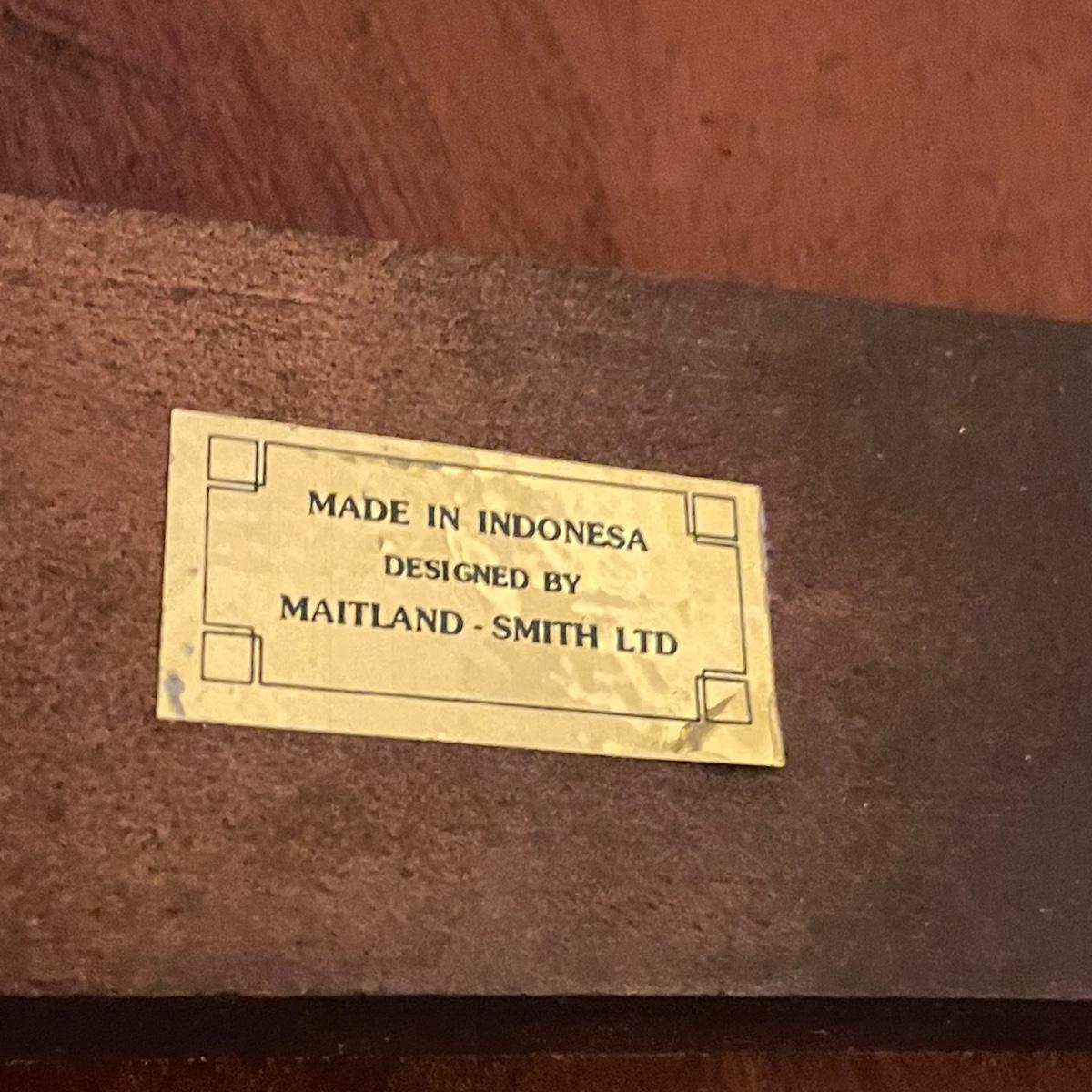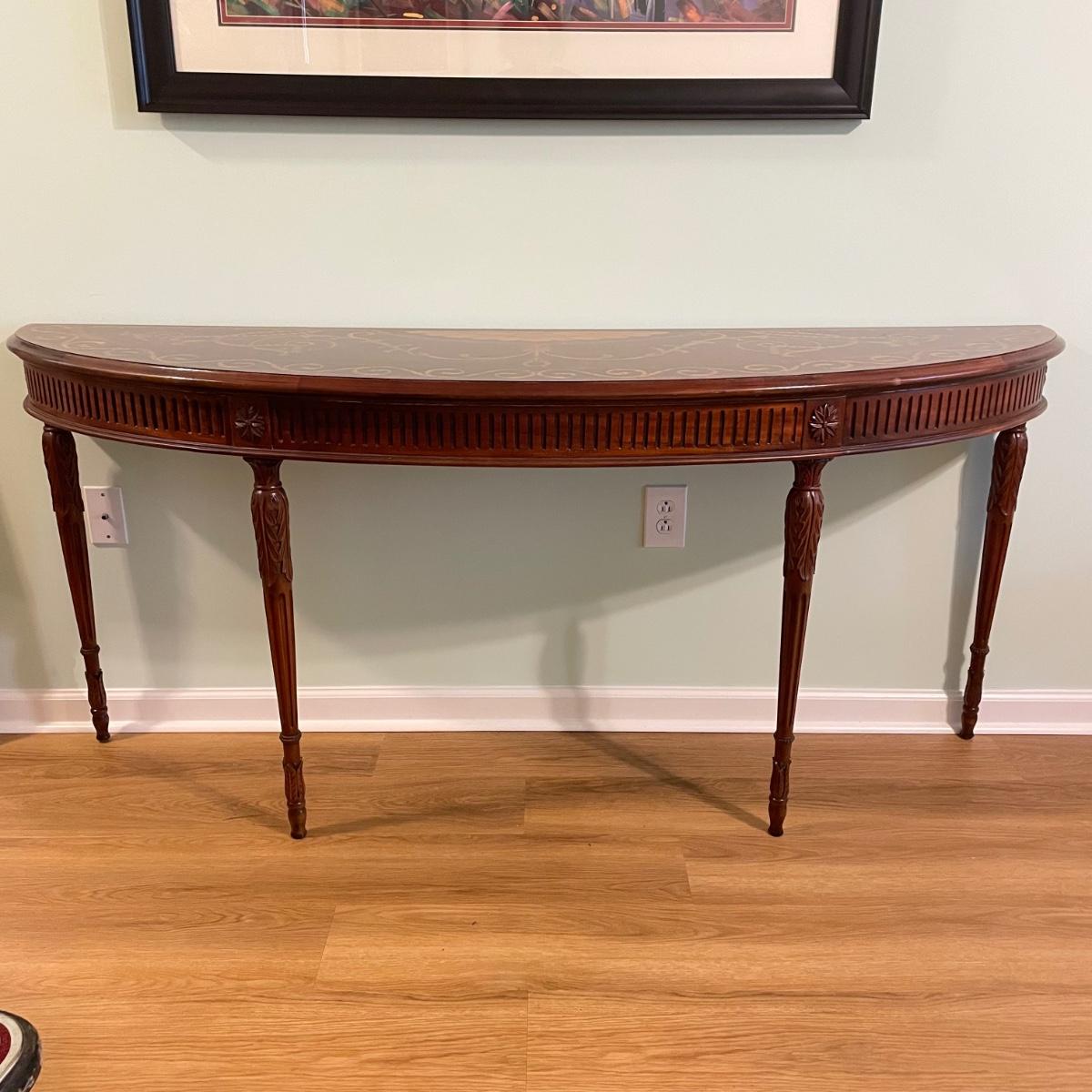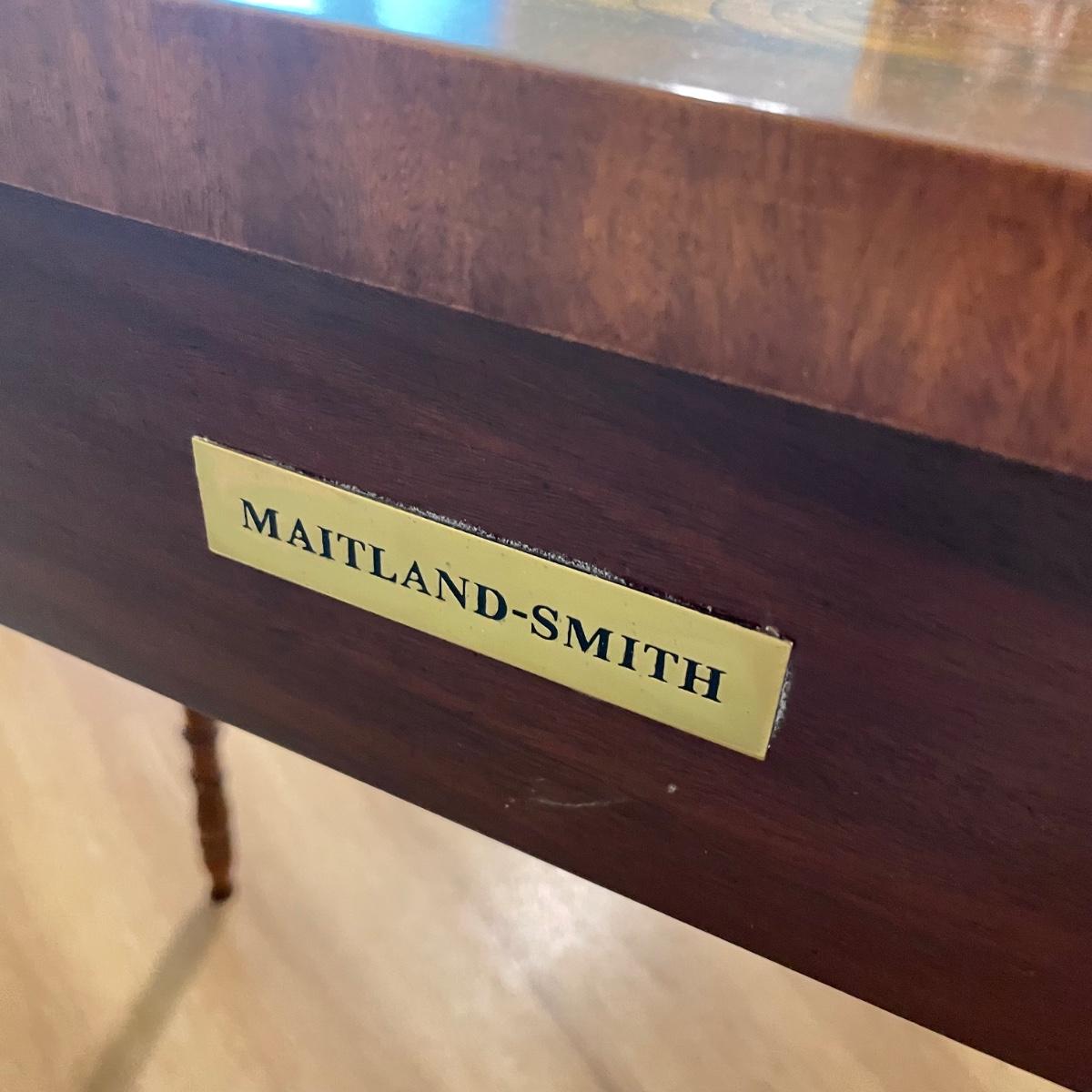 Absolutely stunning console table by Maitland-Smith with intricate inlay. One pretty good gouge on top and chipped overlay on back (see pic). Table measures 71” x 19” x 32”H. Local pick up only. Winning bidder must bring assistance to help move and load this item due to its weight and/or size. Item is located in garage with no steps involved to load.
