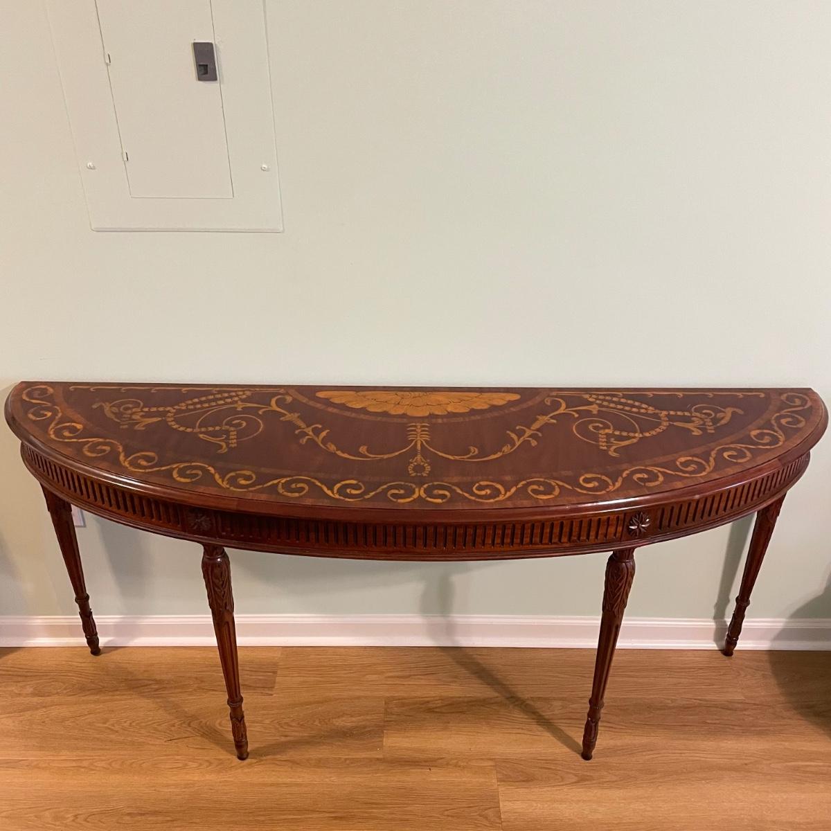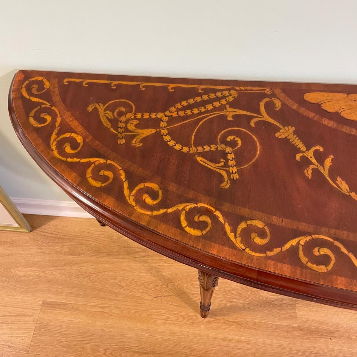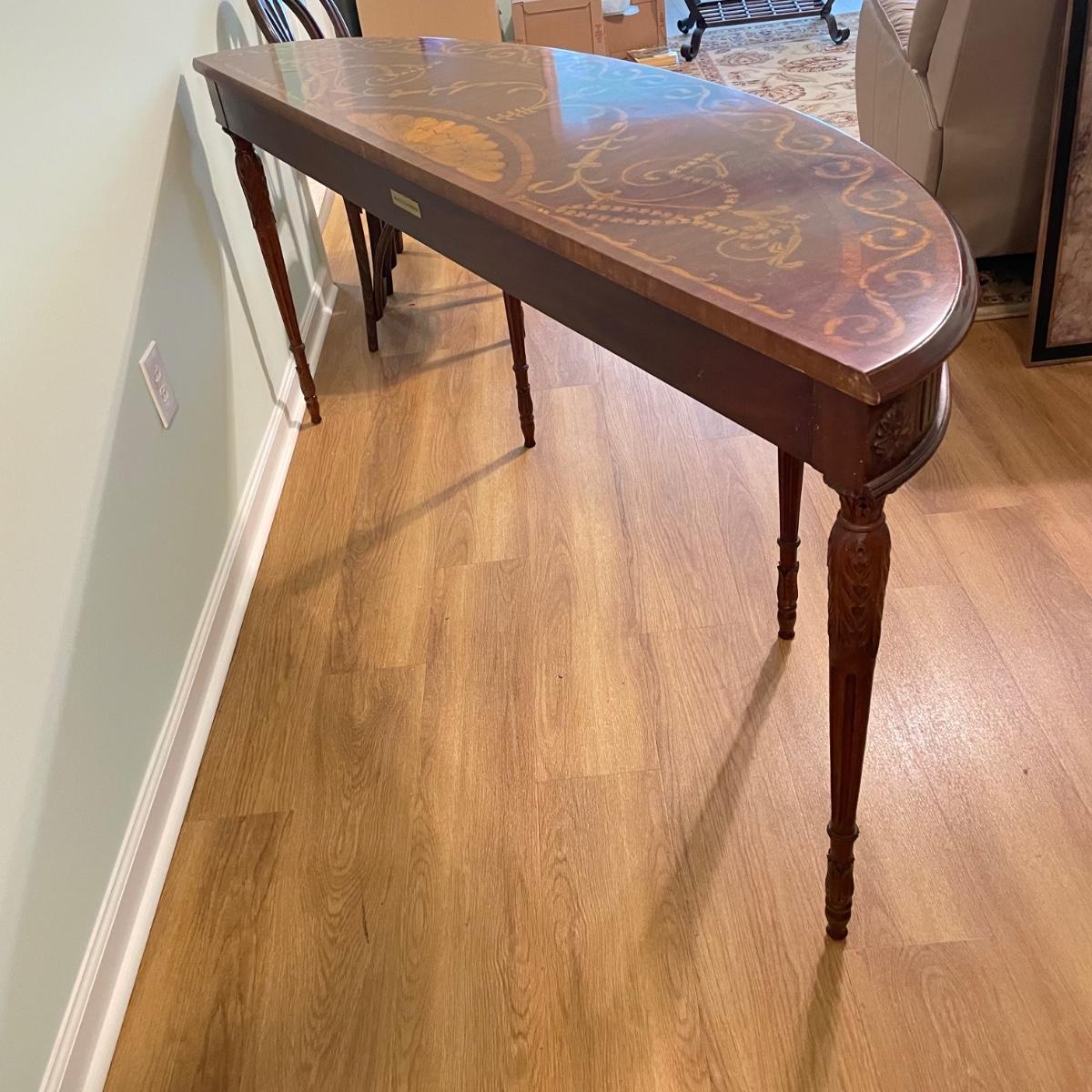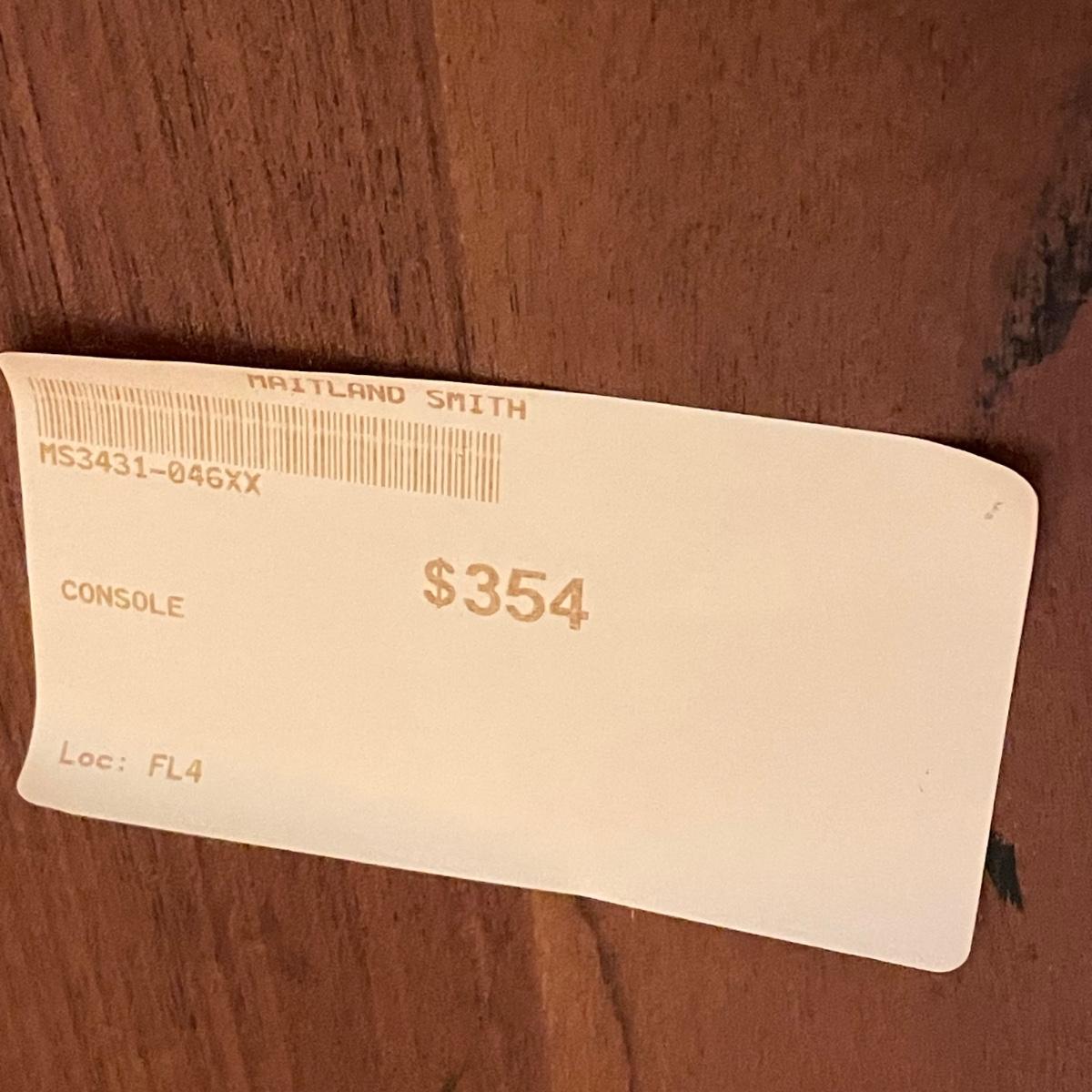 Absolutely stunning console table by Maitland-Smith with intricate inlay. One pretty good gouge on top and chipped overlay on back (see pic). Table measures 71” x 19” x 32”H. Local pick up only. Winning bidder must bring assistance to help move and load this item due to its weight and/or size. Item is located in garage with no steps involved to load.