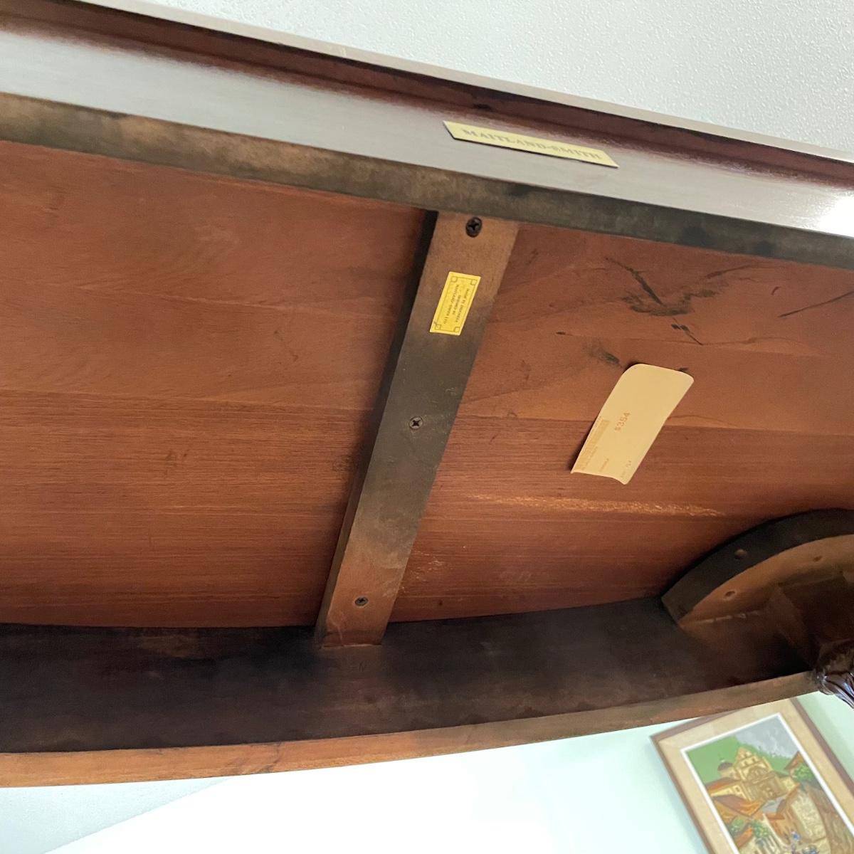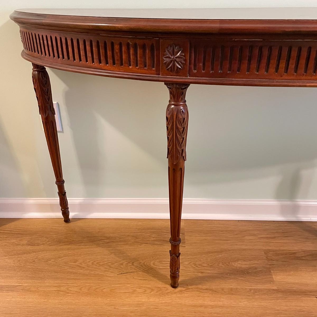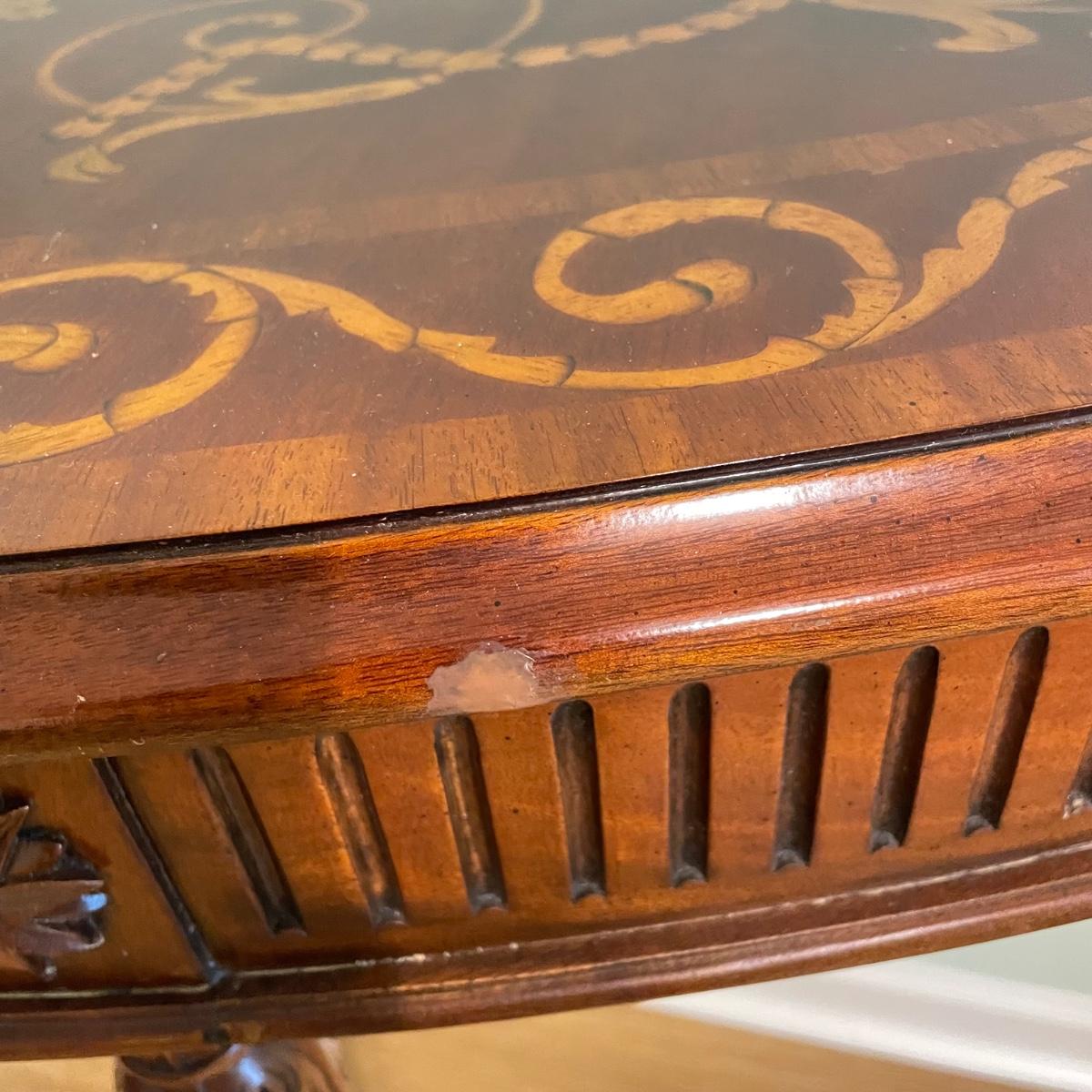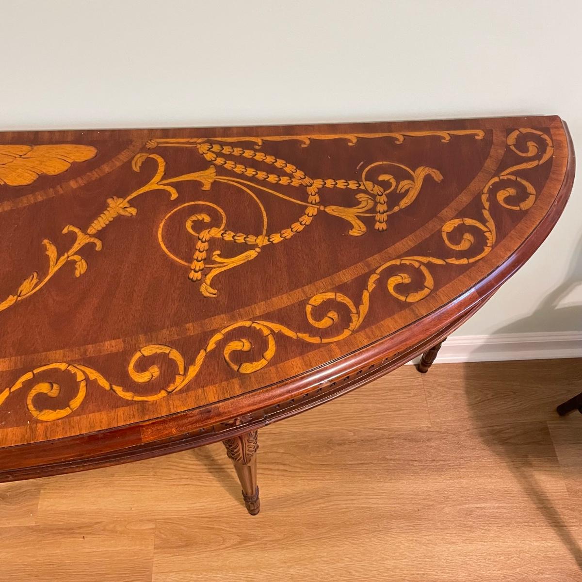 Absolutely stunning console table by Maitland-Smith with intricate inlay. One pretty good gouge on top and chipped overlay on back (see pic). Table measures 71” x 19” x 32”H. Local pick up only. Winning bidder must bring assistance to help move and load this item due to its weight and/or size. Item is located in garage with no steps involved to load.