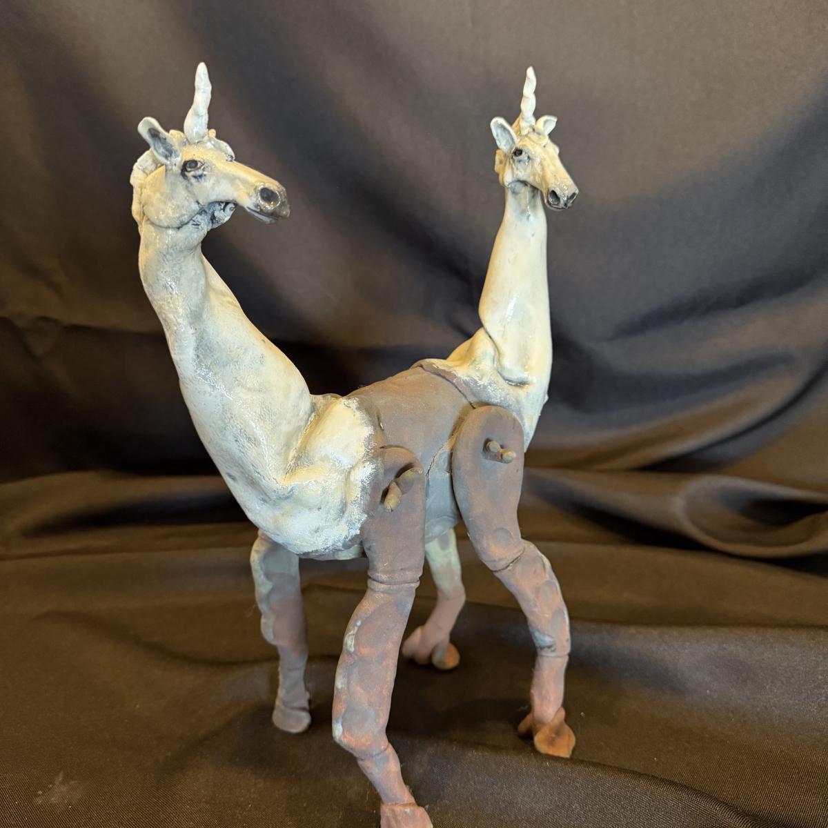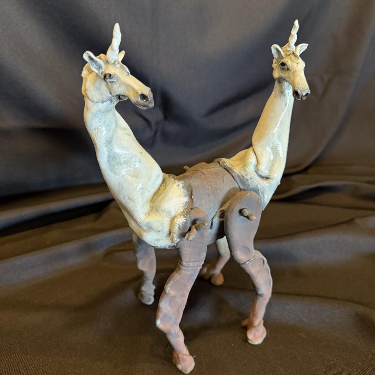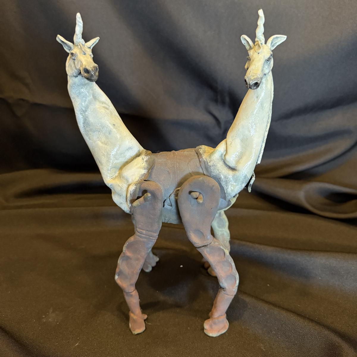 This lot contains a fascinating and funky sculpture of a double headed unicorn connected to a shared body with four legs. This funky piece appears to be made of ceramic with only the heads and necks glazed. It measures 7” x 3.5” x 12.5”H. The artist of this majestic creature is unknown.