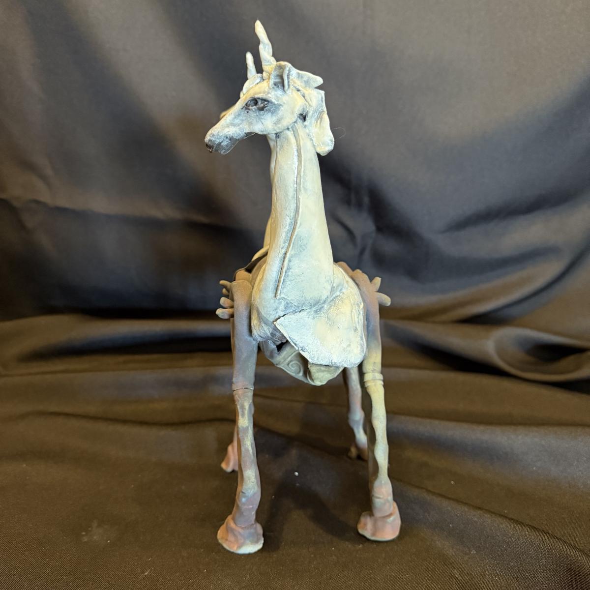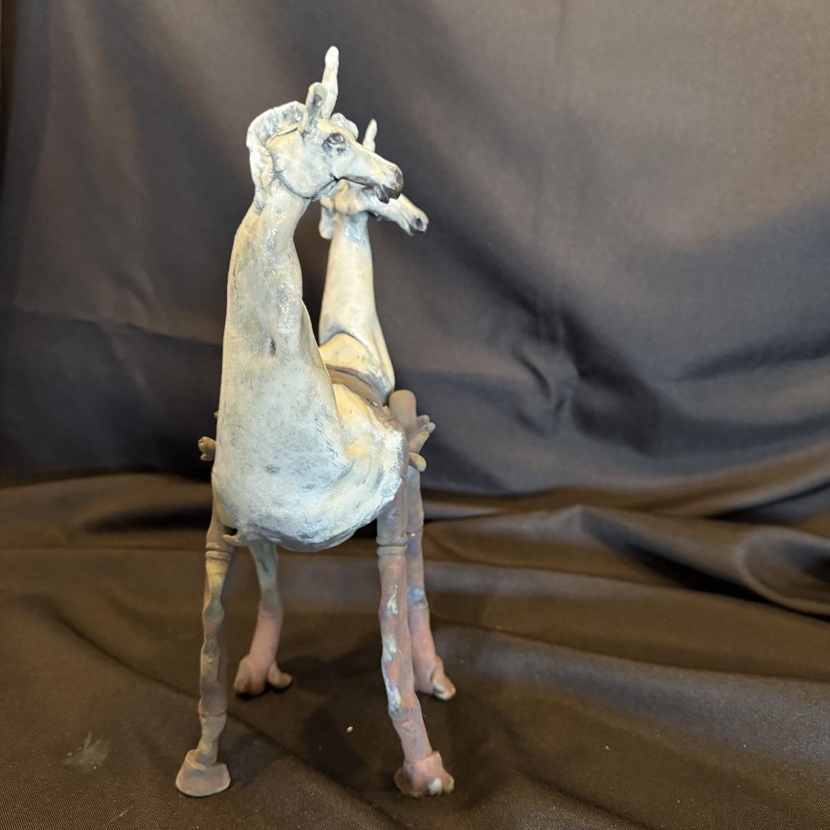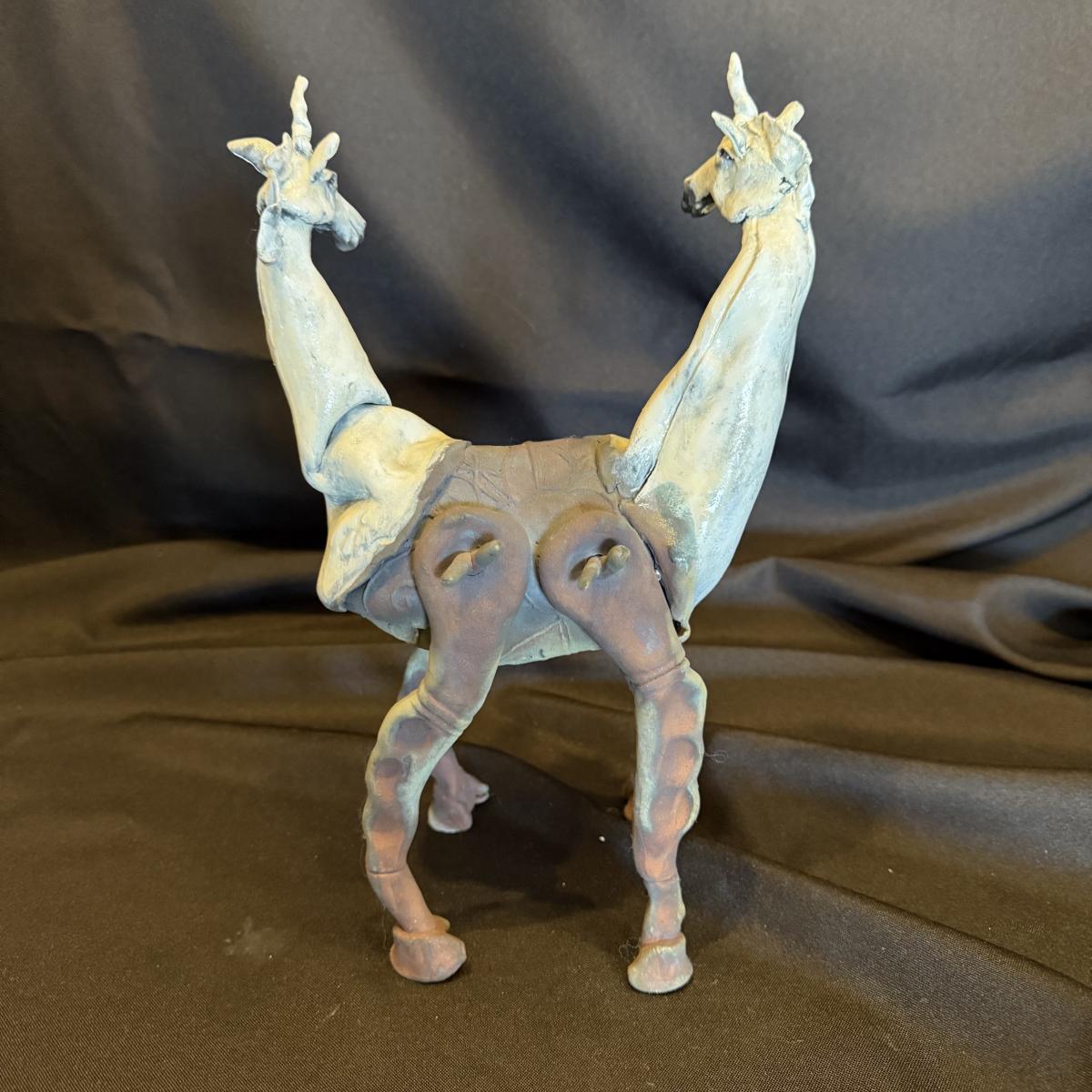 This lot contains a fascinating and funky sculpture of a double headed unicorn connected to a shared body with four legs. This funky piece appears to be made of ceramic with only the heads and necks glazed. It measures 7” x 3.5” x 12.5”H. The artist of this majestic creature is unknown.