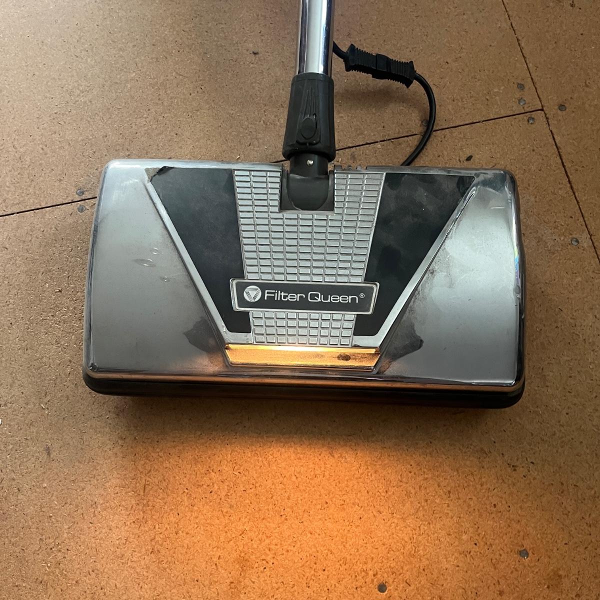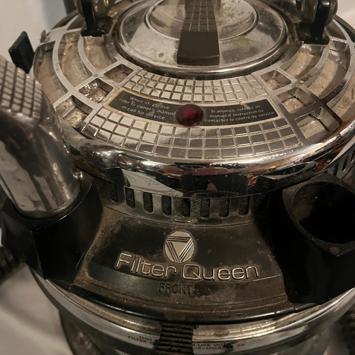 Lot includes a Majestic Filter Queen canister vacuum with onboard attachments. Vacuum powered on when plugged in. Vacuum measures 12”D x 28”.